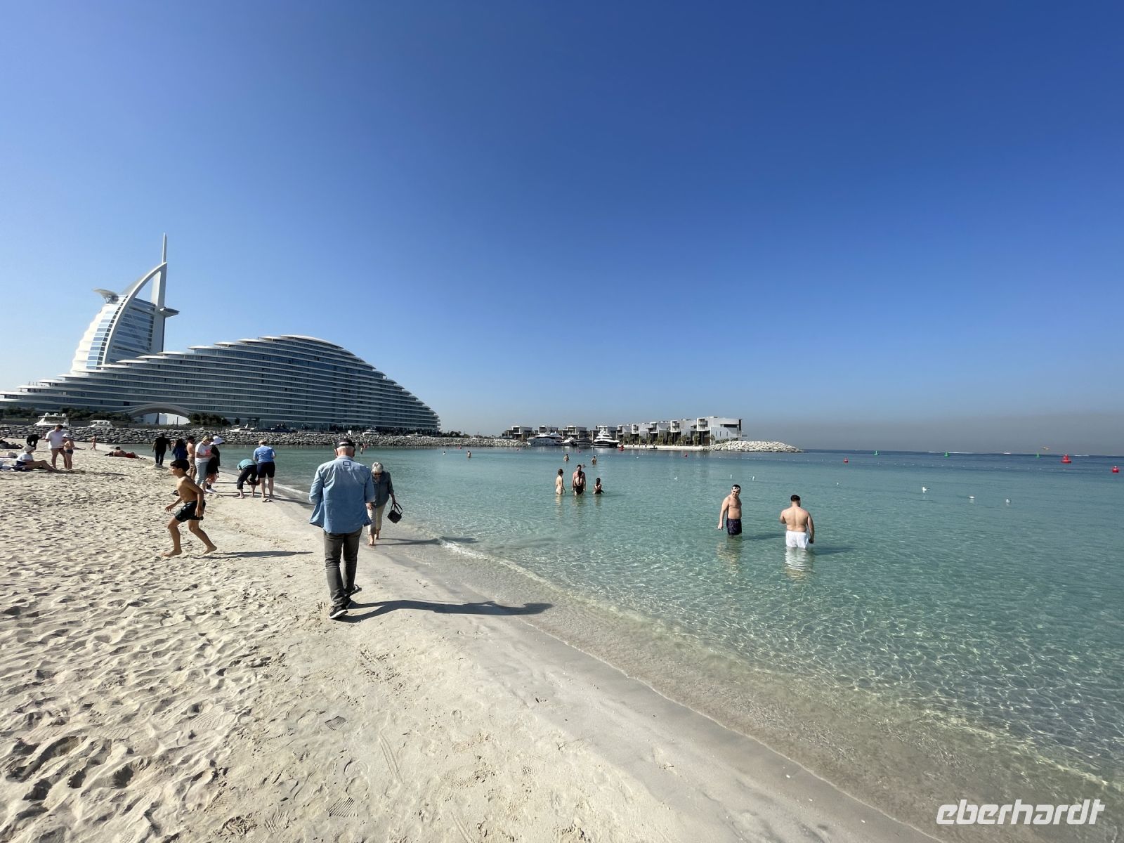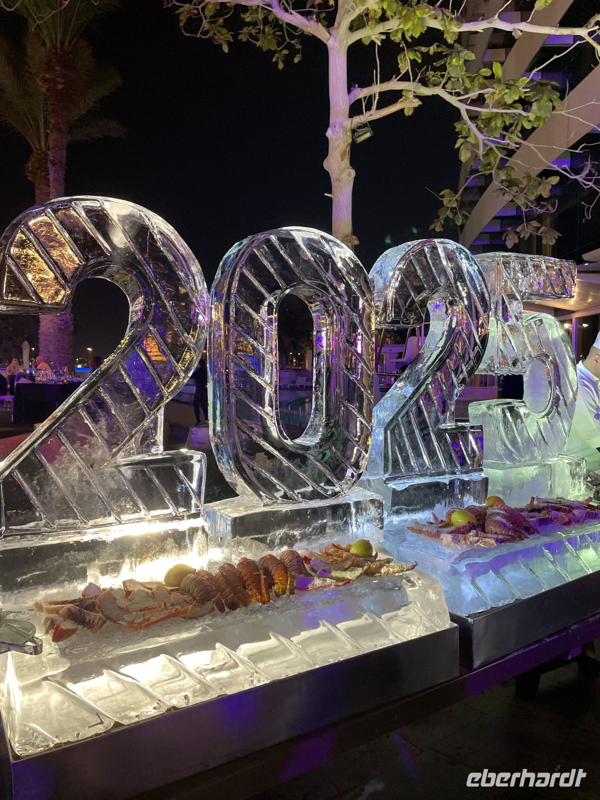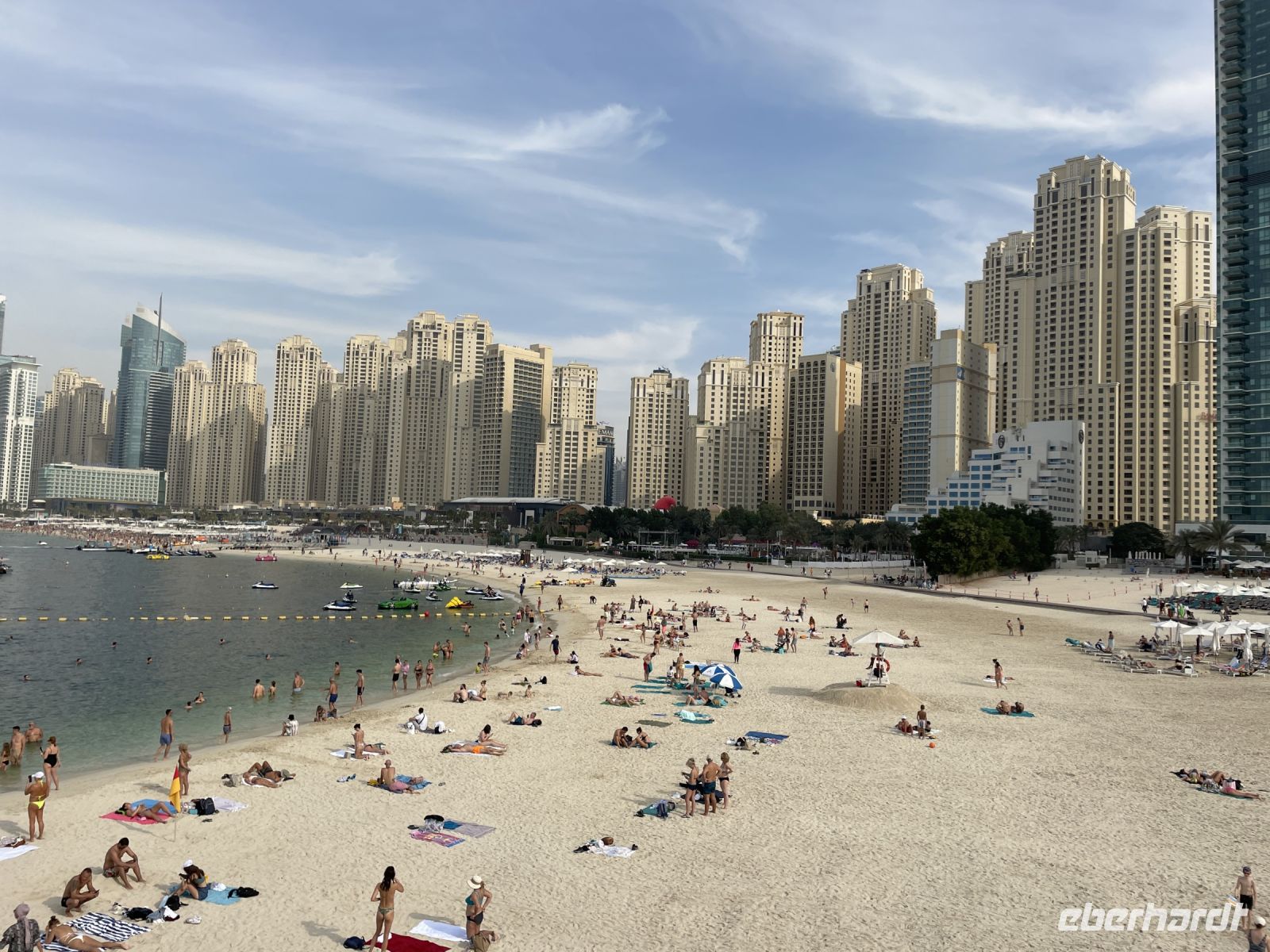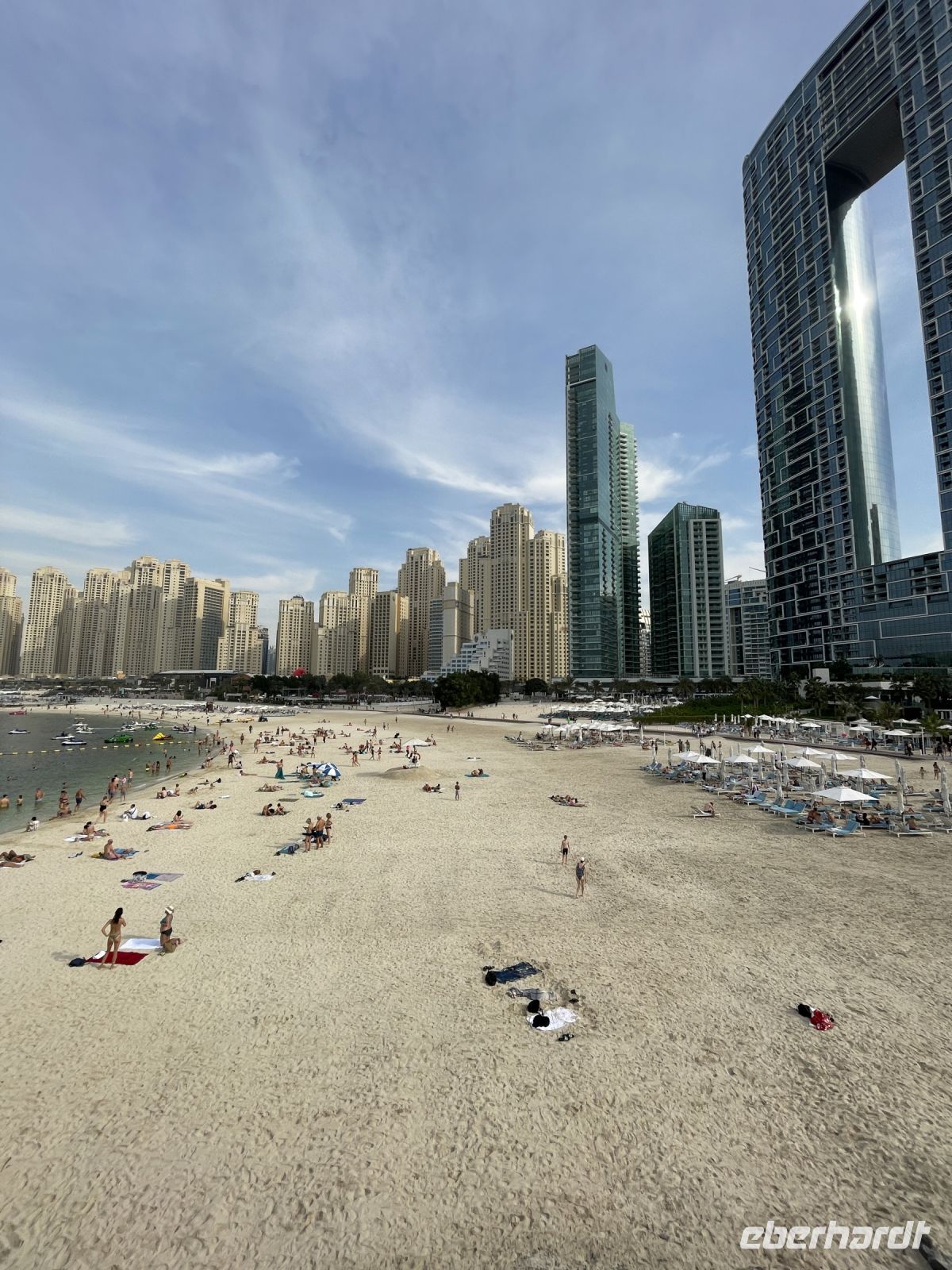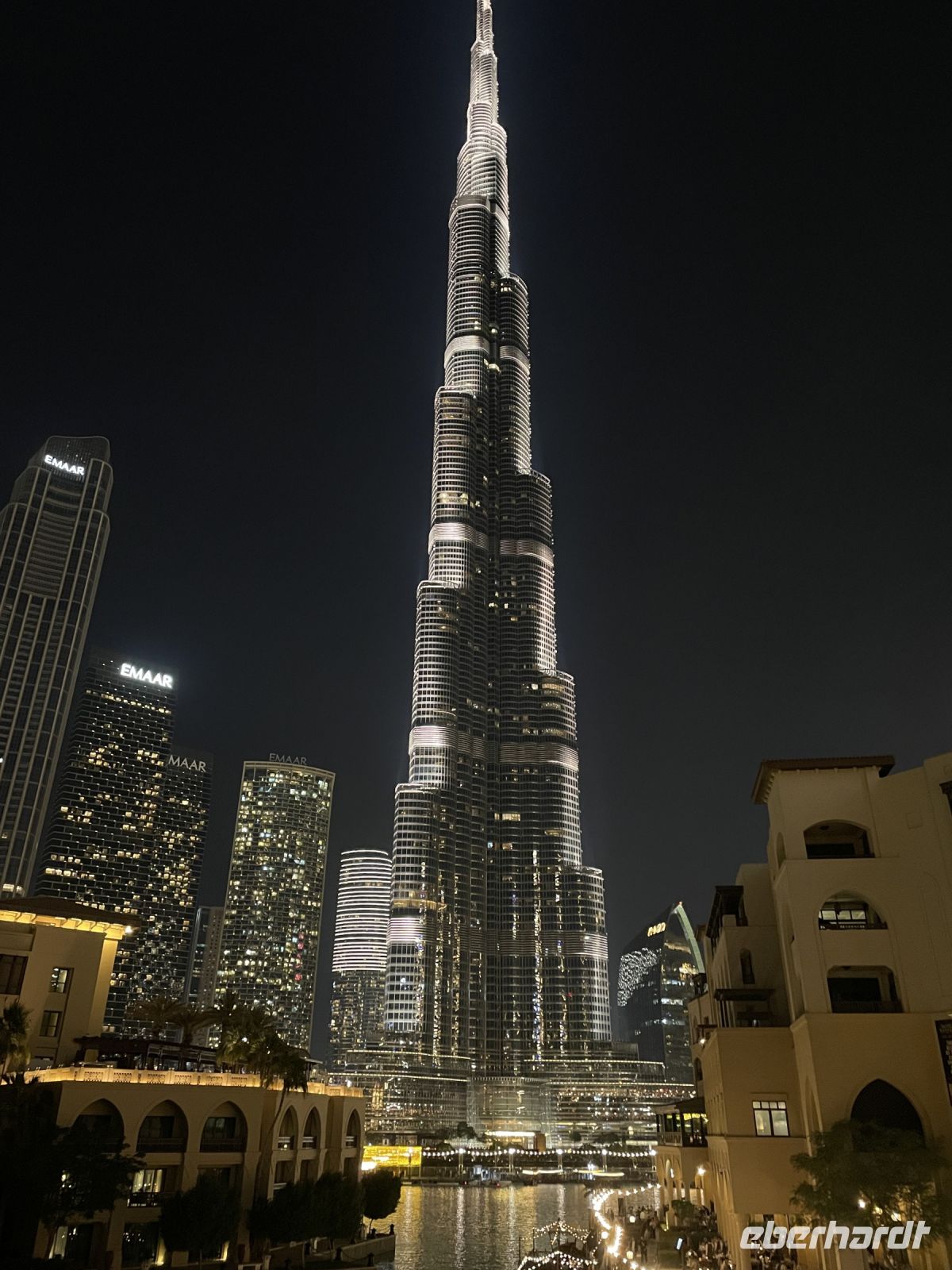 An unserem heutigen freien Tag können alle in Ruhe ausschlafen. Bis zum Treffpunkt am frühen Abend für die Silvesterfeier steht eine individuelle Ausgestaltung des Nachmittags auf dem Plan. Einige Reisegäste fahren jedoch mit mir in Richtung Dubai Marina. Hinzu nehmen wir die Metro und rückzu ein Taxi. Wir besuchen das Dubai Riesenrad, spazieren zum Adress Beach Hotel und gehen danach am JBR Strand Baden. Am späten Nachmittag erreichen wir wieder unser Hotel und haben noch etwas Freizeit bis wir wieder abgeholt werden. Um 19:30Uhr treffen wir uns wieder in der Lobby. Der Dresscode für unsere Silvesternacht lautet – Silber&Black. Dort angekommen, trinken wir erst einmal einen Begrüßungs-Sekt und begeben uns zu unseren Tischen im Außenbereich, wo uns nicht nur ein imposantes Buffet mit Lobster, Kaviar, Wagyu-Beef uvm. sondern auch ein einmaliges Show Programm geboten wird. Wir sitzen an einem großen Tisch und genießen Speiß- & Trank. Um 00:00Uhr heißt es… 3,2,1 – frohes neues Jahr! Das Feuerwerk ist einfach gigantisch! Alle sind begeistert! Nun geht die Party richtig los, mit Livemusik und einem DJ.