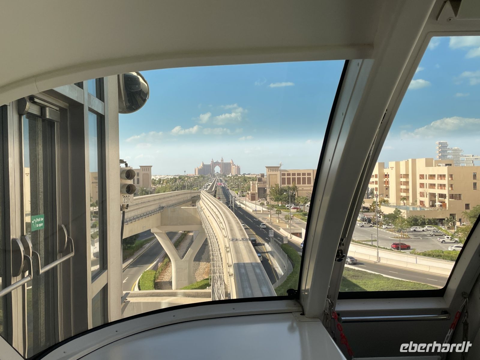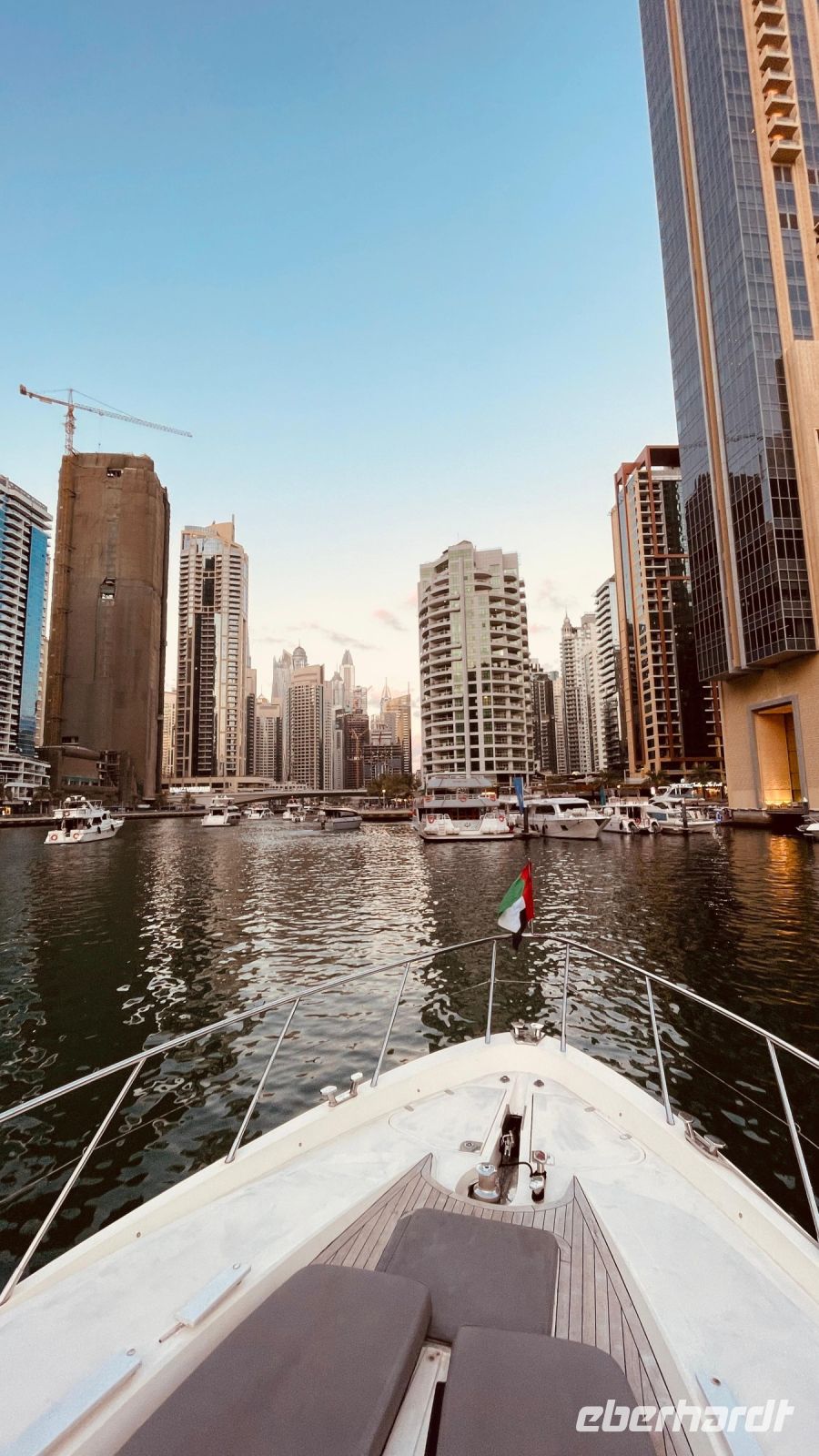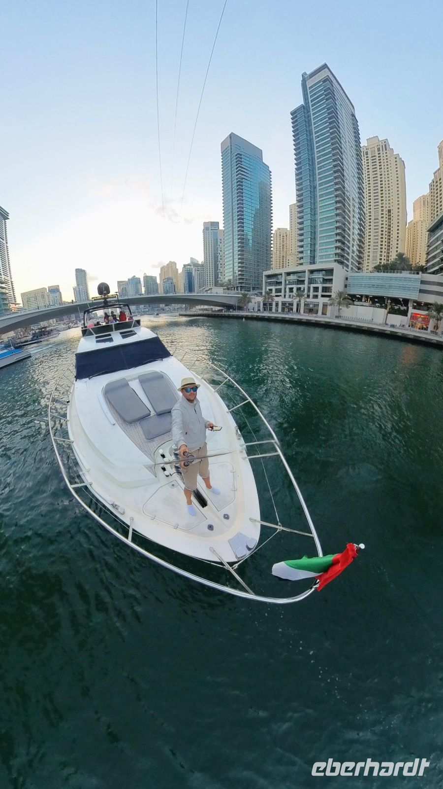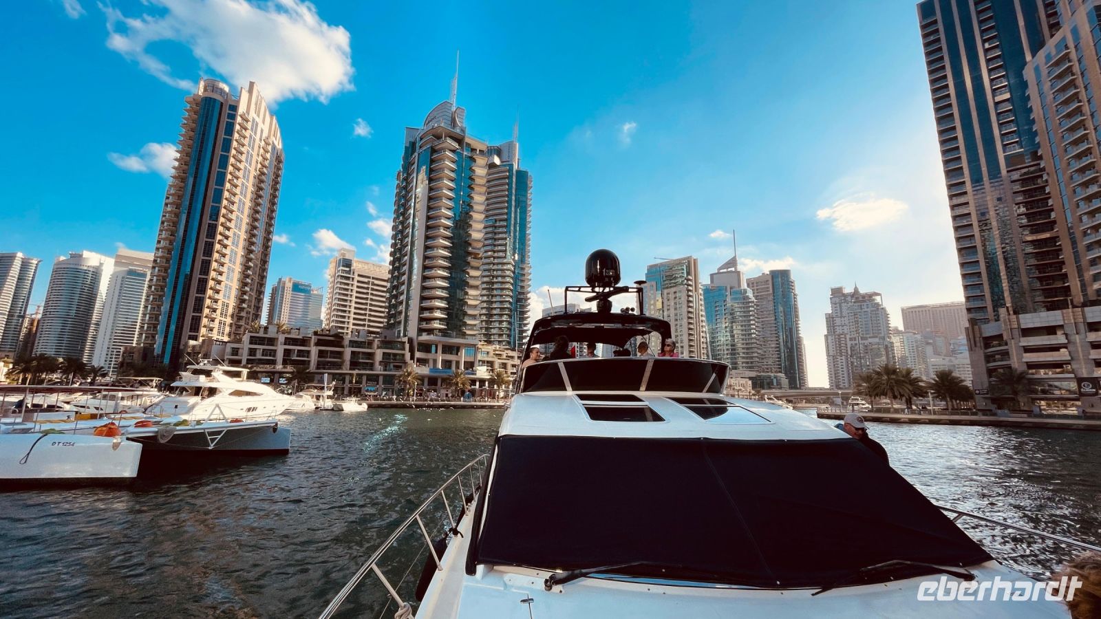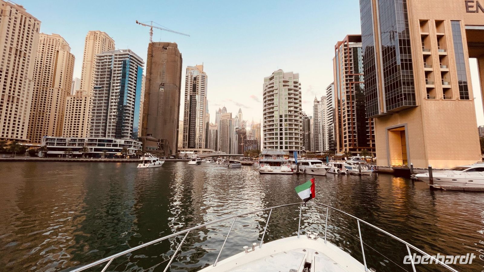 Danach geht es weiter zum „Miracle Park“, wo wir tolle Blumen-Dekorationen bestaunen können. Einiges erinnert aber auch etwas an Disneyland. Zum Schluss hat jeder noch die Möglichkeit eine Kleinigkeit zu essen. Um 13:30 Uhr setzen wir die Fahrt fort zur „Palmen Insel Jumeirah“, wo ich allen ein Ticket für die Monorail spendiere (auf Eberhardtkosten). Nach einer kurzen Wartezeit von etwa 30 Minuten steigen wir in die führerlose Bahn ein und fahren etwa 15 Minuten bis zur Endstation am Atlantis Hotel. Dort legen wir noch einen kurzen Rundgang bis zum Hoteleingang, ein, bevor es mit dem Reisebus wieder zurück zur Dubai Marina geht. Nach einem fünfminütigen Spaziergang erreichen wir den Bootssteg, wo unsere Yacht bereits auf uns wartet. Die zweistündige Fahrt durch die Dubai Marina und entlang der Palm Jumeirah ist der krönende Abschluss dieser tollen Reise. An Bord spendiere ich drei Flaschen Sekt, und wir übergeben Reiseleiter Ibrahim ein Trinkgeld für die tolle Führung während der Reise.