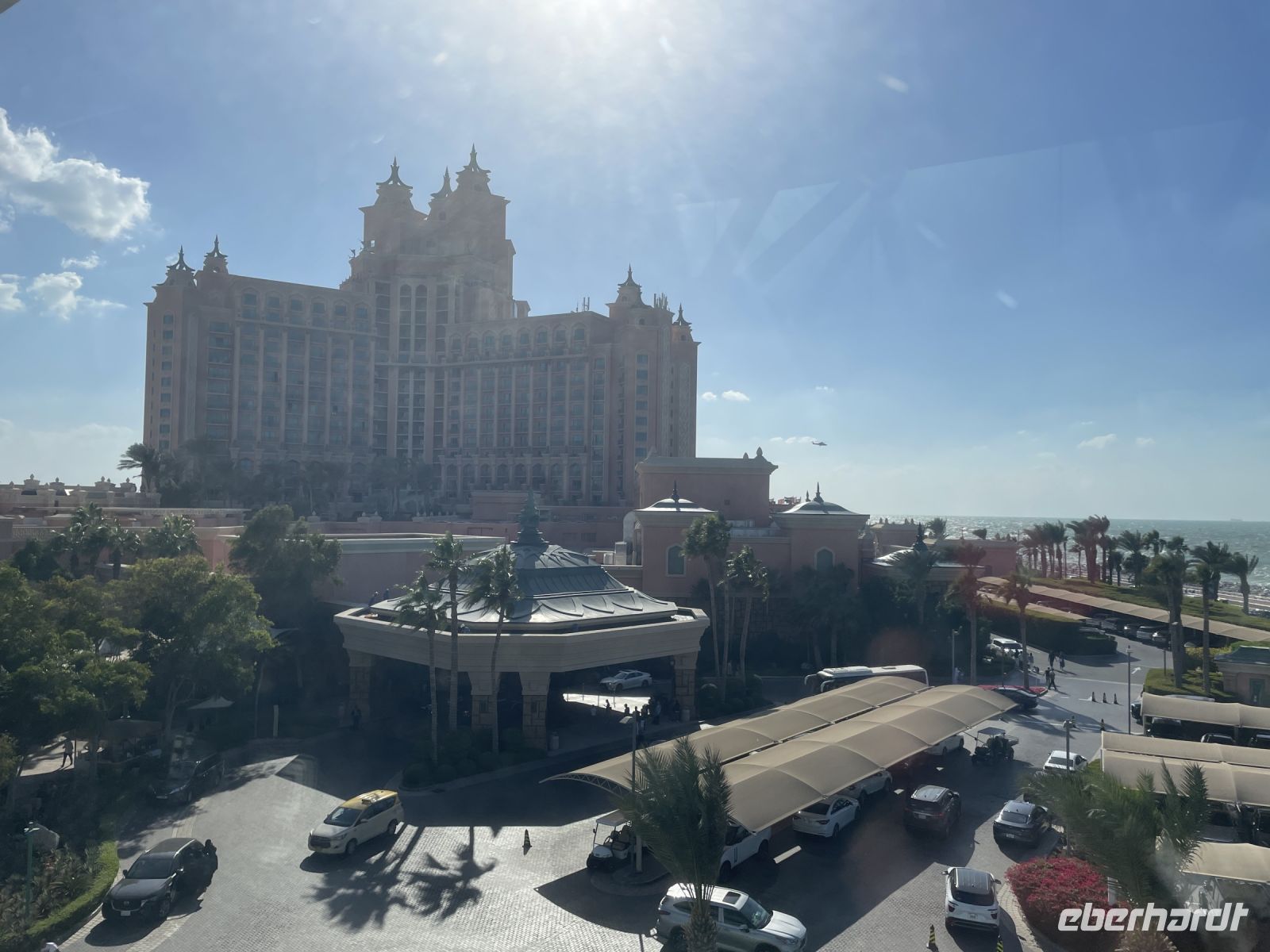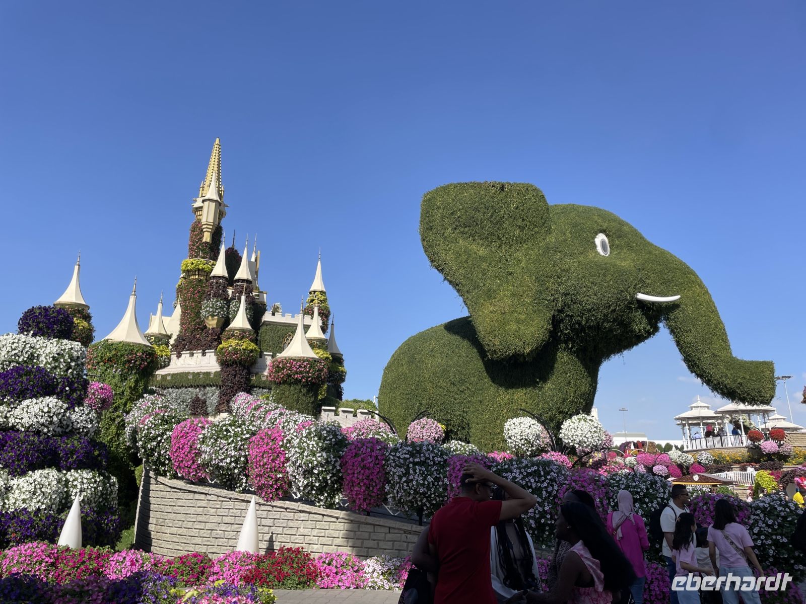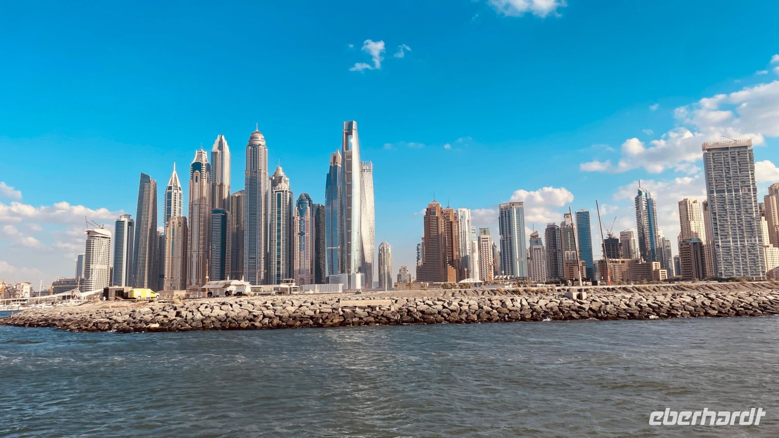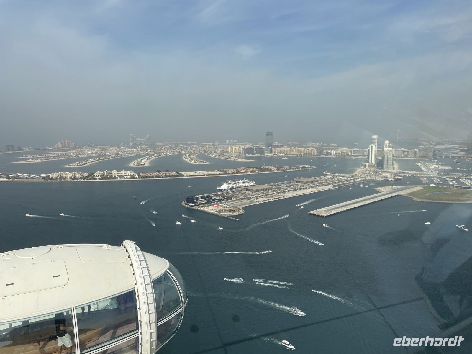 Danach geht es weiter zum „Miracle Park“, wo wir tolle Blumen-Dekorationen bestaunen können. Einiges erinnert aber auch etwas an Disneyland. Zum Schluss hat jeder noch die Möglichkeit eine Kleinigkeit zu essen. Um 13:30 Uhr setzen wir die Fahrt fort zur „Palmen Insel Jumeirah“, wo ich allen ein Ticket für die Monorail spendiere (auf Eberhardtkosten). Nach einer kurzen Wartezeit von etwa 30 Minuten steigen wir in die führerlose Bahn ein und fahren etwa 15 Minuten bis zur Endstation am Atlantis Hotel. Dort legen wir noch einen kurzen Rundgang bis zum Hoteleingang, ein, bevor es mit dem Reisebus wieder zurück zur Dubai Marina geht. Nach einem fünfminütigen Spaziergang erreichen wir den Bootssteg, wo unsere Yacht bereits auf uns wartet. Die zweistündige Fahrt durch die Dubai Marina und entlang der Palm Jumeirah ist der krönende Abschluss dieser tollen Reise. An Bord spendiere ich drei Flaschen Sekt, und wir übergeben Reiseleiter Ibrahim ein Trinkgeld für die tolle Führung während der Reise.