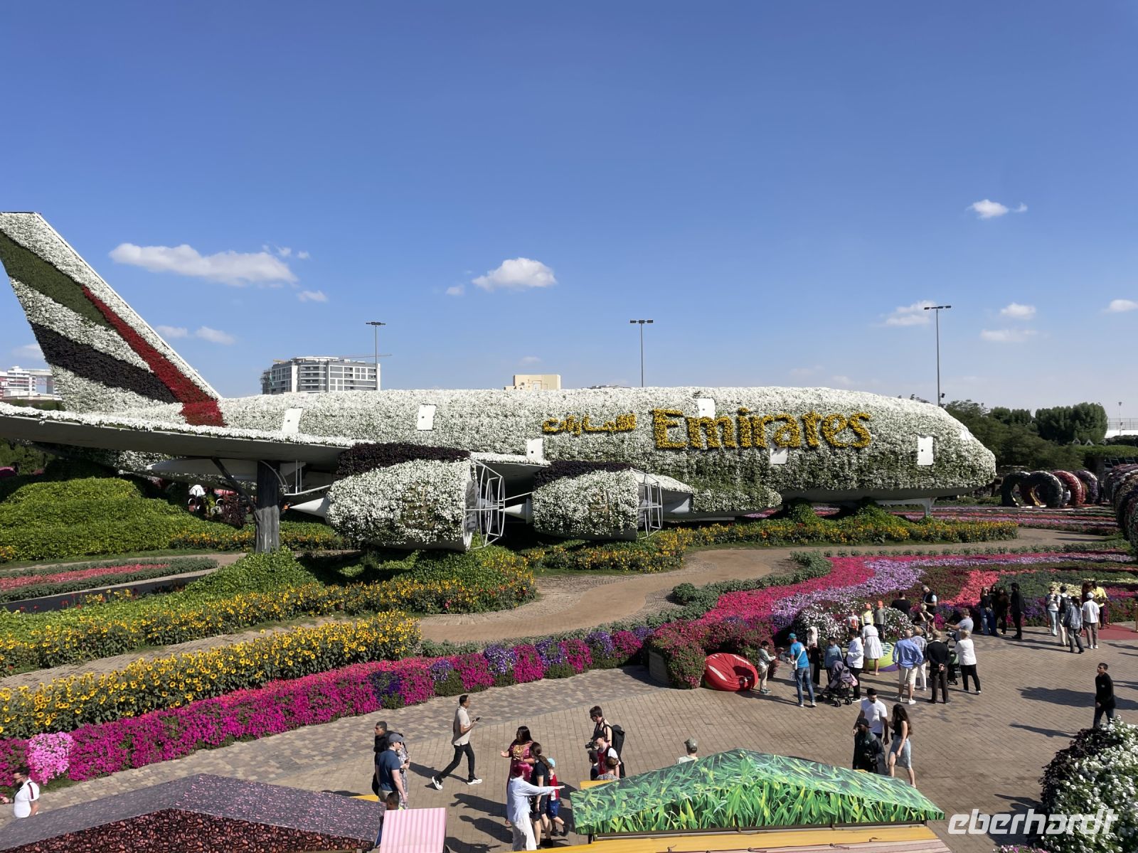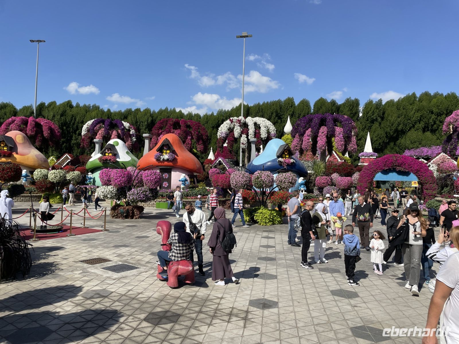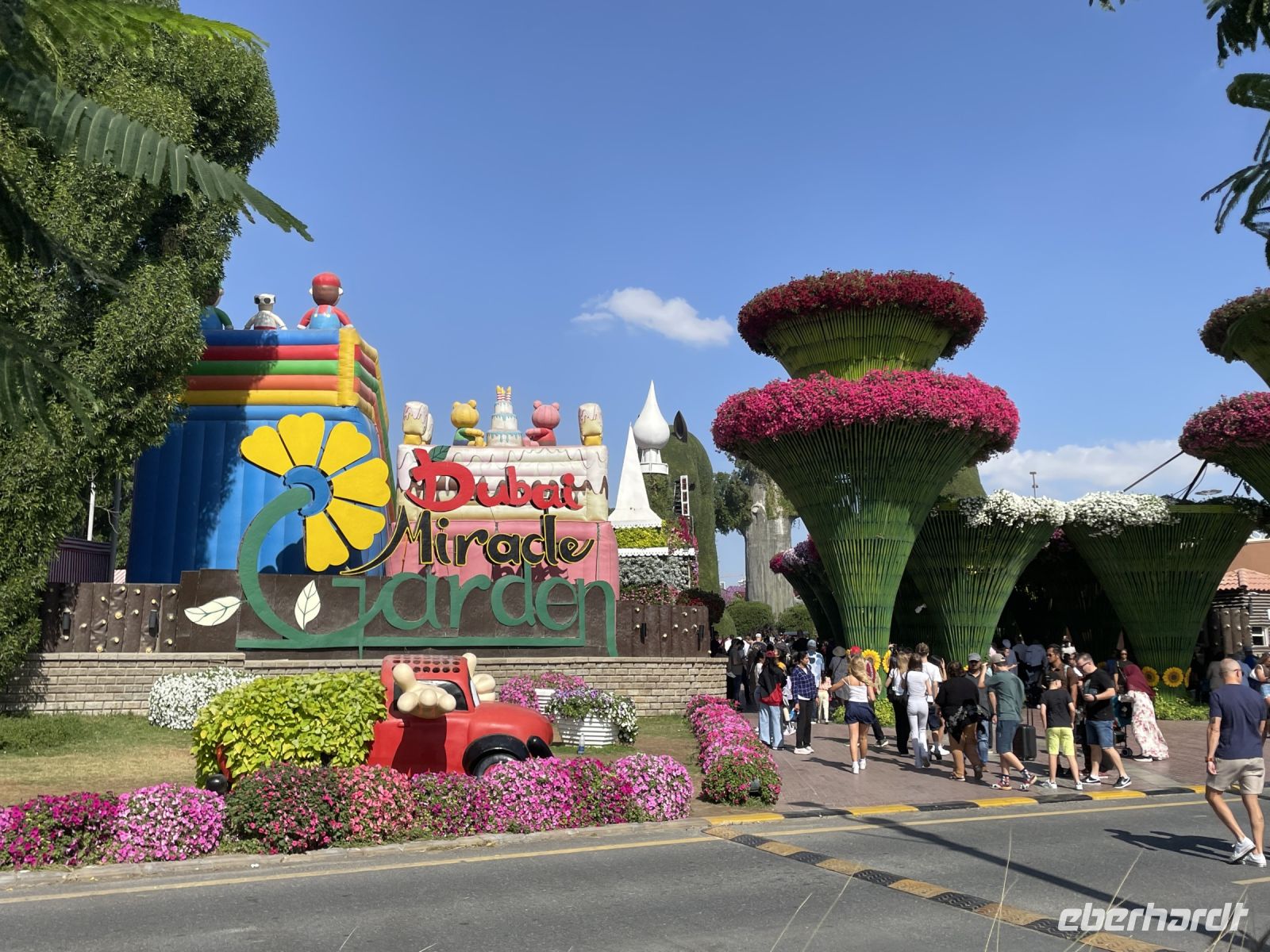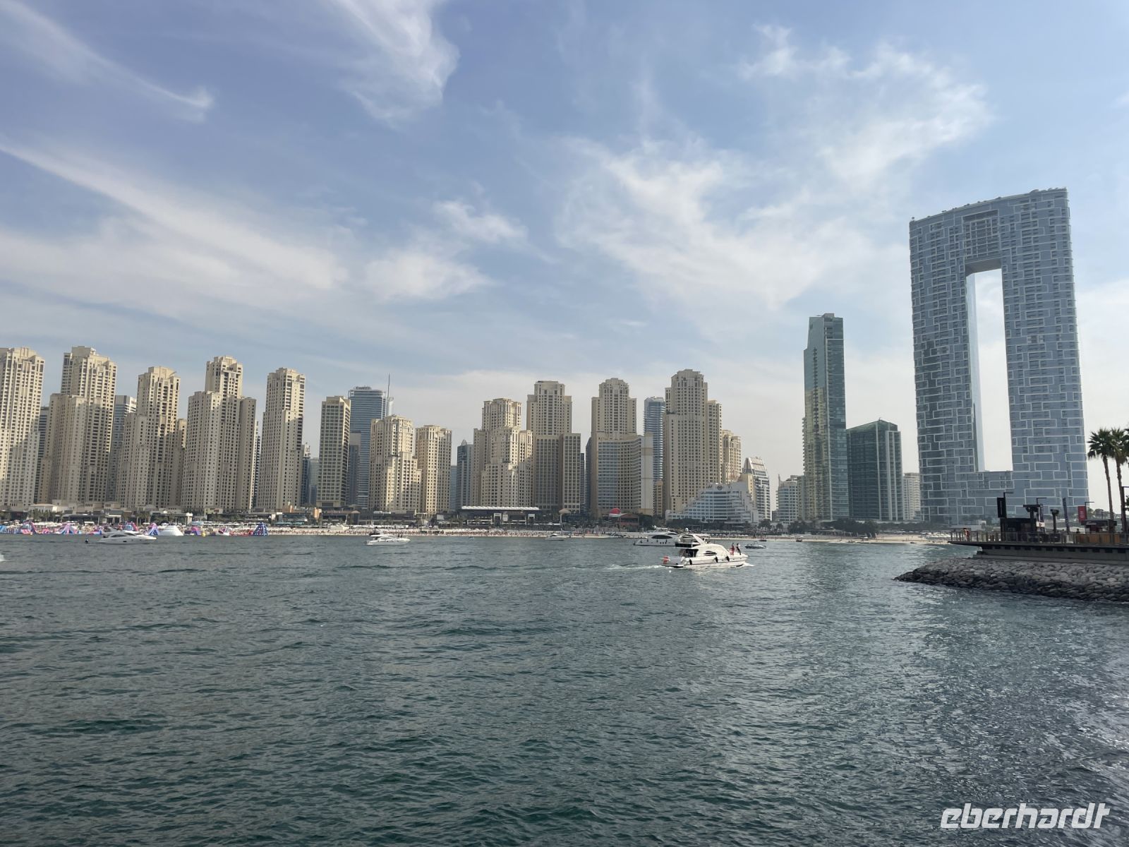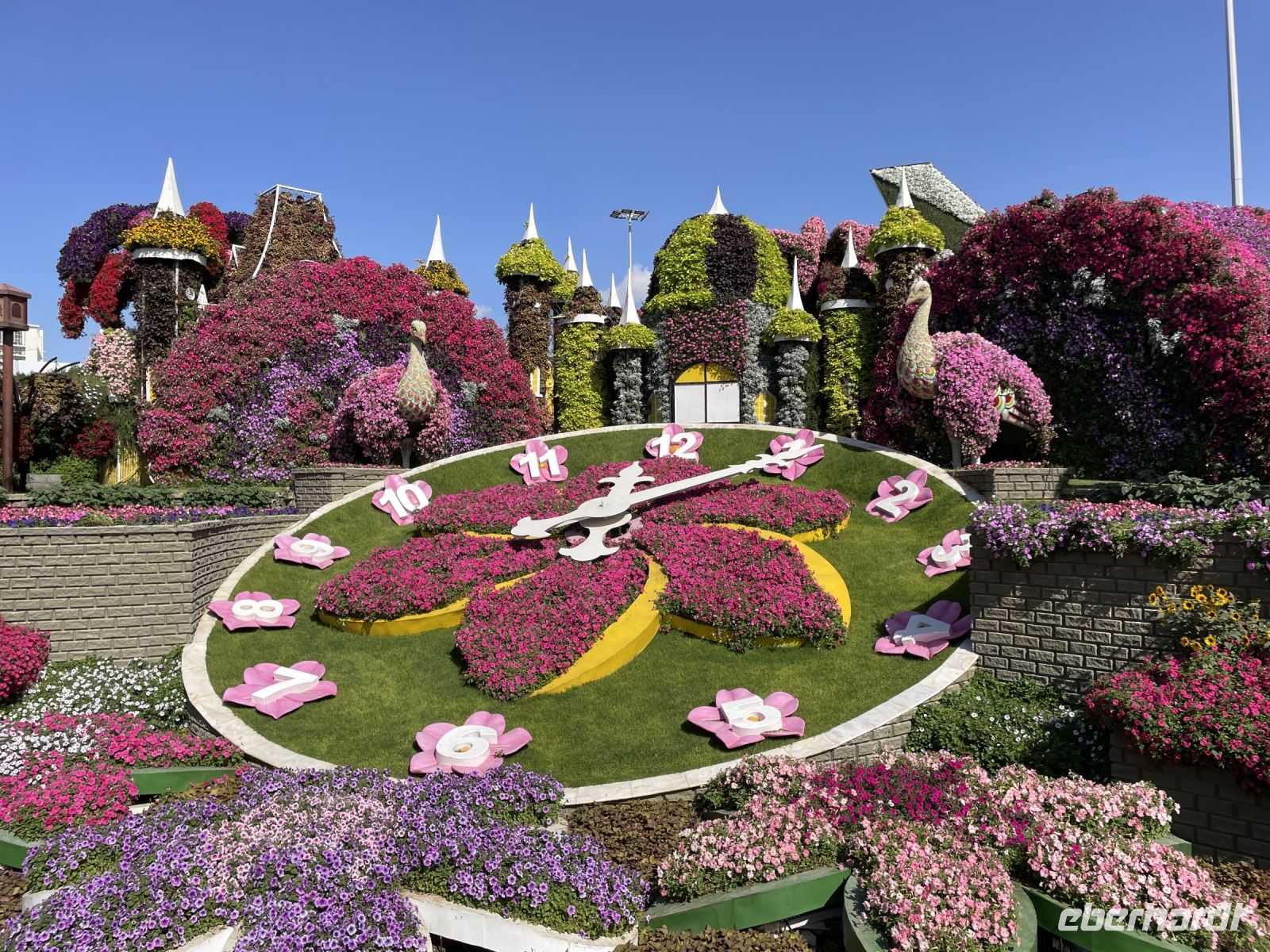 Danach geht es weiter zum „Miracle Park“, wo wir tolle Blumen-Dekorationen bestaunen können. Einiges erinnert aber auch etwas an Disneyland. Zum Schluss hat jeder noch die Möglichkeit eine Kleinigkeit zu essen. Um 13:30 Uhr setzen wir die Fahrt fort zur „Palmen Insel Jumeirah“, wo ich allen ein Ticket für die Monorail spendiere (auf Eberhardtkosten). Nach einer kurzen Wartezeit von etwa 30 Minuten steigen wir in die führerlose Bahn ein und fahren etwa 15 Minuten bis zur Endstation am Atlantis Hotel. Dort legen wir noch einen kurzen Rundgang bis zum Hoteleingang, ein, bevor es mit dem Reisebus wieder zurück zur Dubai Marina geht. Nach einem fünfminütigen Spaziergang erreichen wir den Bootssteg, wo unsere Yacht bereits auf uns wartet. Die zweistündige Fahrt durch die Dubai Marina und entlang der Palm Jumeirah ist der krönende Abschluss dieser tollen Reise. An Bord spendiere ich drei Flaschen Sekt, und wir übergeben Reiseleiter Ibrahim ein Trinkgeld für die tolle Führung während der Reise.