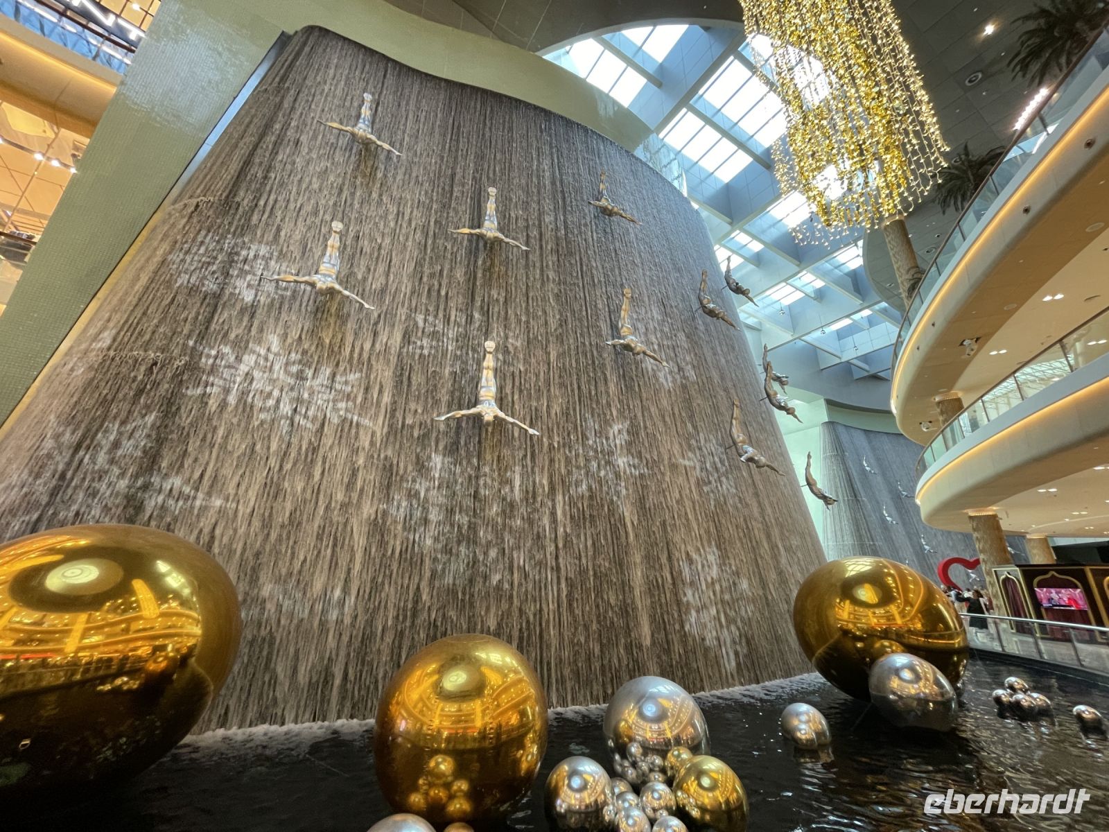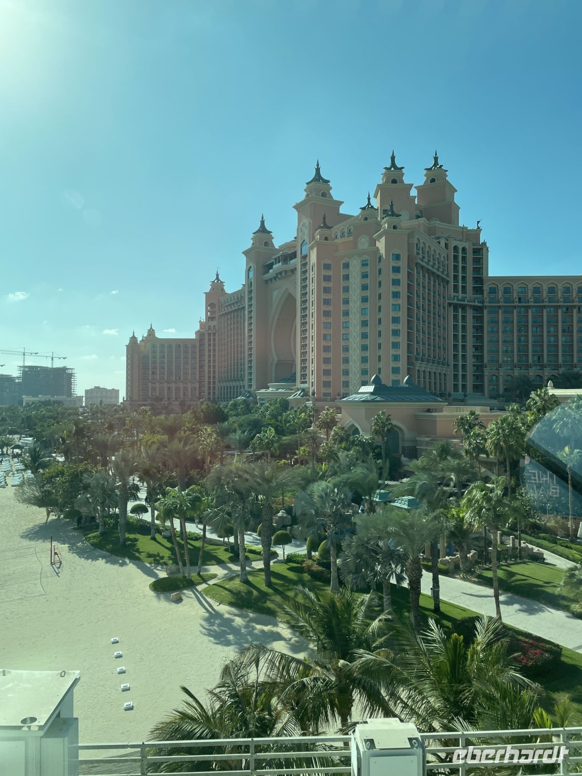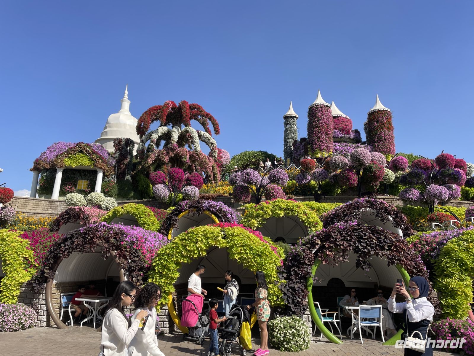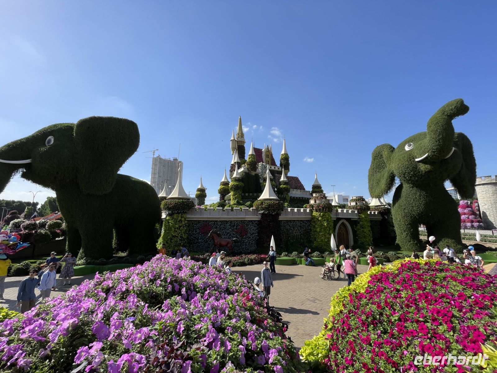 Danach geht es weiter zum „Miracle Park“, wo wir tolle Blumen-Dekorationen bestaunen können. Einiges erinnert aber auch etwas an Disneyland. Zum Schluss hat jeder noch die Möglichkeit eine Kleinigkeit zu essen. Um 13:30 Uhr setzen wir die Fahrt fort zur „Palmen Insel Jumeirah“, wo ich allen ein Ticket für die Monorail spendiere (auf Eberhardtkosten). Nach einer kurzen Wartezeit von etwa 30 Minuten steigen wir in die führerlose Bahn ein und fahren etwa 15 Minuten bis zur Endstation am Atlantis Hotel. Dort legen wir noch einen kurzen Rundgang bis zum Hoteleingang, ein, bevor es mit dem Reisebus wieder zurück zur Dubai Marina geht. Nach einem fünfminütigen Spaziergang erreichen wir den Bootssteg, wo unsere Yacht bereits auf uns wartet. Die zweistündige Fahrt durch die Dubai Marina und entlang der Palm Jumeirah ist der krönende Abschluss dieser tollen Reise. An Bord spendiere ich drei Flaschen Sekt, und wir übergeben Reiseleiter Ibrahim ein Trinkgeld für die tolle Führung während der Reise.