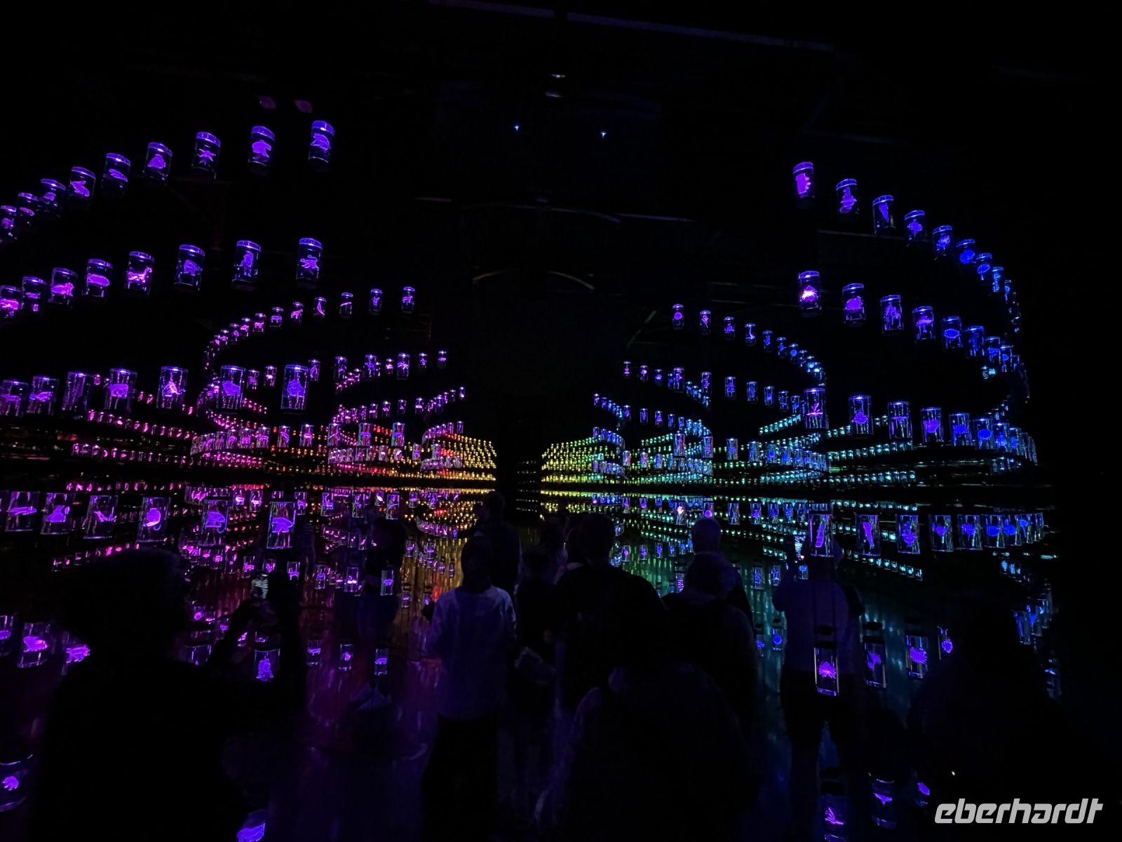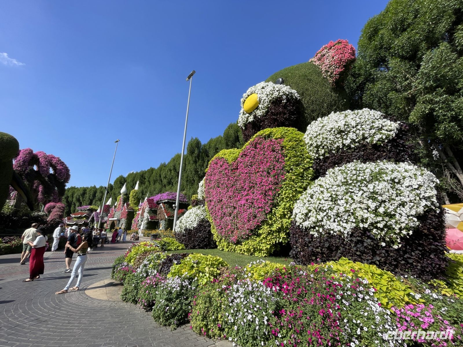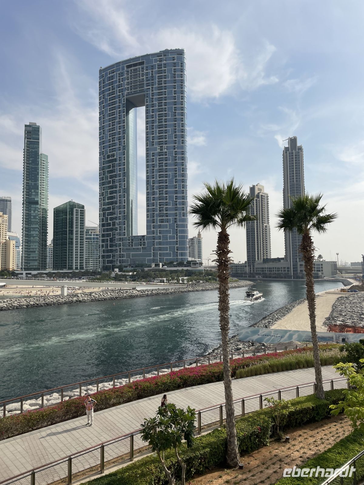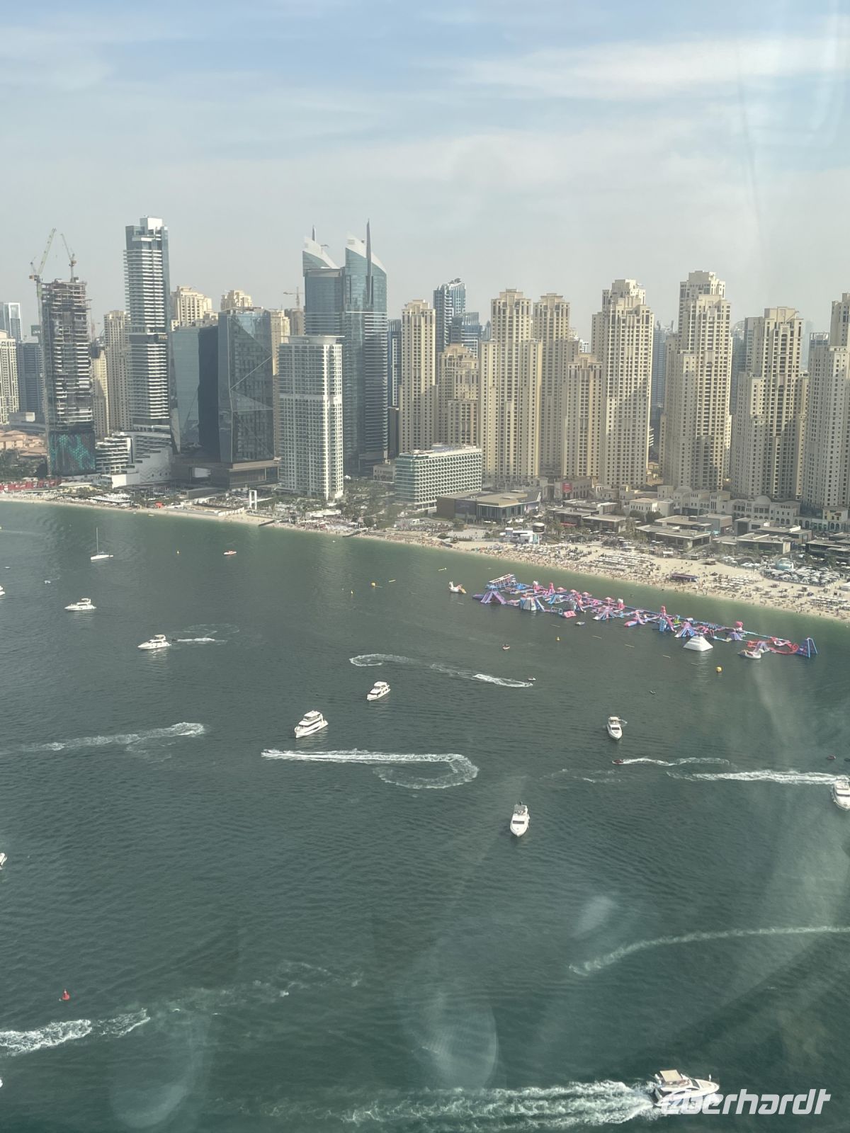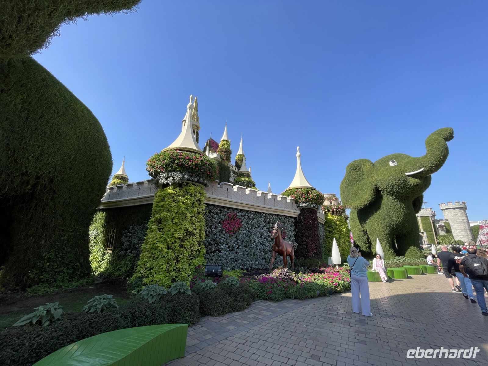 Danach geht es weiter zum „Miracle Park“, wo wir tolle Blumen-Dekorationen bestaunen können. Einiges erinnert aber auch etwas an Disneyland. Zum Schluss hat jeder noch die Möglichkeit eine Kleinigkeit zu essen. Um 13:30 Uhr setzen wir die Fahrt fort zur „Palmen Insel Jumeirah“, wo ich allen ein Ticket für die Monorail spendiere (auf Eberhardtkosten). Nach einer kurzen Wartezeit von etwa 30 Minuten steigen wir in die führerlose Bahn ein und fahren etwa 15 Minuten bis zur Endstation am Atlantis Hotel. Dort legen wir noch einen kurzen Rundgang bis zum Hoteleingang, ein, bevor es mit dem Reisebus wieder zurück zur Dubai Marina geht. Nach einem fünfminütigen Spaziergang erreichen wir den Bootssteg, wo unsere Yacht bereits auf uns wartet. Die zweistündige Fahrt durch die Dubai Marina und entlang der Palm Jumeirah ist der krönende Abschluss dieser tollen Reise. An Bord spendiere ich drei Flaschen Sekt, und wir übergeben Reiseleiter Ibrahim ein Trinkgeld für die tolle Führung während der Reise.