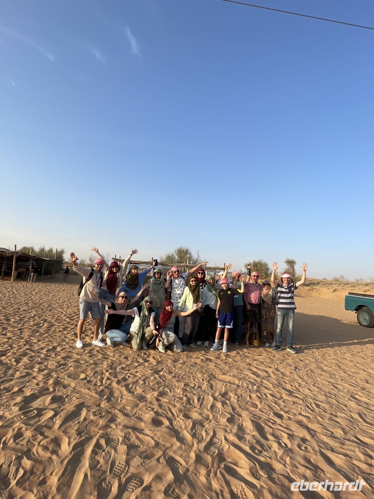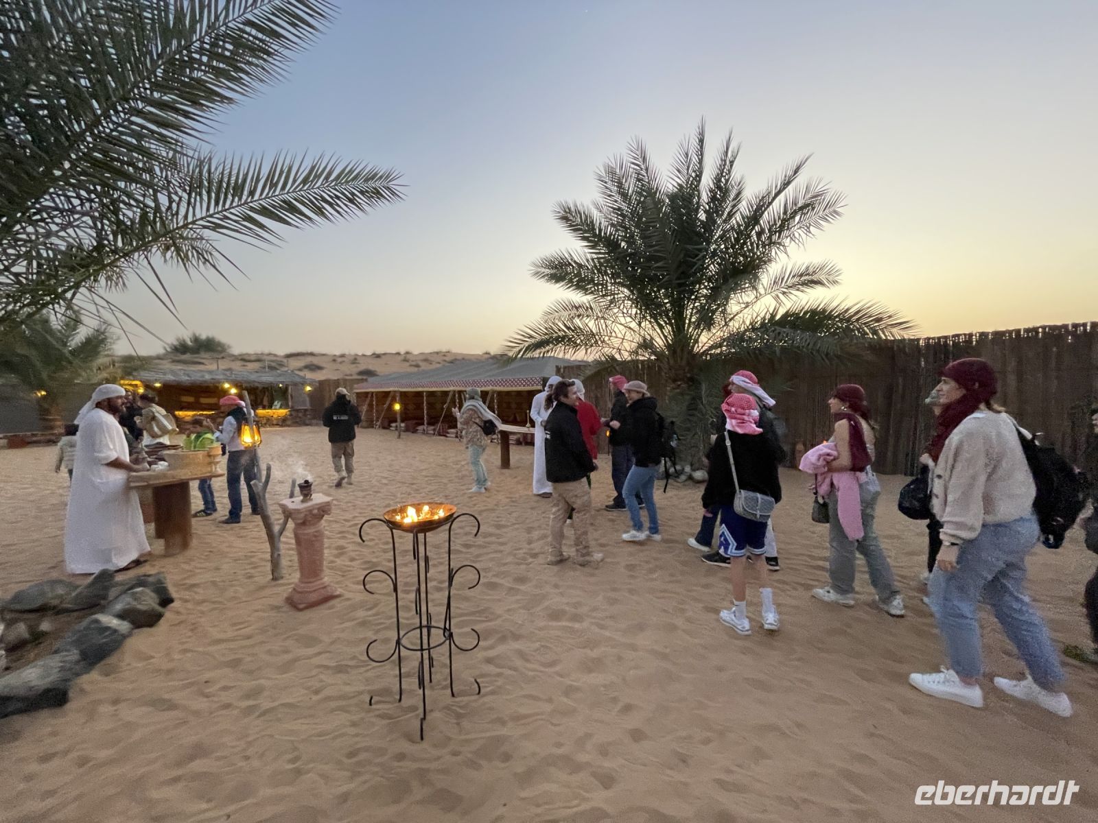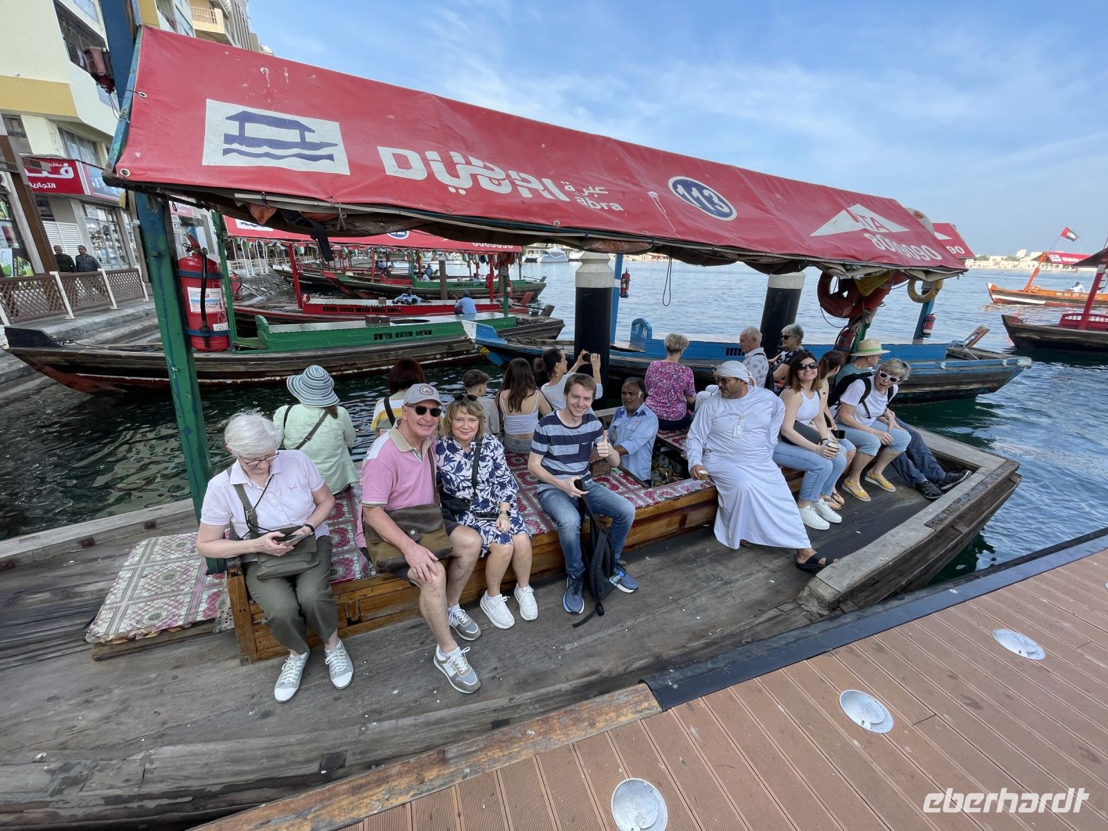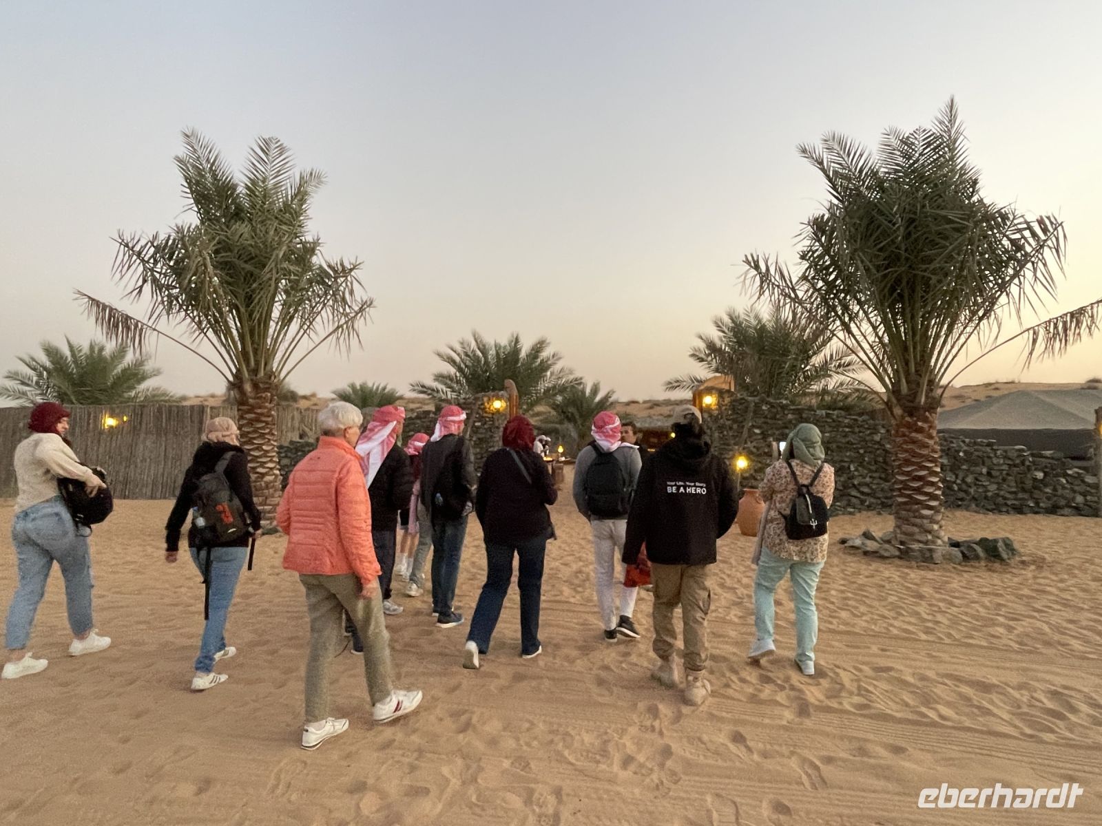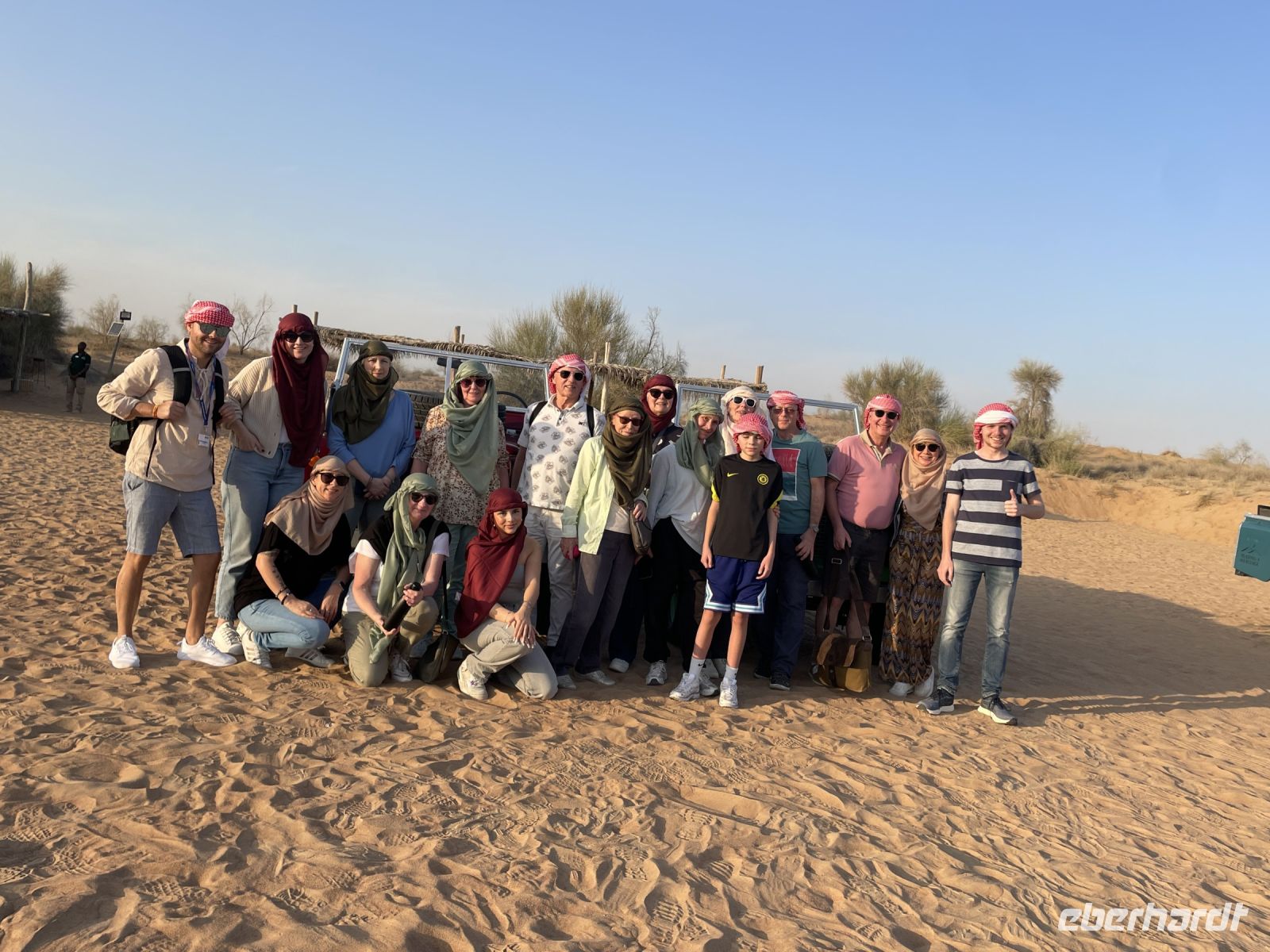 Um 9:30 Uhr starten wir mit unserem Reisebus und Reiseleiter Ibrahim ins alte Viertel „Al Sharif“, das nach historischen Vorbildern nachgebaut wurde. Hier spazieren wir durch die Gassen und besichtigen unter anderem die digitale Polizeistation. Kurz danach setzen wir unsere Tour mit dem Bus fort und fahren zum Dubai Creek, wo wir mit einem traditionellen Abra-Boot über den Fluss übersetzen. Auf der anderen Seite angekommen, schlendern wir über den Goldmarkt und Gewürzmarkt. Anschließend fahren wir zurück ins Hotel, wo wir von 13:00 bis 14:45 Uhr Freizeit genießen. Viele entspannen sich am Pool und essen eine Kleinigkeit. Um 14:45 Uhr treffen wir uns wieder in der Lobby, doch der Bus für die Wüstensafari hat eine Panne. Nach einer kurzen Wartezeit organisiert der Wüstentour-Veranstalter mehrere Taxis und wir fahren schließlich doch noch in Richtung Wüste. Vor Ort verpassen wir zum Glück nichts und starten gemeinsam mit offenen Jeeps zu den Sanddünen. Zunächst genießen wir den Sonnenuntergang und knipsen zahlreiche Fotos im Sand, bevor es weitergeht. Danach erreichen fahren wir zur Falkenshow, wo wir die Falken im Jagdflug bestaunen können. Anschließen erreichen wir unser Wüstencamp, wo wir auf Kamelen eine Runde drehen und wieder tolle Fotos knipsen können. Nun haben wir alle Hunger und freuen und auf das schmackhafte arabische Abendessen. Es gibt eine kleine Auswahl an Salaten und eine große Fleischauswahl. Zum Abschluss gibt es Obst und Sesambällchen. Die anschließende Musikeinlage genießen wir mit einer Wasserpfeife im liegen auf alten Perserteppichen. Gegen 22:30Uhr erreichen wir wieder unser Hotel.
