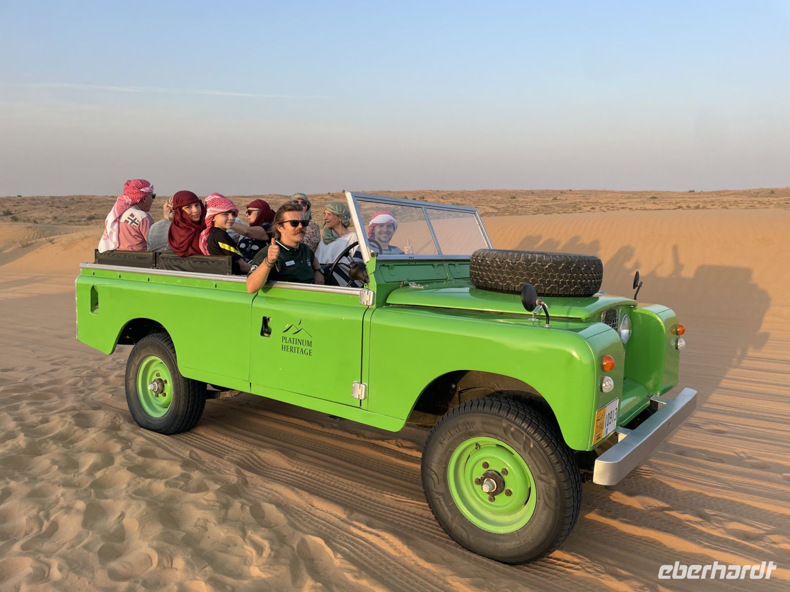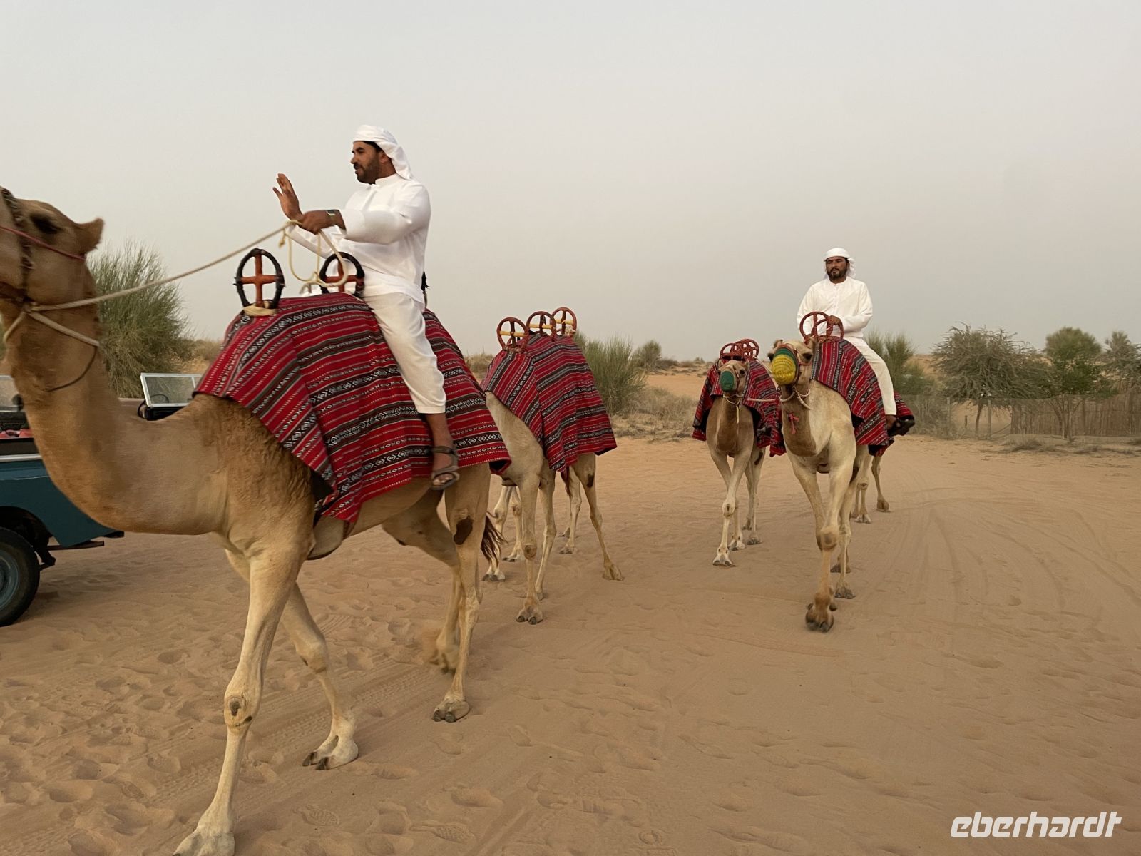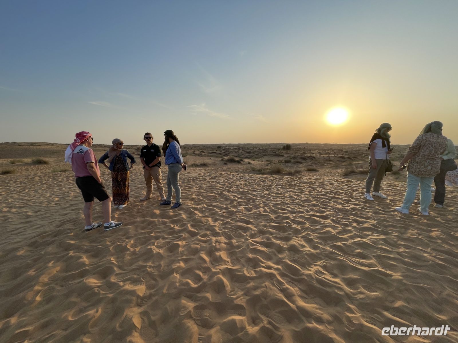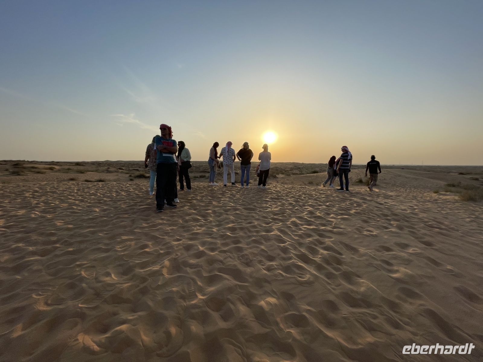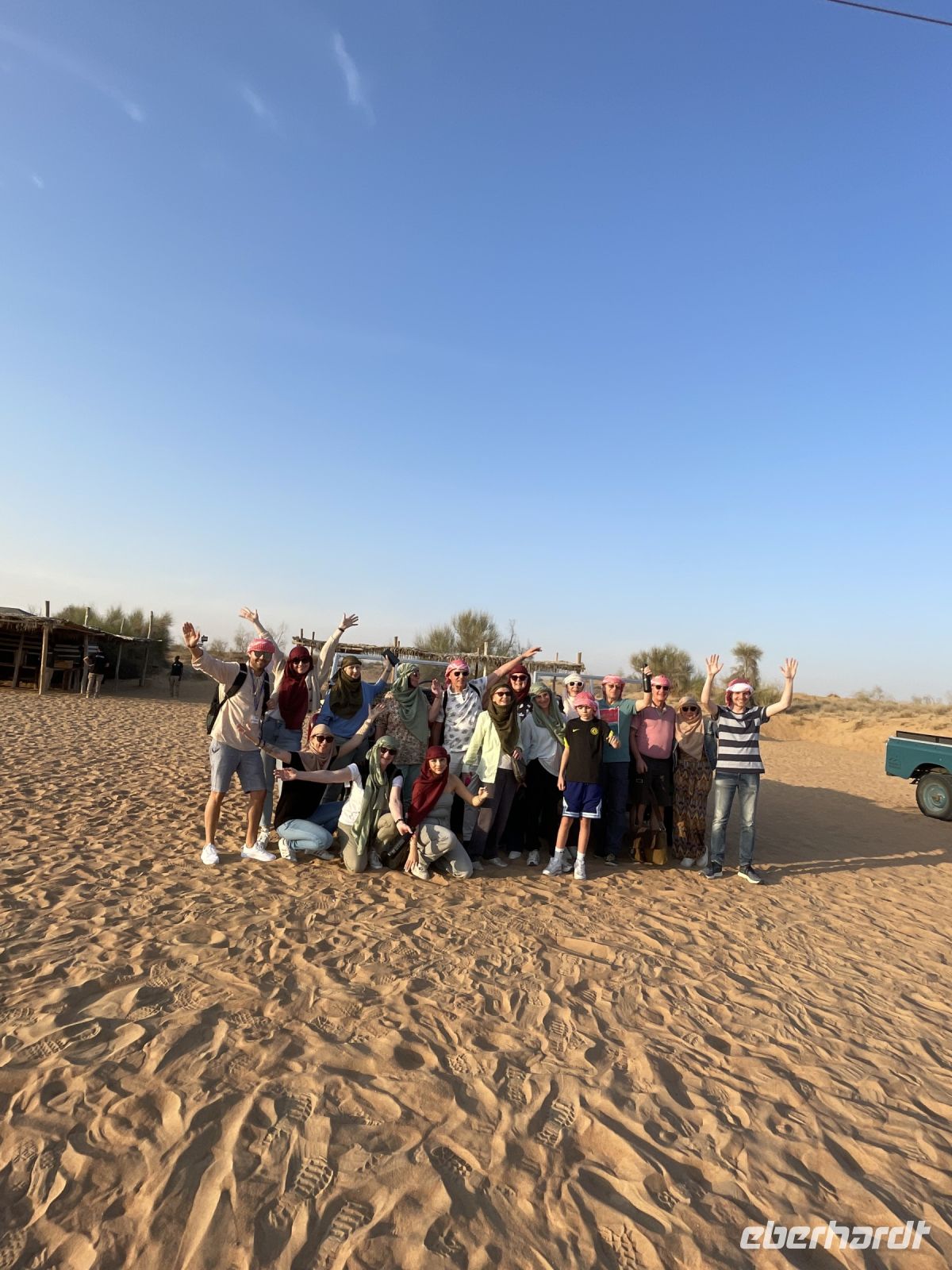 Um 9:30 Uhr starten wir mit unserem Reisebus und Reiseleiter Ibrahim ins alte Viertel „Al Sharif“, das nach historischen Vorbildern nachgebaut wurde. Hier spazieren wir durch die Gassen und besichtigen unter anderem die digitale Polizeistation. Kurz danach setzen wir unsere Tour mit dem Bus fort und fahren zum Dubai Creek, wo wir mit einem traditionellen Abra-Boot über den Fluss übersetzen. Auf der anderen Seite angekommen, schlendern wir über den Goldmarkt und Gewürzmarkt. Anschließend fahren wir zurück ins Hotel, wo wir von 13:00 bis 14:45 Uhr Freizeit genießen. Viele entspannen sich am Pool und essen eine Kleinigkeit. Um 14:45 Uhr treffen wir uns wieder in der Lobby, doch der Bus für die Wüstensafari hat eine Panne. Nach einer kurzen Wartezeit organisiert der Wüstentour-Veranstalter mehrere Taxis und wir fahren schließlich doch noch in Richtung Wüste. Vor Ort verpassen wir zum Glück nichts und starten gemeinsam mit offenen Jeeps zu den Sanddünen. Zunächst genießen wir den Sonnenuntergang und knipsen zahlreiche Fotos im Sand, bevor es weitergeht. Danach erreichen fahren wir zur Falkenshow, wo wir die Falken im Jagdflug bestaunen können. Anschließen erreichen wir unser Wüstencamp, wo wir auf Kamelen eine Runde drehen und wieder tolle Fotos knipsen können. Nun haben wir alle Hunger und freuen und auf das schmackhafte arabische Abendessen. Es gibt eine kleine Auswahl an Salaten und eine große Fleischauswahl. Zum Abschluss gibt es Obst und Sesambällchen. Die anschließende Musikeinlage genießen wir mit einer Wasserpfeife im liegen auf alten Perserteppichen. Gegen 22:30Uhr erreichen wir wieder unser Hotel.