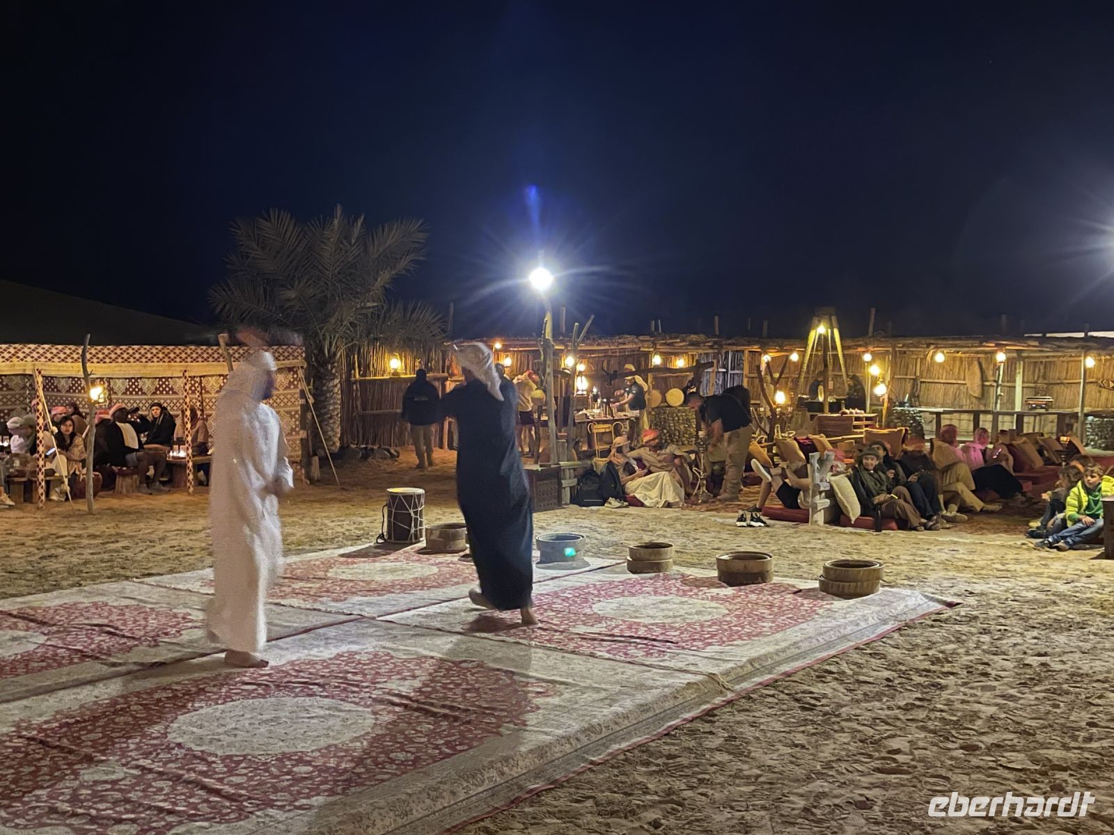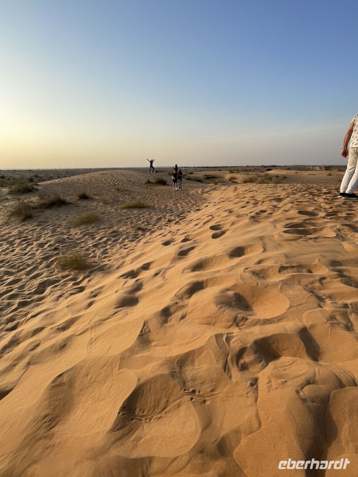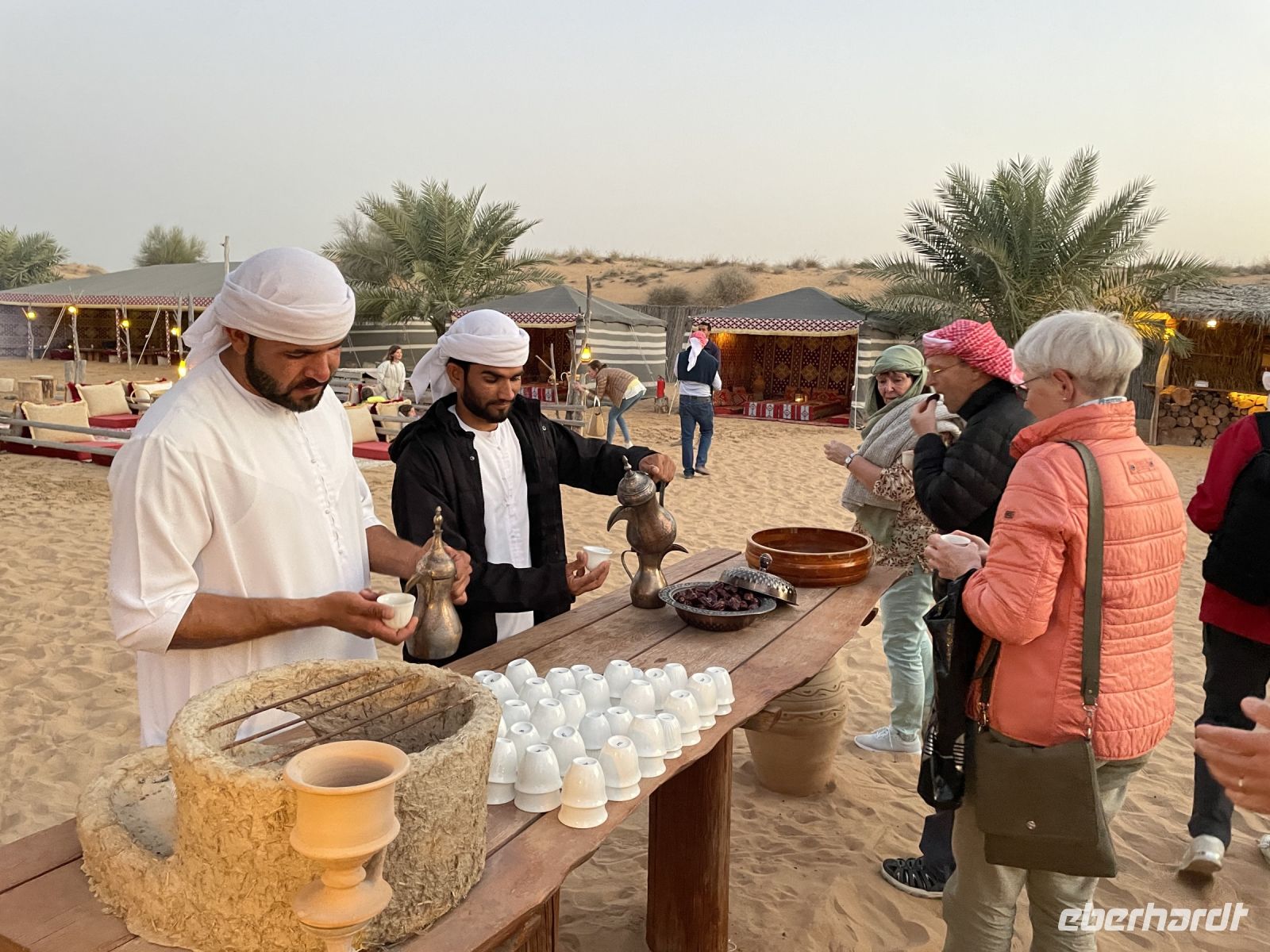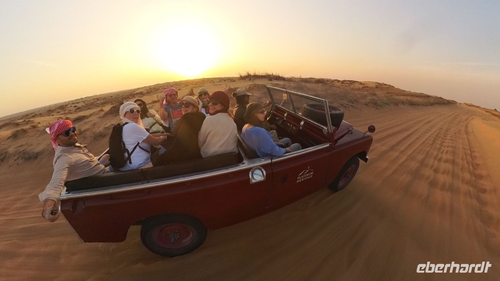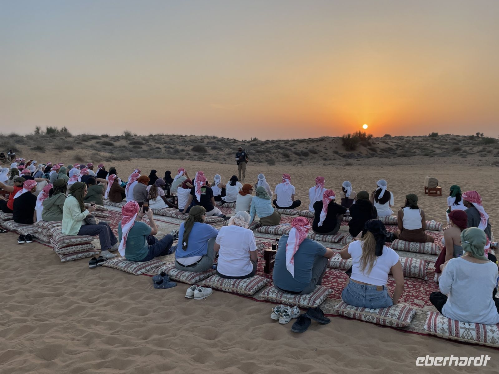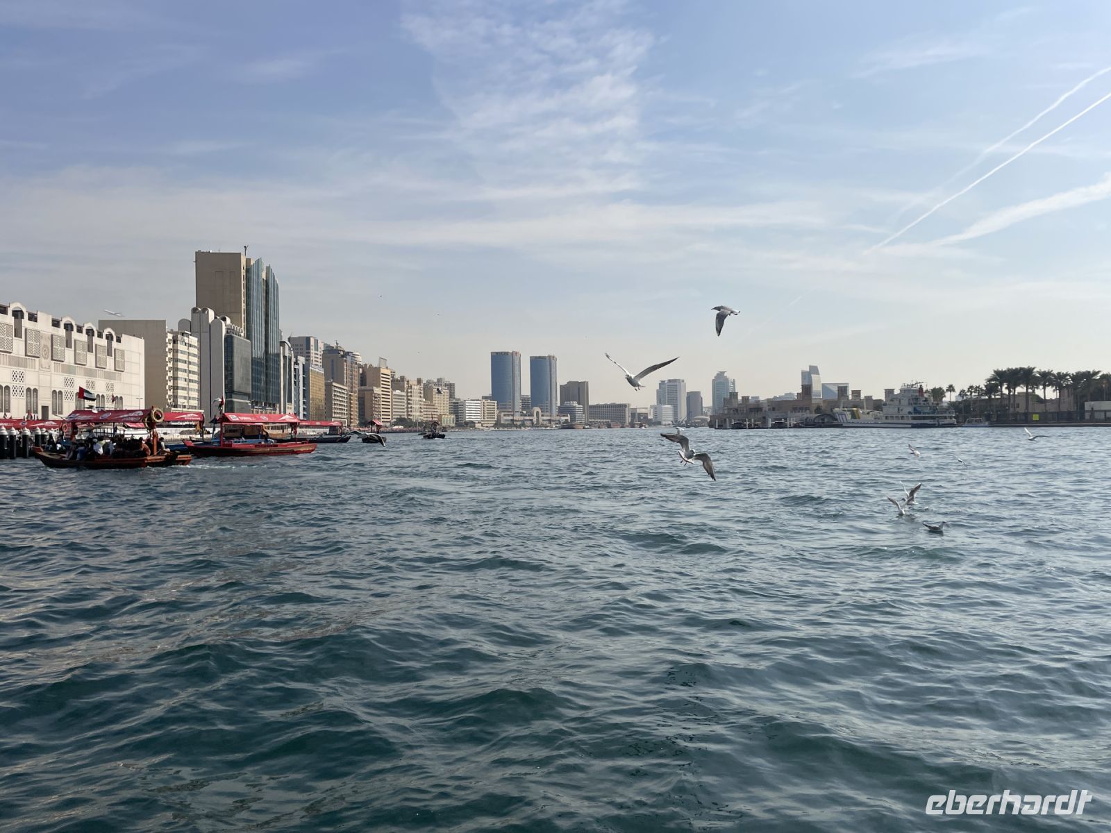 Um 9:30 Uhr starten wir mit unserem Reisebus und Reiseleiter Ibrahim ins alte Viertel „Al Sharif“, das nach historischen Vorbildern nachgebaut wurde. Hier spazieren wir durch die Gassen und besichtigen unter anderem die digitale Polizeistation. Kurz danach setzen wir unsere Tour mit dem Bus fort und fahren zum Dubai Creek, wo wir mit einem traditionellen Abra-Boot über den Fluss übersetzen. Auf der anderen Seite angekommen, schlendern wir über den Goldmarkt und Gewürzmarkt. Anschließend fahren wir zurück ins Hotel, wo wir von 13:00 bis 14:45 Uhr Freizeit genießen. Viele entspannen sich am Pool und essen eine Kleinigkeit. Um 14:45 Uhr treffen wir uns wieder in der Lobby, doch der Bus für die Wüstensafari hat eine Panne. Nach einer kurzen Wartezeit organisiert der Wüstentour-Veranstalter mehrere Taxis und wir fahren schließlich doch noch in Richtung Wüste. Vor Ort verpassen wir zum Glück nichts und starten gemeinsam mit offenen Jeeps zu den Sanddünen. Zunächst genießen wir den Sonnenuntergang und knipsen zahlreiche Fotos im Sand, bevor es weitergeht. Danach erreichen fahren wir zur Falkenshow, wo wir die Falken im Jagdflug bestaunen können. Anschließen erreichen wir unser Wüstencamp, wo wir auf Kamelen eine Runde drehen und wieder tolle Fotos knipsen können. Nun haben wir alle Hunger und freuen und auf das schmackhafte arabische Abendessen. Es gibt eine kleine Auswahl an Salaten und eine große Fleischauswahl. Zum Abschluss gibt es Obst und Sesambällchen. Die anschließende Musikeinlage genießen wir mit einer Wasserpfeife im liegen auf alten Perserteppichen. Gegen 22:30Uhr erreichen wir wieder unser Hotel.