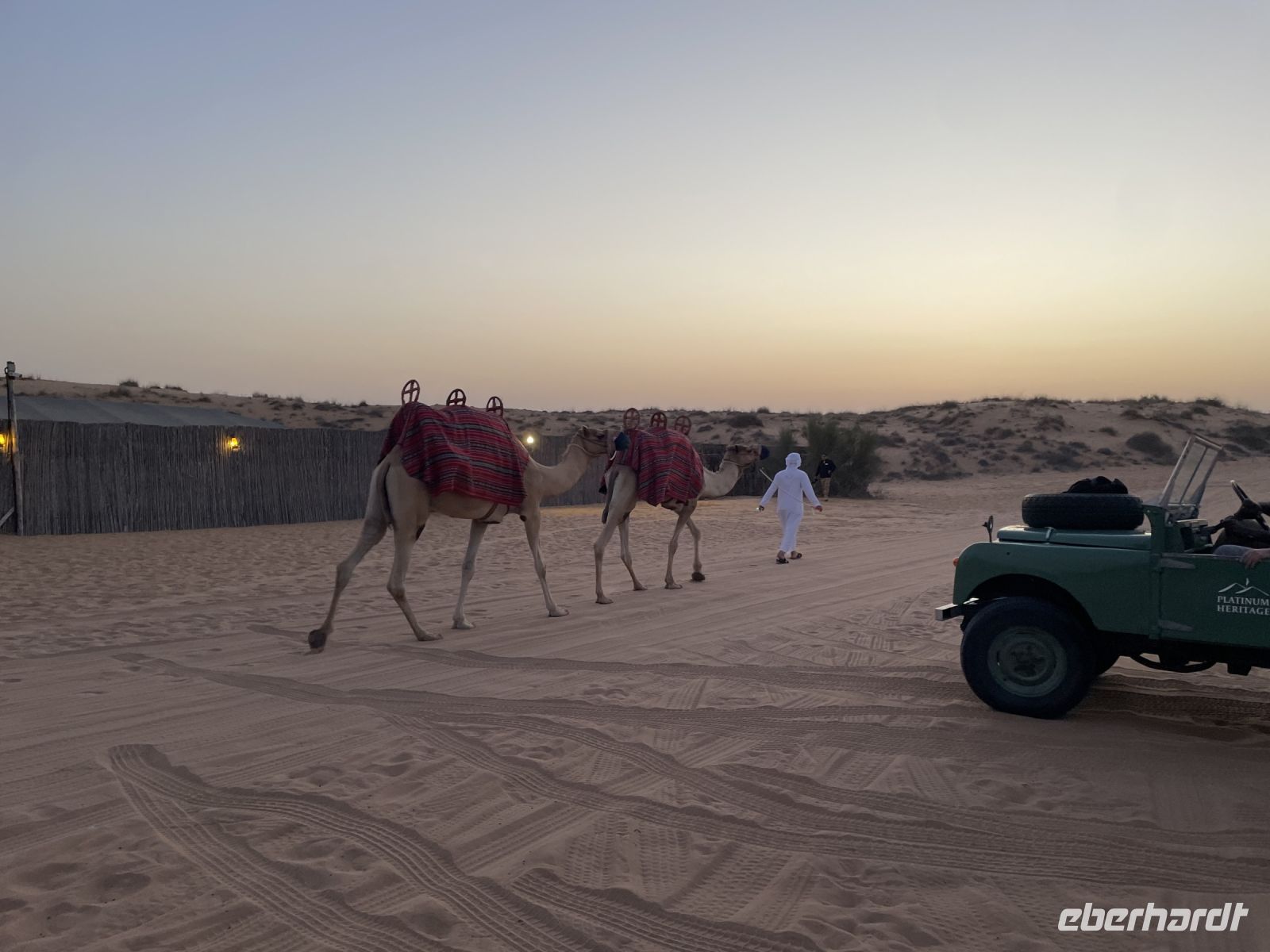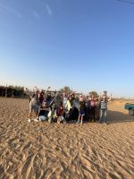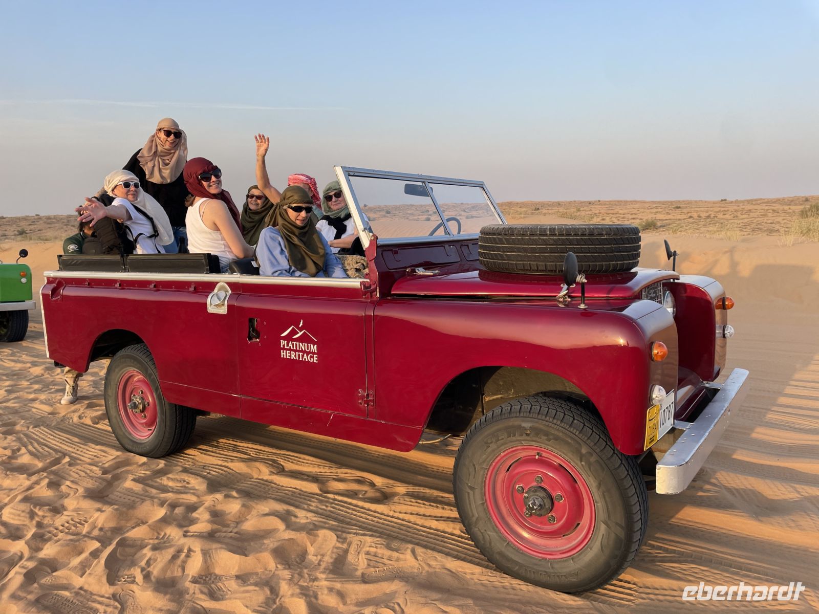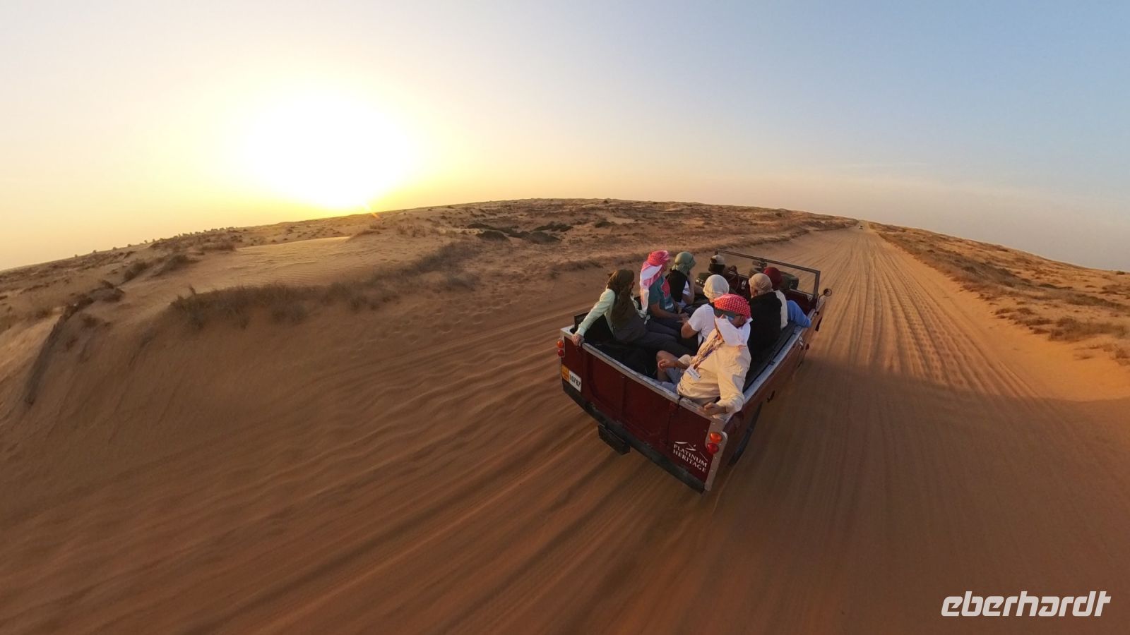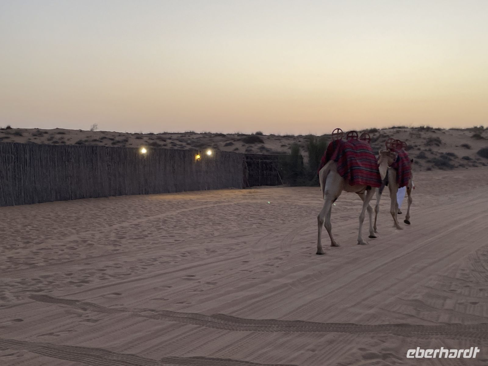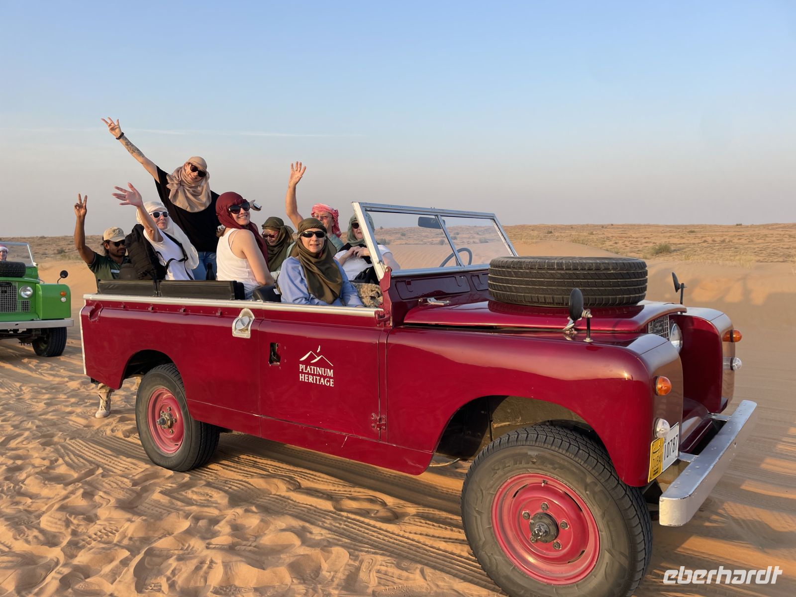 Um 9:30 Uhr starten wir mit unserem Reisebus und Reiseleiter Ibrahim ins alte Viertel „Al Sharif“, das nach historischen Vorbildern nachgebaut wurde. Hier spazieren wir durch die Gassen und besichtigen unter anderem die digitale Polizeistation. Kurz danach setzen wir unsere Tour mit dem Bus fort und fahren zum Dubai Creek, wo wir mit einem traditionellen Abra-Boot über den Fluss übersetzen. Auf der anderen Seite angekommen, schlendern wir über den Goldmarkt und Gewürzmarkt. Anschließend fahren wir zurück ins Hotel, wo wir von 13:00 bis 14:45 Uhr Freizeit genießen. Viele entspannen sich am Pool und essen eine Kleinigkeit. Um 14:45 Uhr treffen wir uns wieder in der Lobby, doch der Bus für die Wüstensafari hat eine Panne. Nach einer kurzen Wartezeit organisiert der Wüstentour-Veranstalter mehrere Taxis und wir fahren schließlich doch noch in Richtung Wüste. Vor Ort verpassen wir zum Glück nichts und starten gemeinsam mit offenen Jeeps zu den Sanddünen. Zunächst genießen wir den Sonnenuntergang und knipsen zahlreiche Fotos im Sand, bevor es weitergeht. Danach erreichen fahren wir zur Falkenshow, wo wir die Falken im Jagdflug bestaunen können. Anschließen erreichen wir unser Wüstencamp, wo wir auf Kamelen eine Runde drehen und wieder tolle Fotos knipsen können. Nun haben wir alle Hunger und freuen und auf das schmackhafte arabische Abendessen. Es gibt eine kleine Auswahl an Salaten und eine große Fleischauswahl. Zum Abschluss gibt es Obst und Sesambällchen. Die anschließende Musikeinlage genießen wir mit einer Wasserpfeife im liegen auf alten Perserteppichen. Gegen 22:30Uhr erreichen wir wieder unser Hotel.