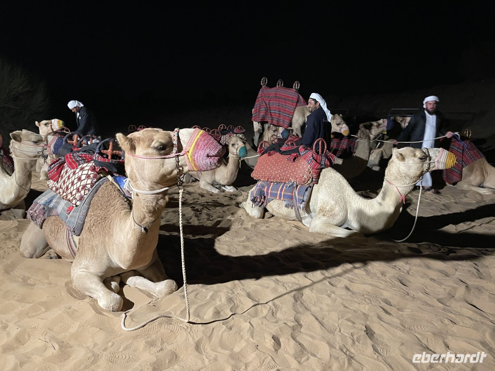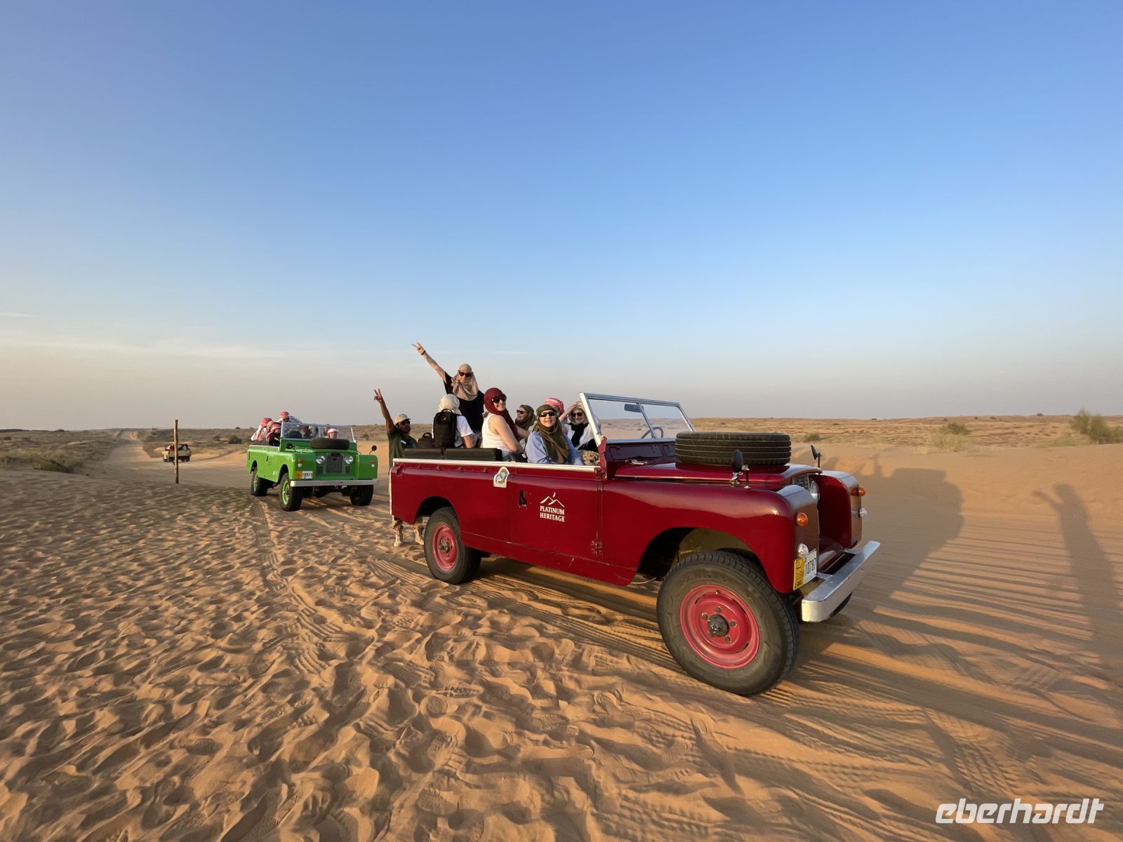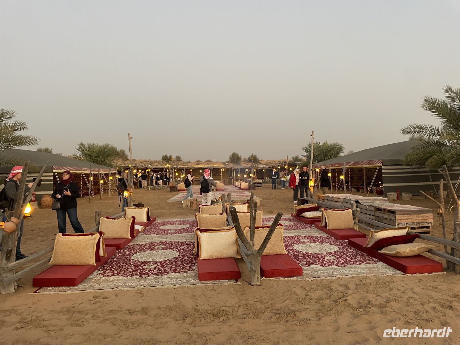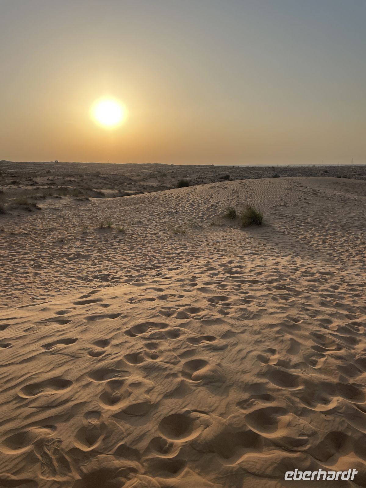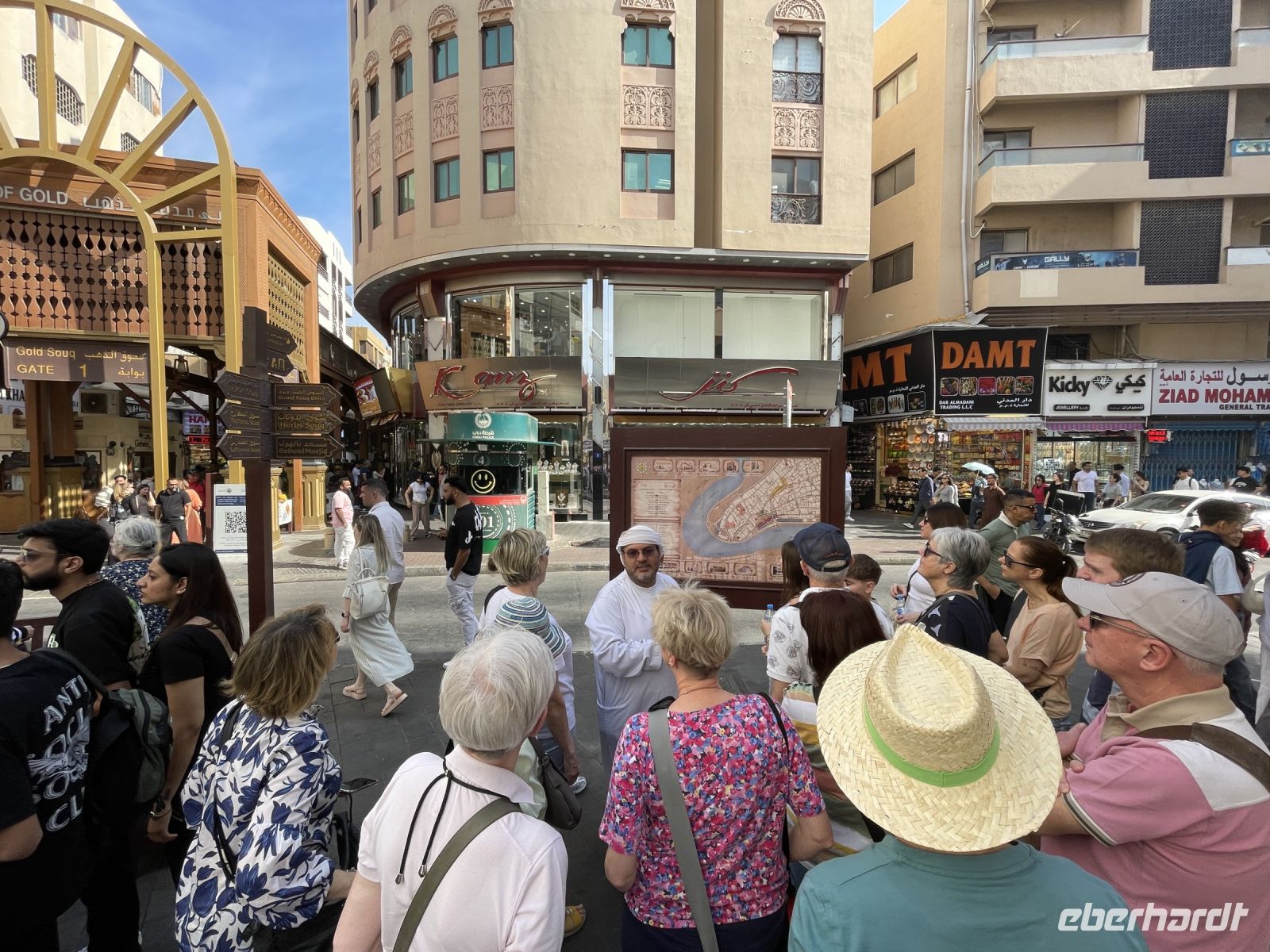 Um 9:30 Uhr starten wir mit unserem Reisebus und Reiseleiter Ibrahim ins alte Viertel „Al Sharif“, das nach historischen Vorbildern nachgebaut wurde. Hier spazieren wir durch die Gassen und besichtigen unter anderem die digitale Polizeistation. Kurz danach setzen wir unsere Tour mit dem Bus fort und fahren zum Dubai Creek, wo wir mit einem traditionellen Abra-Boot über den Fluss übersetzen. Auf der anderen Seite angekommen, schlendern wir über den Goldmarkt und Gewürzmarkt. Anschließend fahren wir zurück ins Hotel, wo wir von 13:00 bis 14:45 Uhr Freizeit genießen. Viele entspannen sich am Pool und essen eine Kleinigkeit. Um 14:45 Uhr treffen wir uns wieder in der Lobby, doch der Bus für die Wüstensafari hat eine Panne. Nach einer kurzen Wartezeit organisiert der Wüstentour-Veranstalter mehrere Taxis und wir fahren schließlich doch noch in Richtung Wüste. Vor Ort verpassen wir zum Glück nichts und starten gemeinsam mit offenen Jeeps zu den Sanddünen. Zunächst genießen wir den Sonnenuntergang und knipsen zahlreiche Fotos im Sand, bevor es weitergeht. Danach erreichen fahren wir zur Falkenshow, wo wir die Falken im Jagdflug bestaunen können. Anschließen erreichen wir unser Wüstencamp, wo wir auf Kamelen eine Runde drehen und wieder tolle Fotos knipsen können. Nun haben wir alle Hunger und freuen und auf das schmackhafte arabische Abendessen. Es gibt eine kleine Auswahl an Salaten und eine große Fleischauswahl. Zum Abschluss gibt es Obst und Sesambällchen. Die anschließende Musikeinlage genießen wir mit einer Wasserpfeife im liegen auf alten Perserteppichen. Gegen 22:30Uhr erreichen wir wieder unser Hotel.