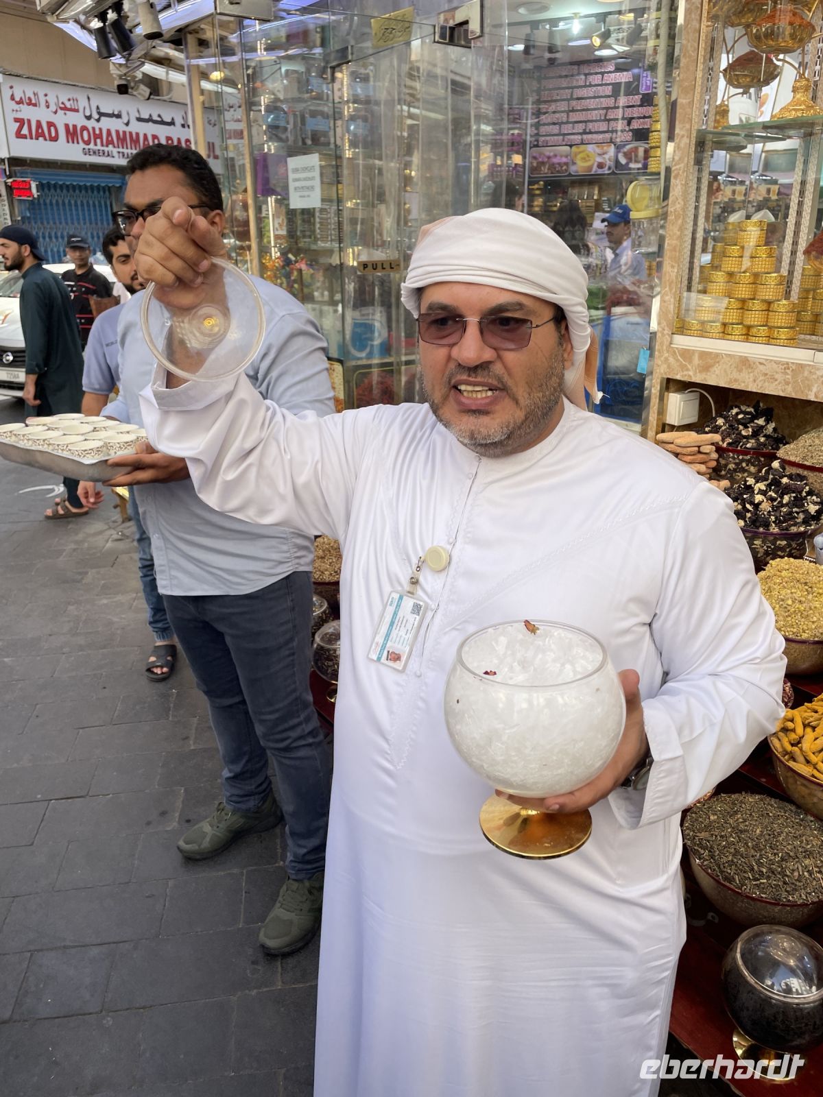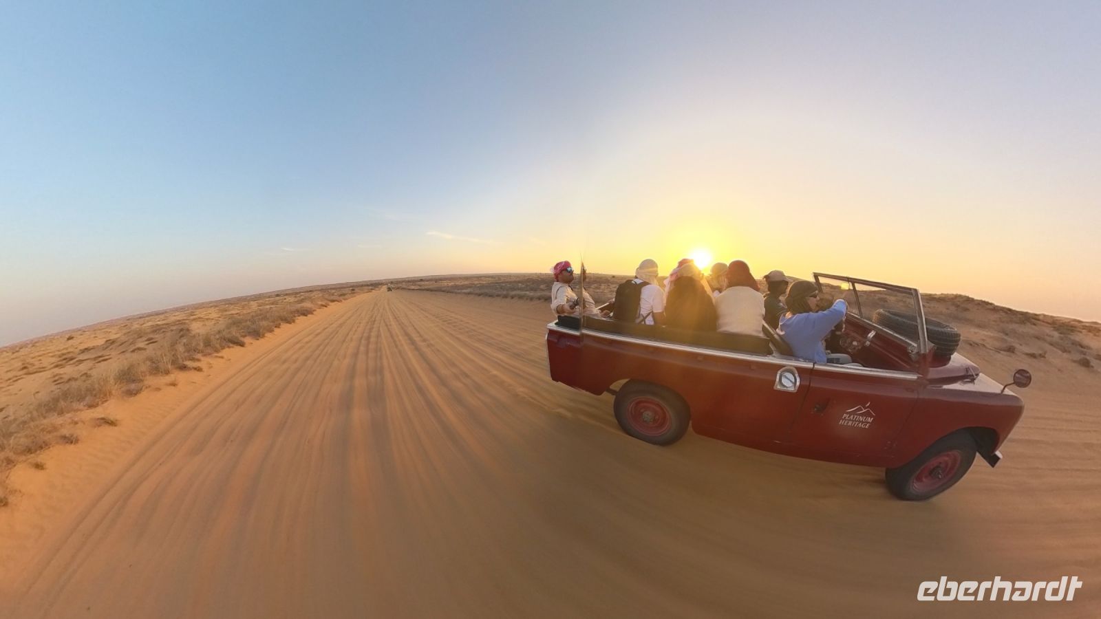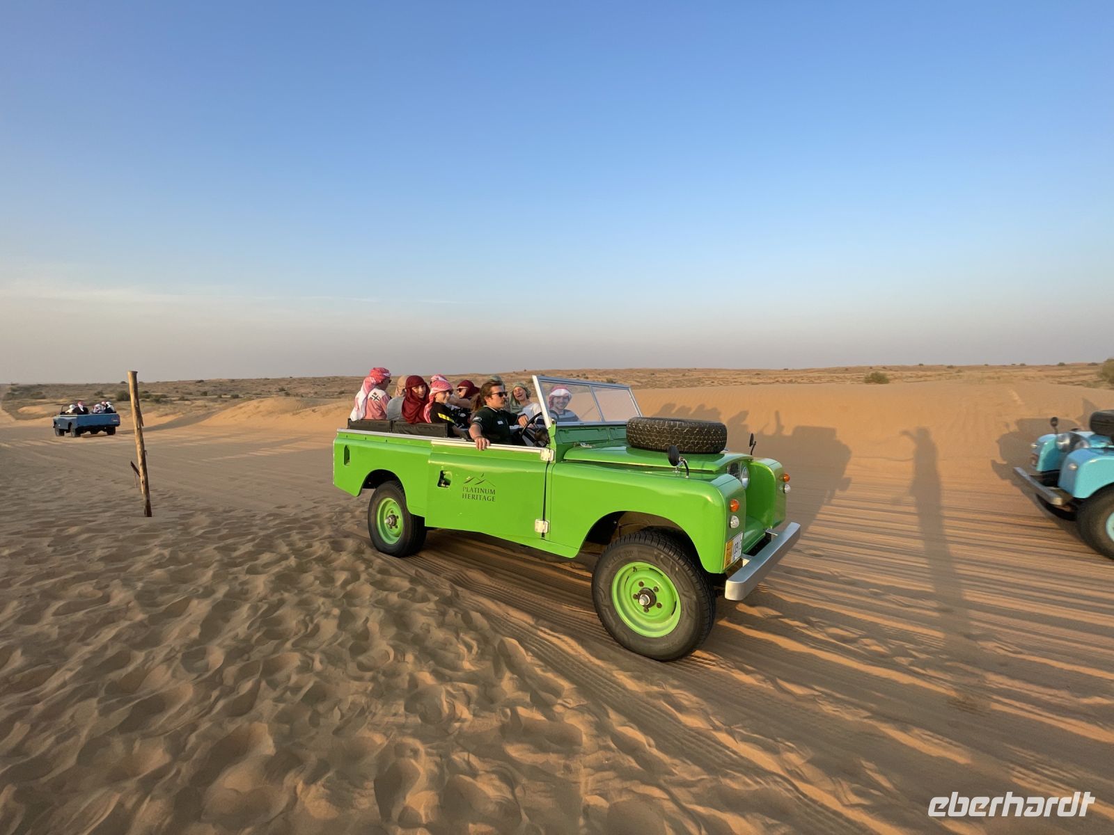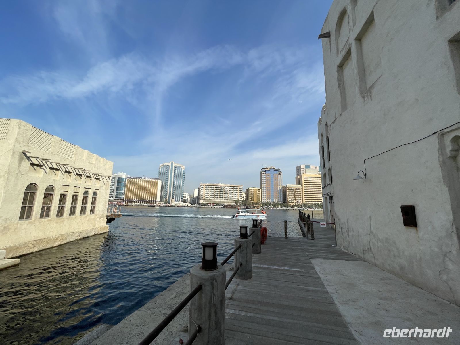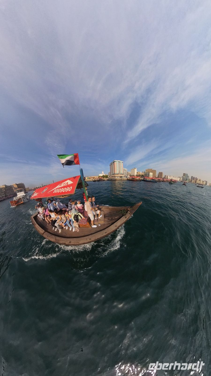 Um 9:30 Uhr starten wir mit unserem Reisebus und Reiseleiter Ibrahim ins alte Viertel „Al Sharif“, das nach historischen Vorbildern nachgebaut wurde. Hier spazieren wir durch die Gassen und besichtigen unter anderem die digitale Polizeistation. Kurz danach setzen wir unsere Tour mit dem Bus fort und fahren zum Dubai Creek, wo wir mit einem traditionellen Abra-Boot über den Fluss übersetzen. Auf der anderen Seite angekommen, schlendern wir über den Goldmarkt und Gewürzmarkt. Anschließend fahren wir zurück ins Hotel, wo wir von 13:00 bis 14:45 Uhr Freizeit genießen. Viele entspannen sich am Pool und essen eine Kleinigkeit. Um 14:45 Uhr treffen wir uns wieder in der Lobby, doch der Bus für die Wüstensafari hat eine Panne. Nach einer kurzen Wartezeit organisiert der Wüstentour-Veranstalter mehrere Taxis und wir fahren schließlich doch noch in Richtung Wüste. Vor Ort verpassen wir zum Glück nichts und starten gemeinsam mit offenen Jeeps zu den Sanddünen. Zunächst genießen wir den Sonnenuntergang und knipsen zahlreiche Fotos im Sand, bevor es weitergeht. Danach erreichen fahren wir zur Falkenshow, wo wir die Falken im Jagdflug bestaunen können. Anschließen erreichen wir unser Wüstencamp, wo wir auf Kamelen eine Runde drehen und wieder tolle Fotos knipsen können. Nun haben wir alle Hunger und freuen und auf das schmackhafte arabische Abendessen. Es gibt eine kleine Auswahl an Salaten und eine große Fleischauswahl. Zum Abschluss gibt es Obst und Sesambällchen. Die anschließende Musikeinlage genießen wir mit einer Wasserpfeife im liegen auf alten Perserteppichen. Gegen 22:30Uhr erreichen wir wieder unser Hotel.