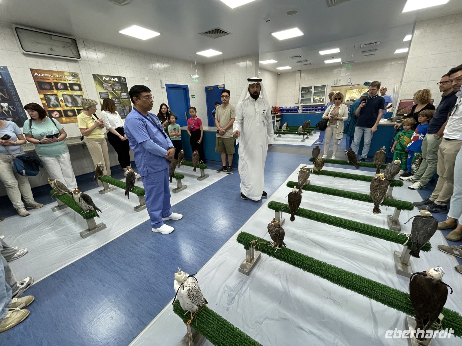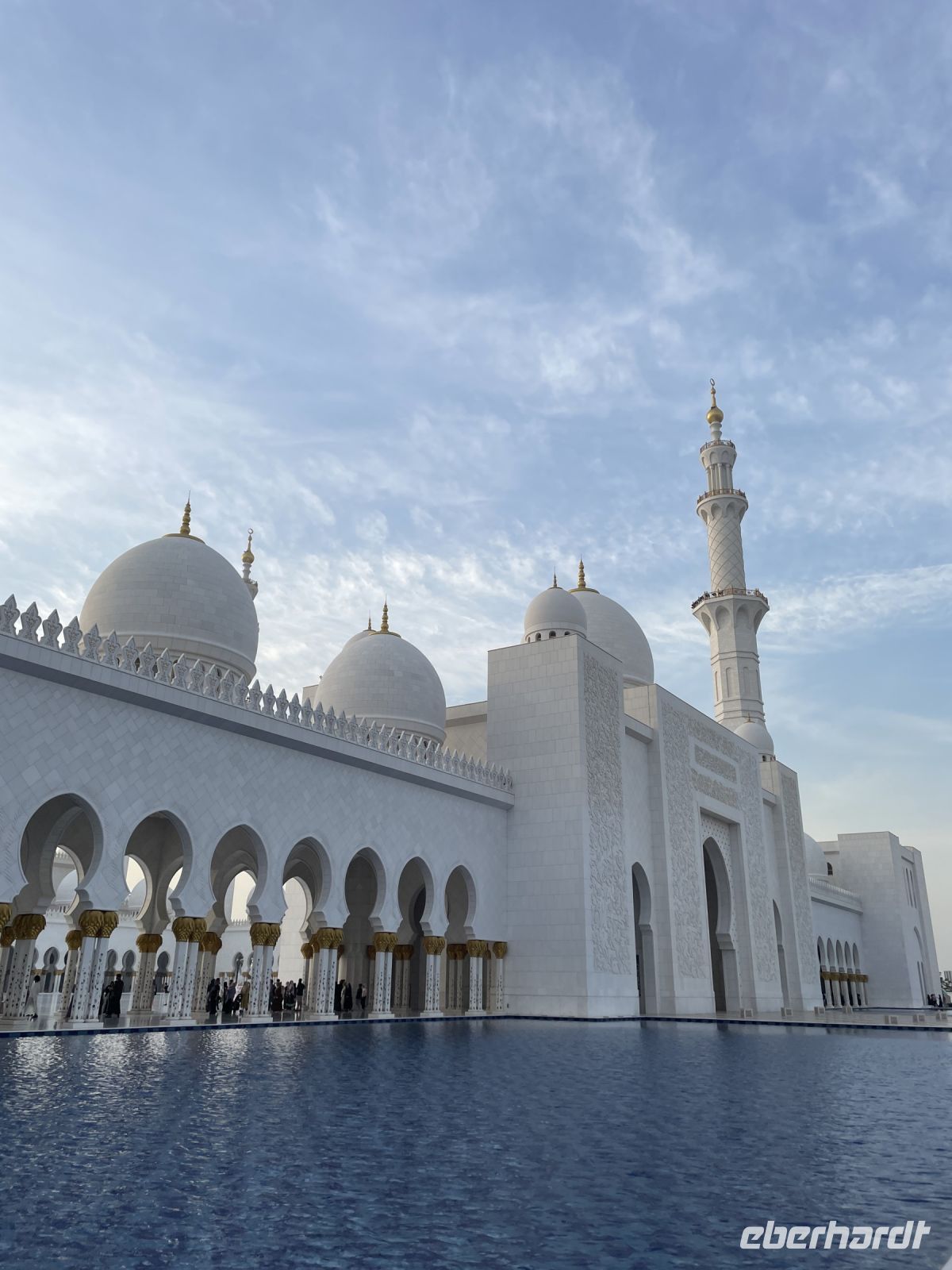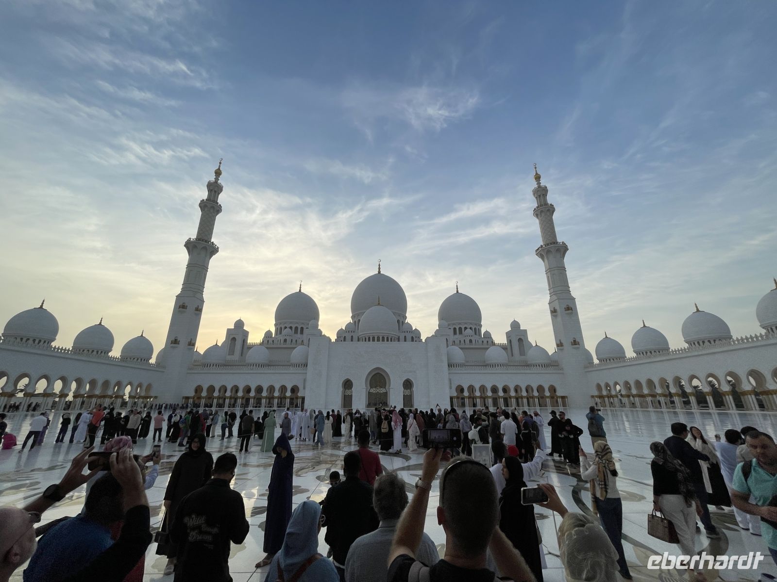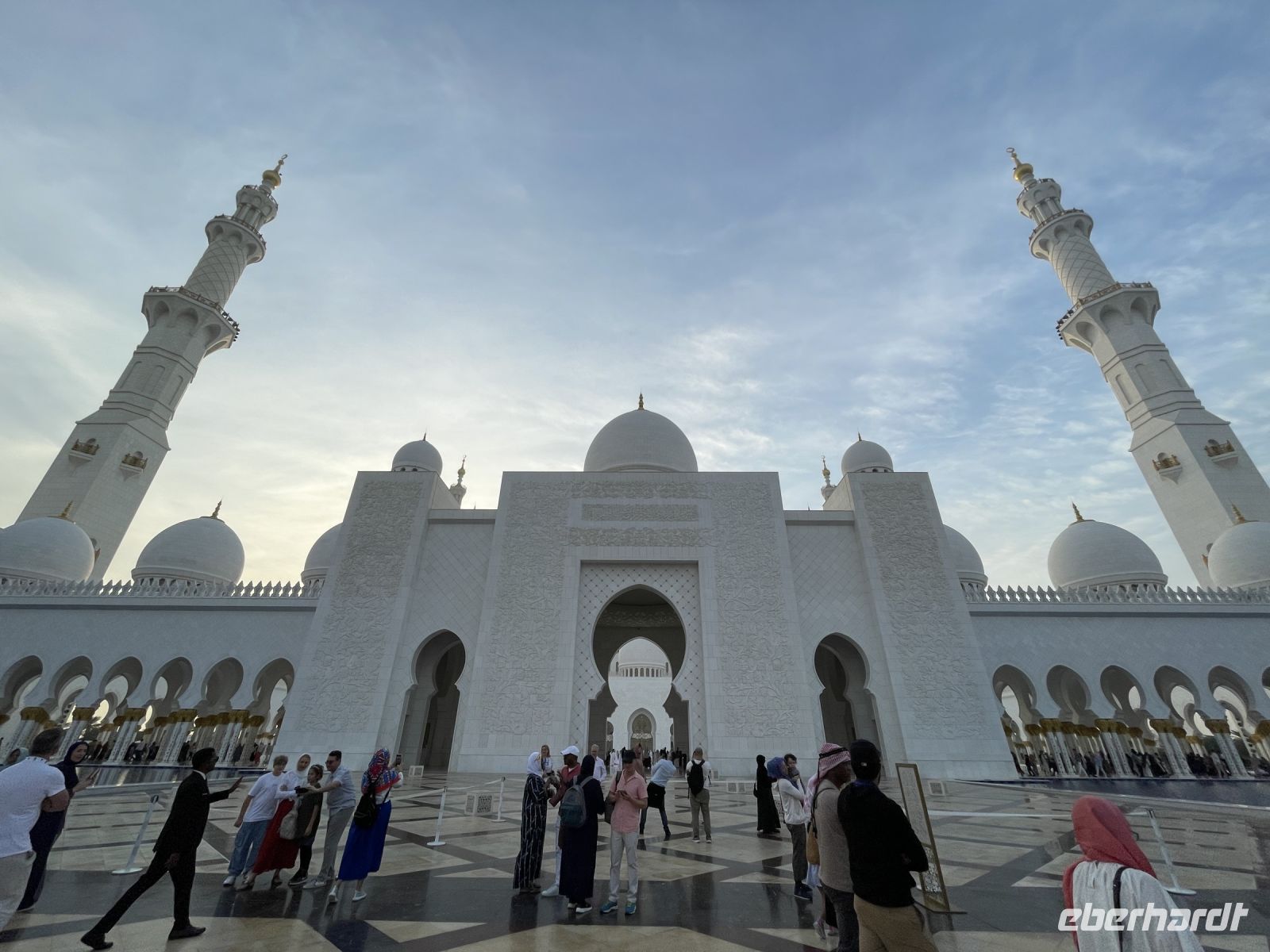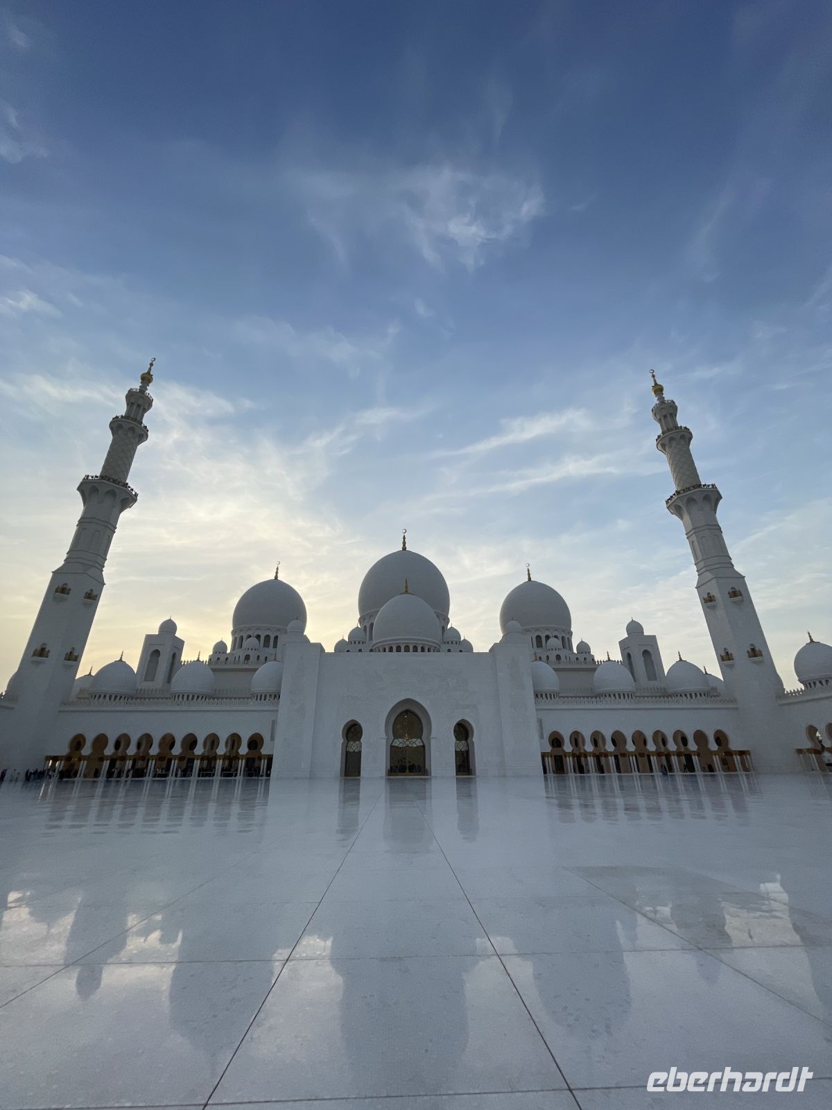 Nach dem Frühstück, brechen wir heute bereits um 8:00 Uhr auf. Gegen 9:50 Uhr erreichen wir die „Falkenklinik“ in Abu Dhabi, gegründet von Frau Dr. Müller – einer deutschen Tierärztin. Vor Ort werden wir vom Gästeführer Hasan herzlich begrüßt und durch die Klinik geführt. Wir dürfen sogar bei einer Routineuntersuchung über die Schultern schauen und erhalten dabei Erklärungen von den Tierpflegern. Anschließend besichtigen wir die Käfiganlagen der Falken sowie ein kleines Museum, in der man die Möglichkeit hat Fotos mit den Falken zu knipsen. Nach diesen einmaligen Eindrücken geht es zurück weiter Abu Dhabi. Um 12:50 Uhr stoppen wir für einen Fotostopp am Louvre Abu Dhabi. Anschließend fahren wir entlang der Corniche zum „Emirates Palace Hotel“, wo wir an einer stilvollen Teestunde teilnehmen. Wir genießen Kaffee oder Tee sowie feine Schnittchen und mit Gold belegte Törtchen in festlicher Atmosphäre. Danach setzen wir unsere Tour fort und fahren zur „Scheich-Zayid-Moschee“. Dort müssen alle Gäste lange Hosen und bedeckte Schultern tragen, die Damen zusätzlich ein Kopftuch. Reiseleiter Ibrahim verteilt die Tickets, und wir passieren gemeinsam die Sicherheitskontrolle. Danach erkunden wir die Moschee individuell.