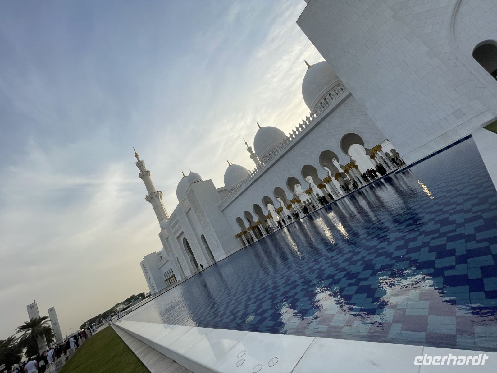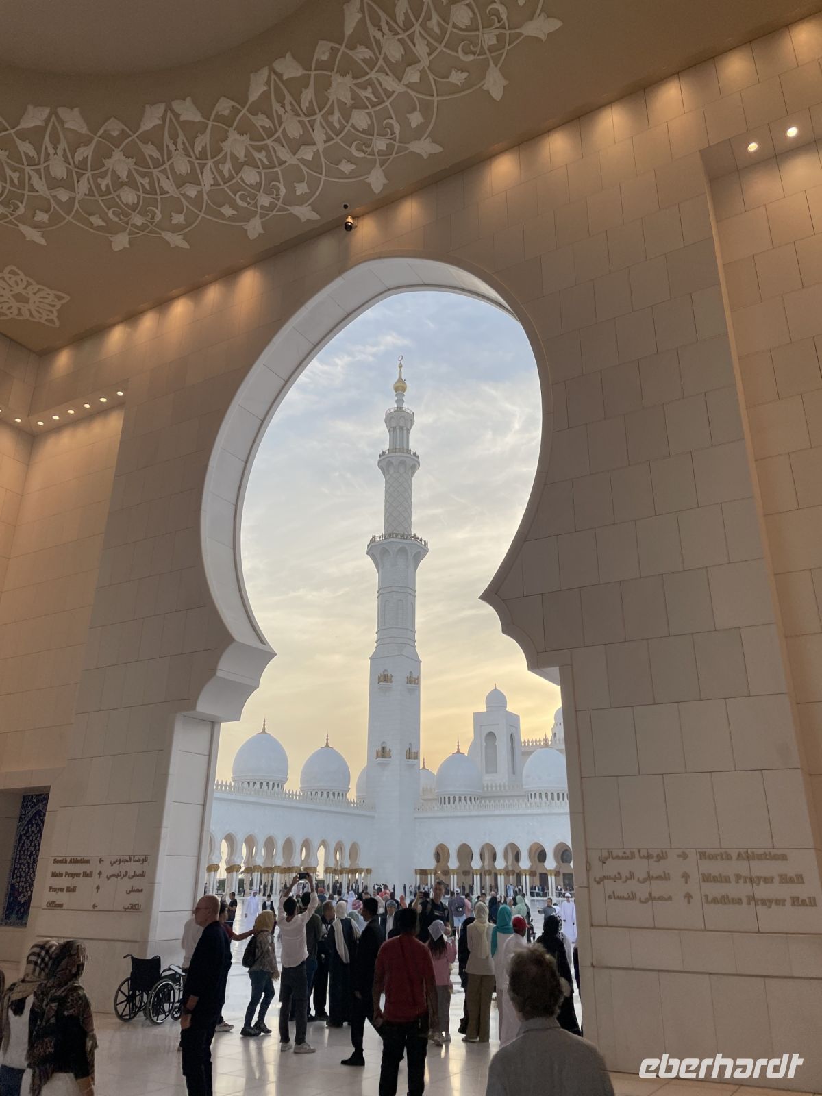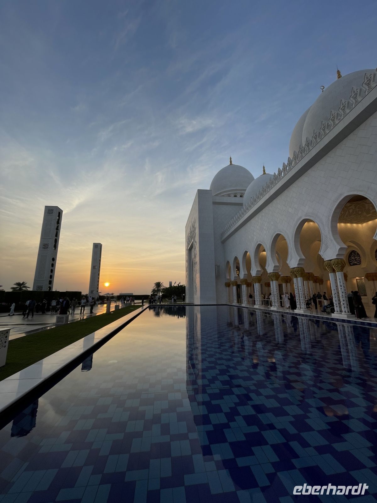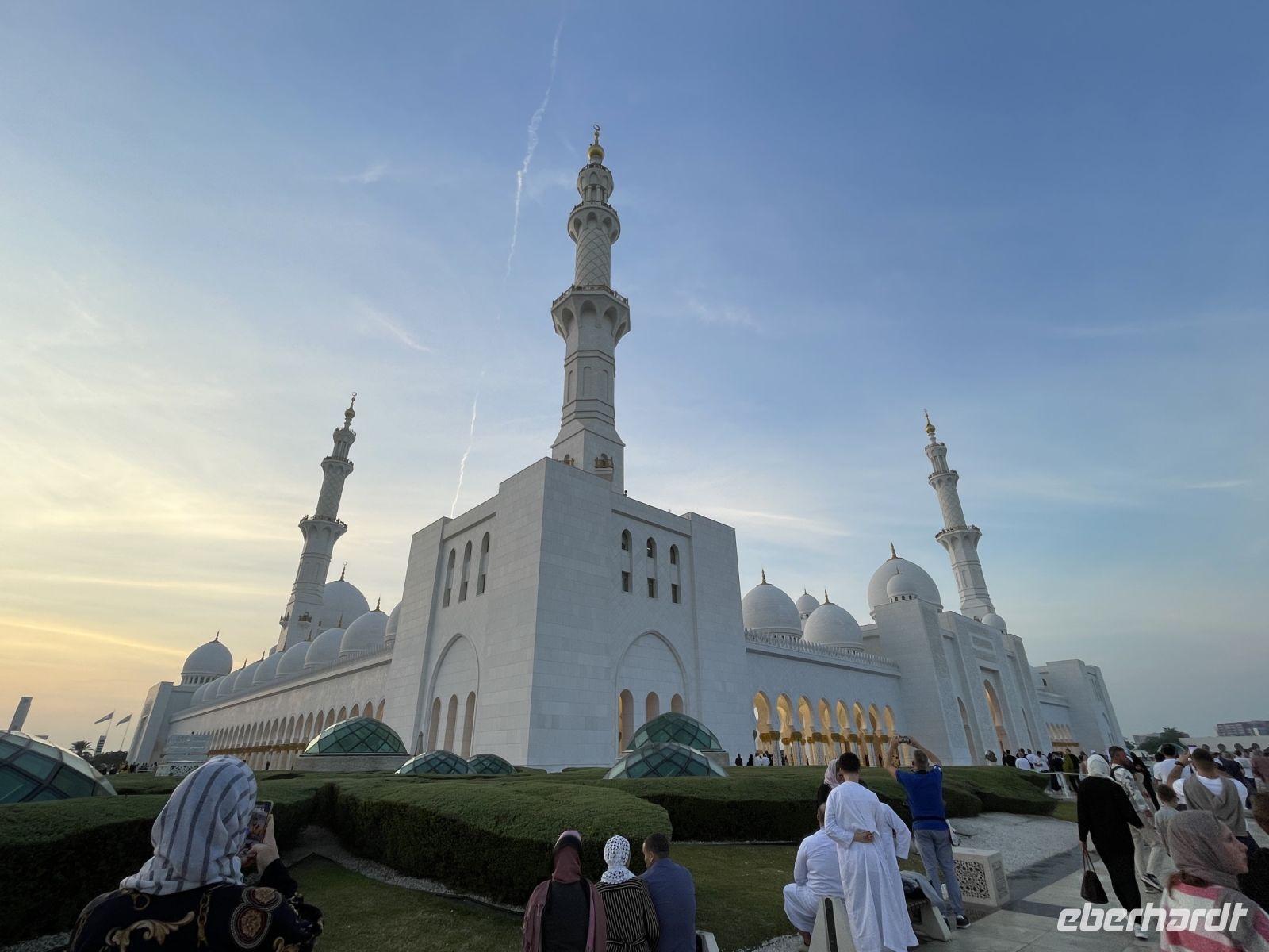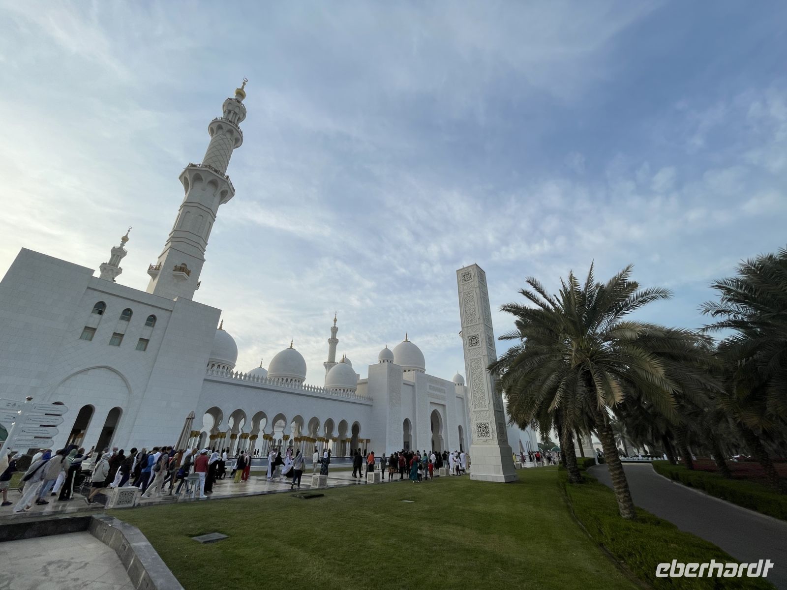 Nach dem Frühstück, brechen wir heute bereits um 8:00 Uhr auf. Gegen 9:50 Uhr erreichen wir die „Falkenklinik“ in Abu Dhabi, gegründet von Frau Dr. Müller – einer deutschen Tierärztin. Vor Ort werden wir vom Gästeführer Hasan herzlich begrüßt und durch die Klinik geführt. Wir dürfen sogar bei einer Routineuntersuchung über die Schultern schauen und erhalten dabei Erklärungen von den Tierpflegern. Anschließend besichtigen wir die Käfiganlagen der Falken sowie ein kleines Museum, in der man die Möglichkeit hat Fotos mit den Falken zu knipsen. Nach diesen einmaligen Eindrücken geht es zurück weiter Abu Dhabi. Um 12:50 Uhr stoppen wir für einen Fotostopp am Louvre Abu Dhabi. Anschließend fahren wir entlang der Corniche zum „Emirates Palace Hotel“, wo wir an einer stilvollen Teestunde teilnehmen. Wir genießen Kaffee oder Tee sowie feine Schnittchen und mit Gold belegte Törtchen in festlicher Atmosphäre. Danach setzen wir unsere Tour fort und fahren zur „Scheich-Zayid-Moschee“. Dort müssen alle Gäste lange Hosen und bedeckte Schultern tragen, die Damen zusätzlich ein Kopftuch. Reiseleiter Ibrahim verteilt die Tickets, und wir passieren gemeinsam die Sicherheitskontrolle. Danach erkunden wir die Moschee individuell.