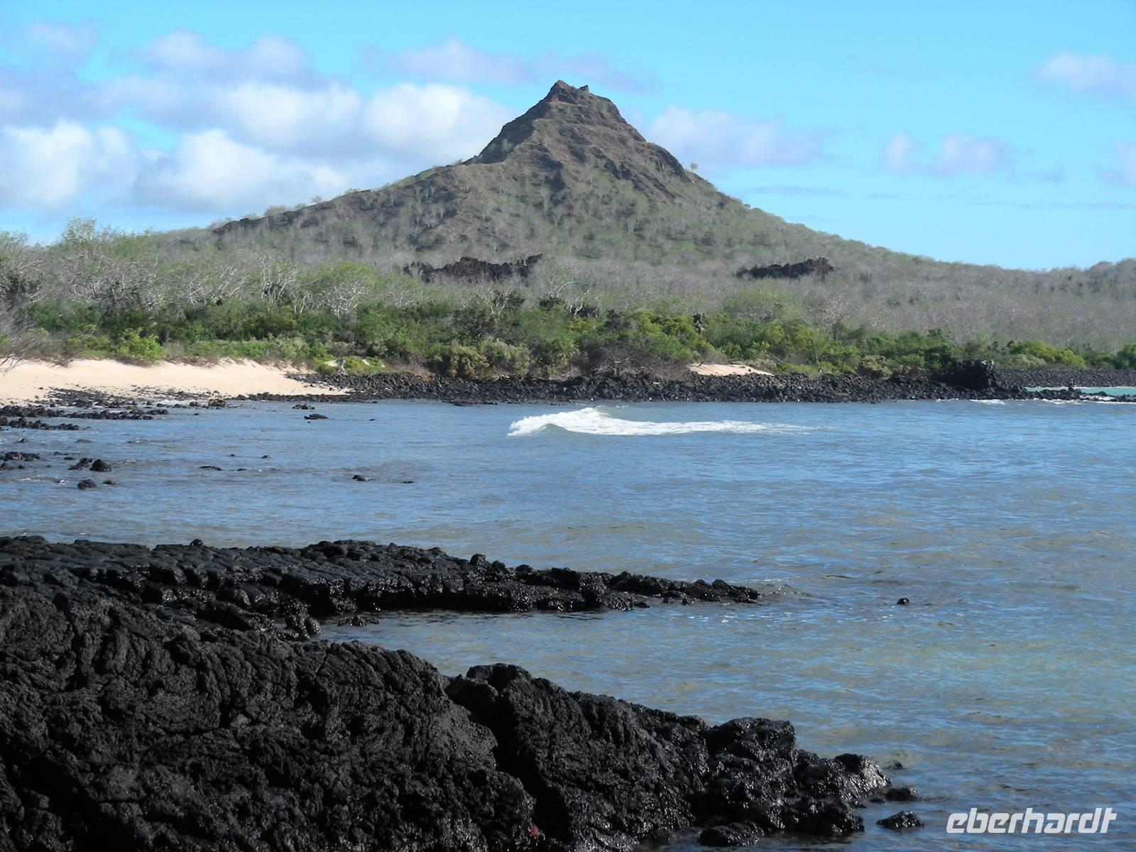 Früh setzt die Yacht über nach Sombrero Chino und ankert dort im Kanal. Die Überfahrt ist ruhig. Wir gehen mit einer nassen Landung um 7.15 an Land und erkunden das Inselchen. Erstmals haben wir nun die Galapagos Tomate und auch kleinere Meeresechsen. Nach rückkehr zum Boot Gelegenheit zum Schwimmen und um 11.00 Uhr fährt die „Angelito" nach Bartholomé. Der Seegang ist mäßig. 14.30 geht es mit einer trockenen Landung auf die Insel. Hier geht es um die phantastische Landschaft und die Botanik. Die Aussicht von oben ist sehr gut. Nach Rückkehr zu den Pangas machen wir eine kurze Pangafahrt entlang der Küste und finden auch einige Pinguine sowie einen Trupp Wellenläufer, den wir auf kurze Distanz beim Planktonfressen beobachten können.