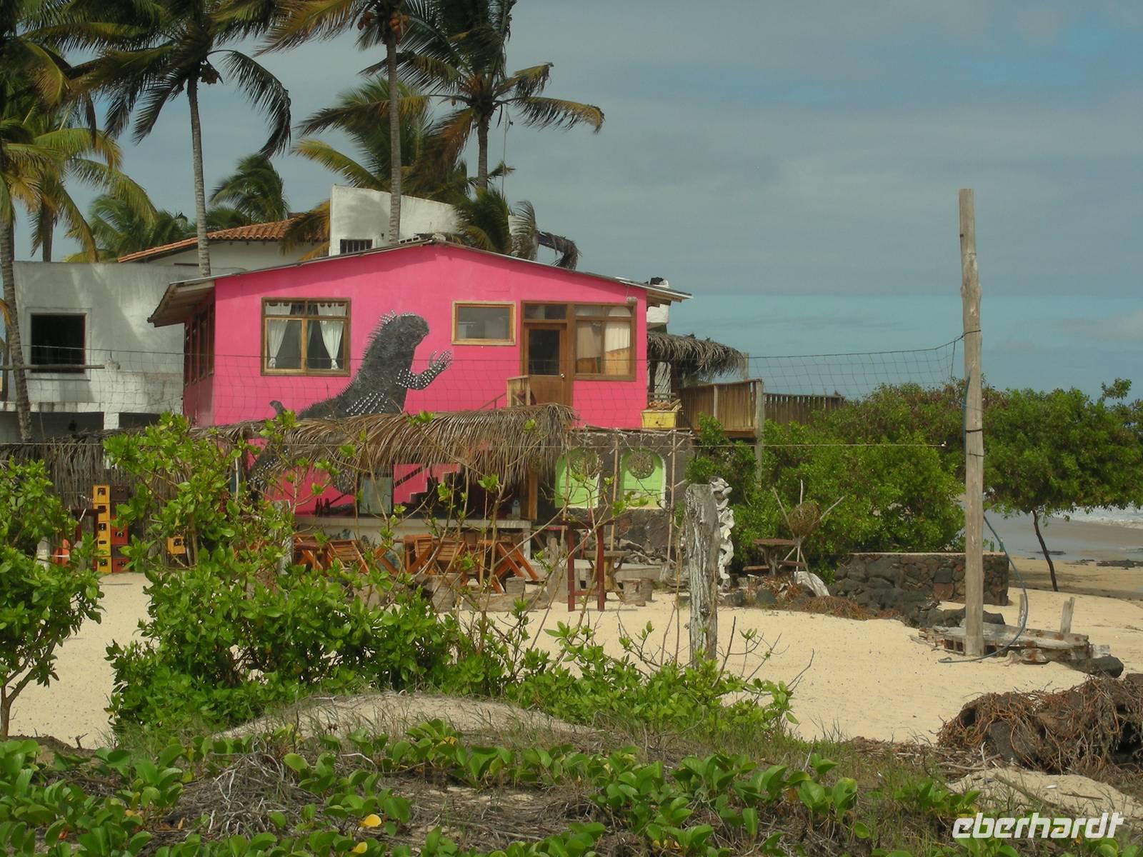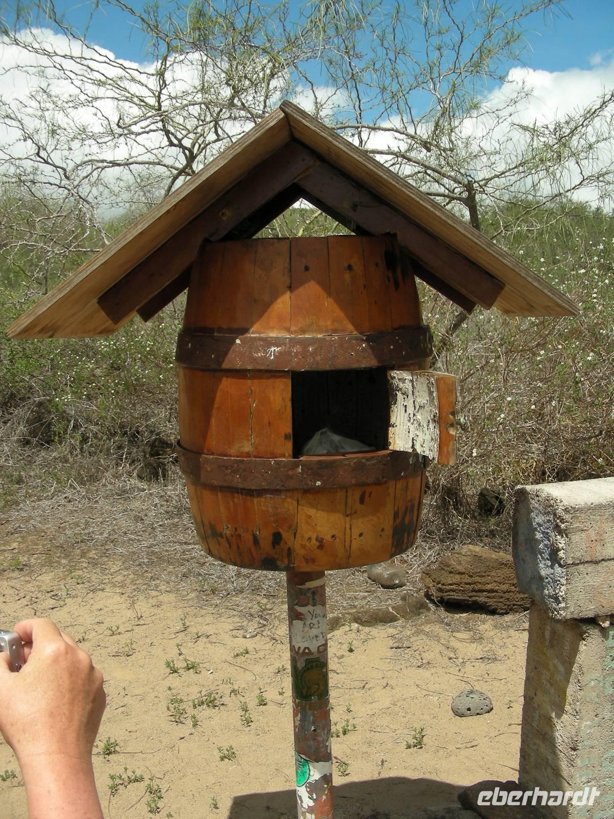 Nachts fährt die „Angelito" nach Floreana - in ziemlich rauer See. Der Passat ist eben voll da und bringt eine gute Dünung mit. Erst im Windschatten von Floreana wird es ruhiger. Wir booten um 07.00 Uhr aus - eine nasse Landung. Dann geht es zum Weißen Strand. Dort finden wir zwar keine Schildkröten mehr, dafür aber Stechrochen im Wasser und viel Plastikmüll an Land, den wir z.T. einsammeln: Er kommt aus Peru und Chile und wird hier vom Humboldtstrom angeschwemmt. Auf dem Rückweg gehen wir zum Aussichtspunkt in der Lagune - und erleben die Balz der Flamingoss, die dabei langsam auf uns zu kommen und zum Schluß in weniger als 10 m Abstand von uns balzen: Eine Sternstunde. Retour an Bord verholt die Yacht in die Post Office Bay, wo wir der Posttonne einen Besuch abstatten. Danach geht es direkt nach Santa Cruz/Puerto Ayora. Zum Glück ist die See jetzt ruhiger. Gegen 16.30 kommen wir an und alle haben Freizeit an Land.