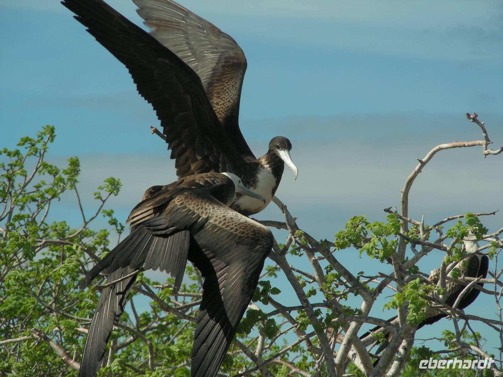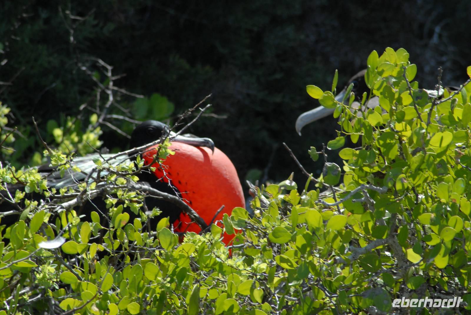 Nachts fährt die „Angelito" durch den Ithabaska Kanal ins Zentrum, wo wir morgens die Insel Daphne major umfahren und uns dabei über die Finken und die bahnbrechenden Forschungen der Grants unterhalten. Gegen 07.30 sind wir im Hafen von Baltra. Die Schweizer gehen von Bord und eine neue Gruppe, alle englisch sprechend, kommt an Bord. Wir verholen vor die Küste von Seymour. Um 14.00 booten wir aus mit einer trockenen Landung. Maja und ich führen jetzt separat, d.h. sie hat die englisch sprechende Gruppe und ich übernehme meine Gruppe komplett, was es für alle einfacher macht. Der Landgang ist einfach ein Traum: Viele Fregattvogel Männchen mit rotem Kehlsack, die Kolonie ist voll in Betrieb. Dazu viele Landleguane und an der Küste Meeresechsen. Der endemische Palo Santo ist grün - ein Gedicht. Gegen 18.00 sind wir wieder an Bord. Die Yacht verholt in eine ruhige Bucht für die Nacht.