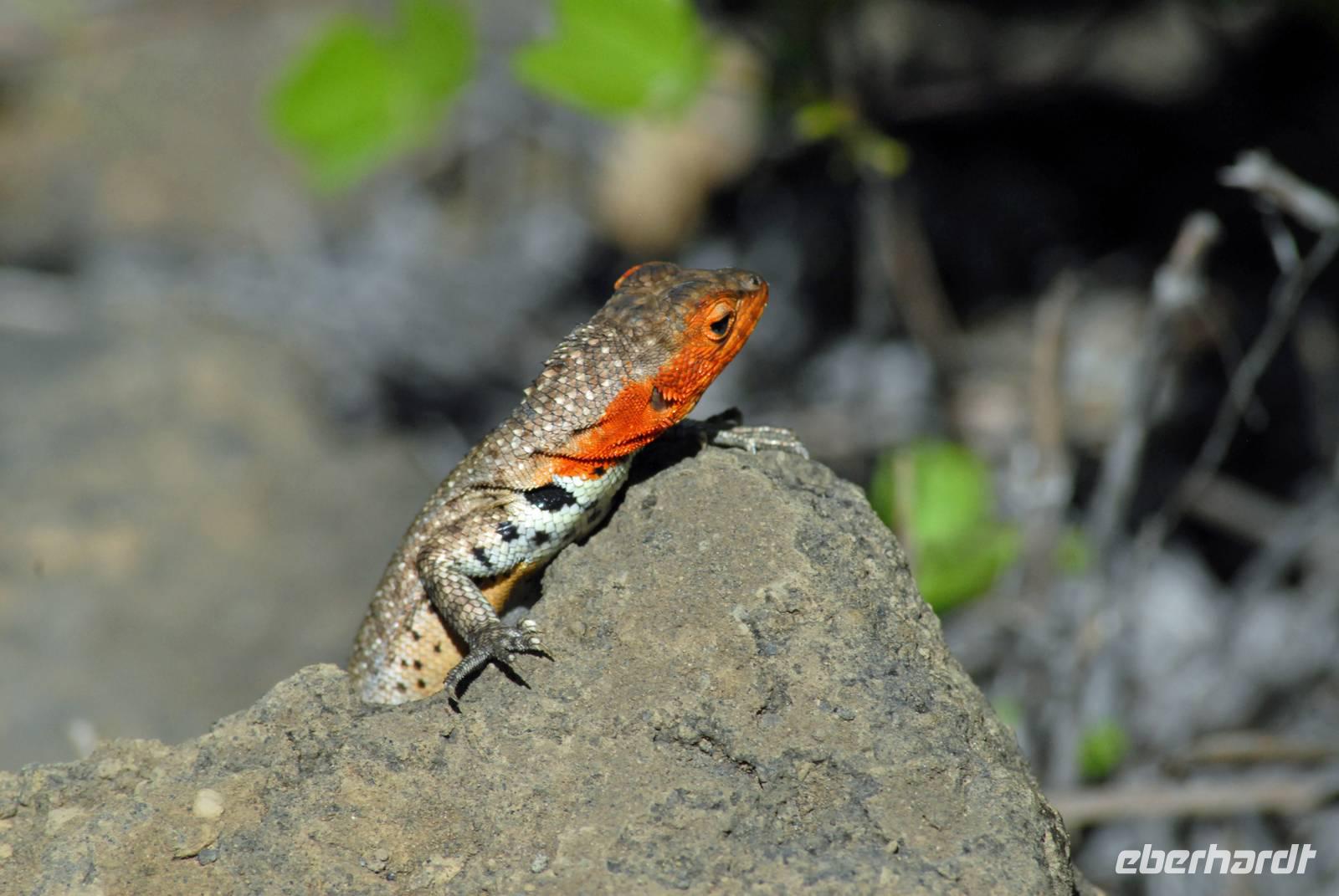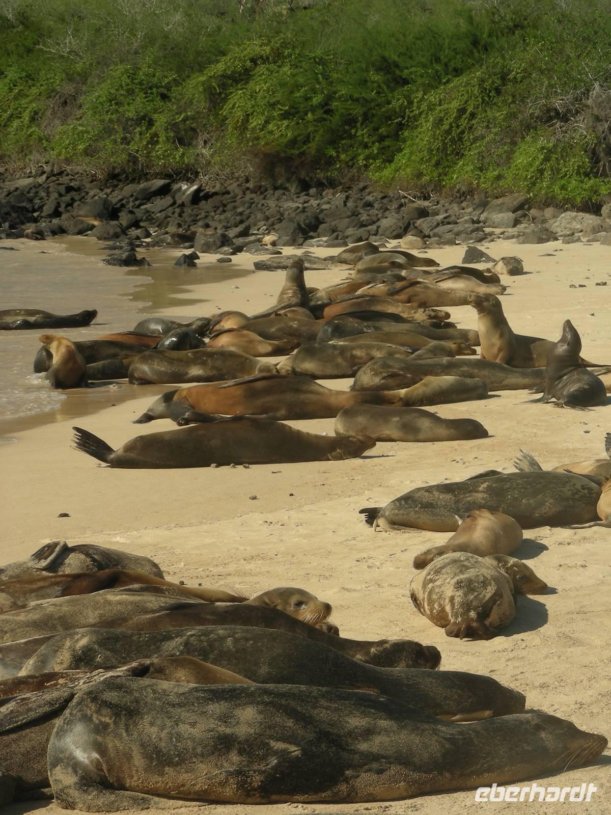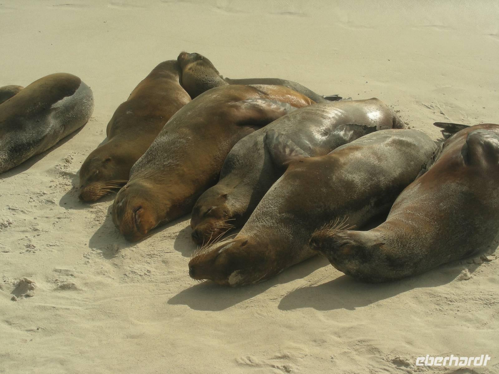 Die Überfahrt nach Santa Fé ist relativ ruhig. Wir haben auf Santa Fé eine nasse Landung um 06.00 Uhr morgens, aber es lohnt sich. Schon wenig später sehen wir eine Schlange auf dem Weg, finden die Santa Fé Landleguane und etliches an Lavaechsen und Robben. Die riesigen Opuntien sind beeindruckend. Nach Rückkehr setzt die „Angelito" über nach Plaza. Die Überfahrt ist relativ ruhig. Um 13.30 gehen wir an Land und stolpern fast über die Masse der Landleguane. Die Insel ist relativ trocken, was heißt, dass das Sesuvium recht rot ist. An der Klippe beobachten wir wieder lange die Hochseevögel und gehen dann zum „Ruheheim" der Seelöwenbullen. Gegen 15.30 sind wir retour an Bord und die „Angelito" fährt in den Kanal zum Verproviantieren für die Folgewoche.