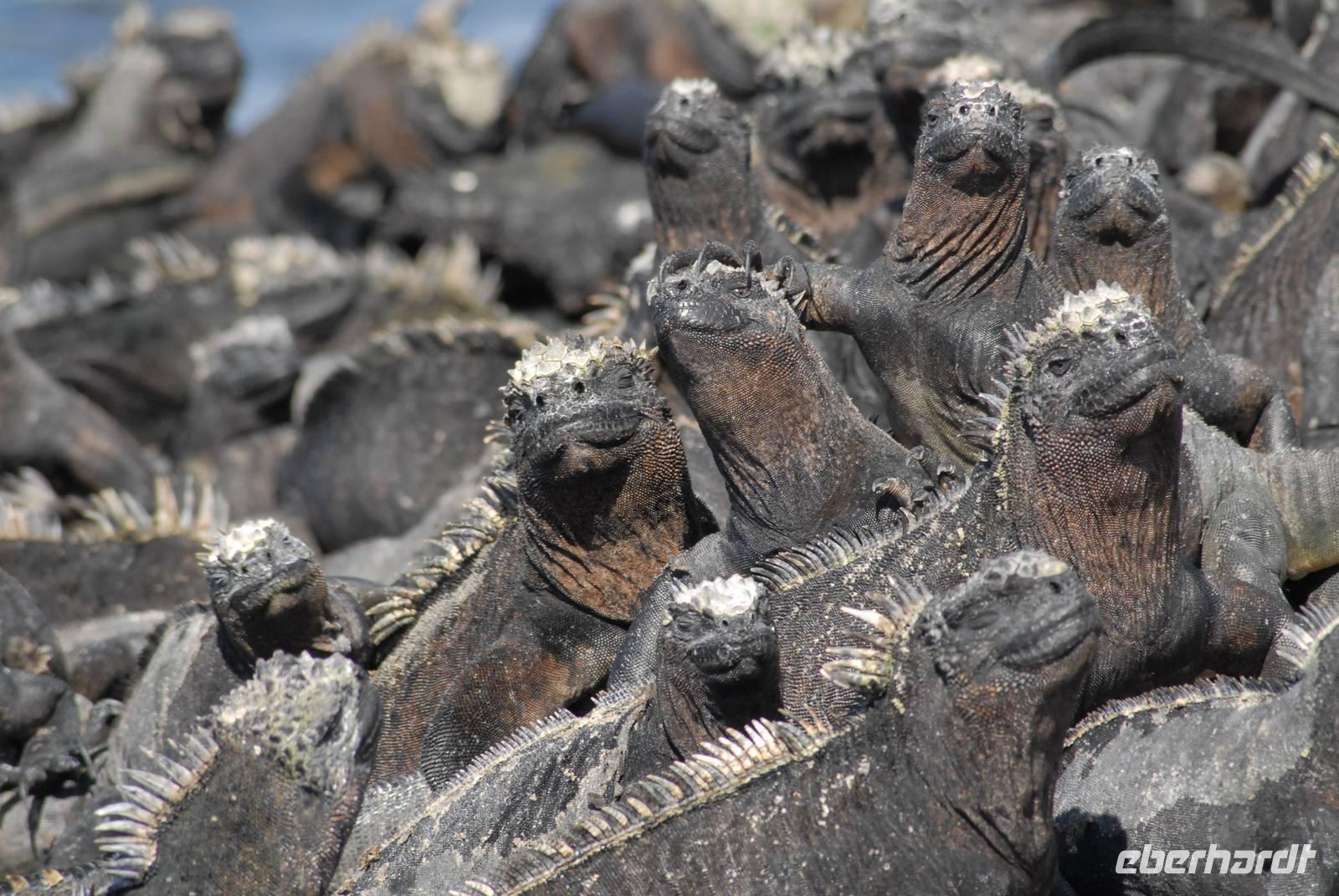 Um 14.00 Uhr gehen wir mit einer trockenen Landung an Land, müssen aber nach wenigen Metern durch die Mangroven und schenkelhoch durch Wasser, um dann endgültig an Land zu kommen. Dort erwarten uns buchstäblich Hunderte von großen Meeresechsen, Seelöwen, Kanadareiher und die flugunfähigen Kormorane. Dieser Landepunkt ist einer der schönsten in Galapagos. Wir bleiben bis fast 18.00 an Land, beobachten und genießen die Tierwelt und die Aussichten - ein Traumpunkt! Nachts bleibt die „Angelito" hier vor Anker liegen, verholt dann am frühen Morgen nach Urbina Bay/Isabela.