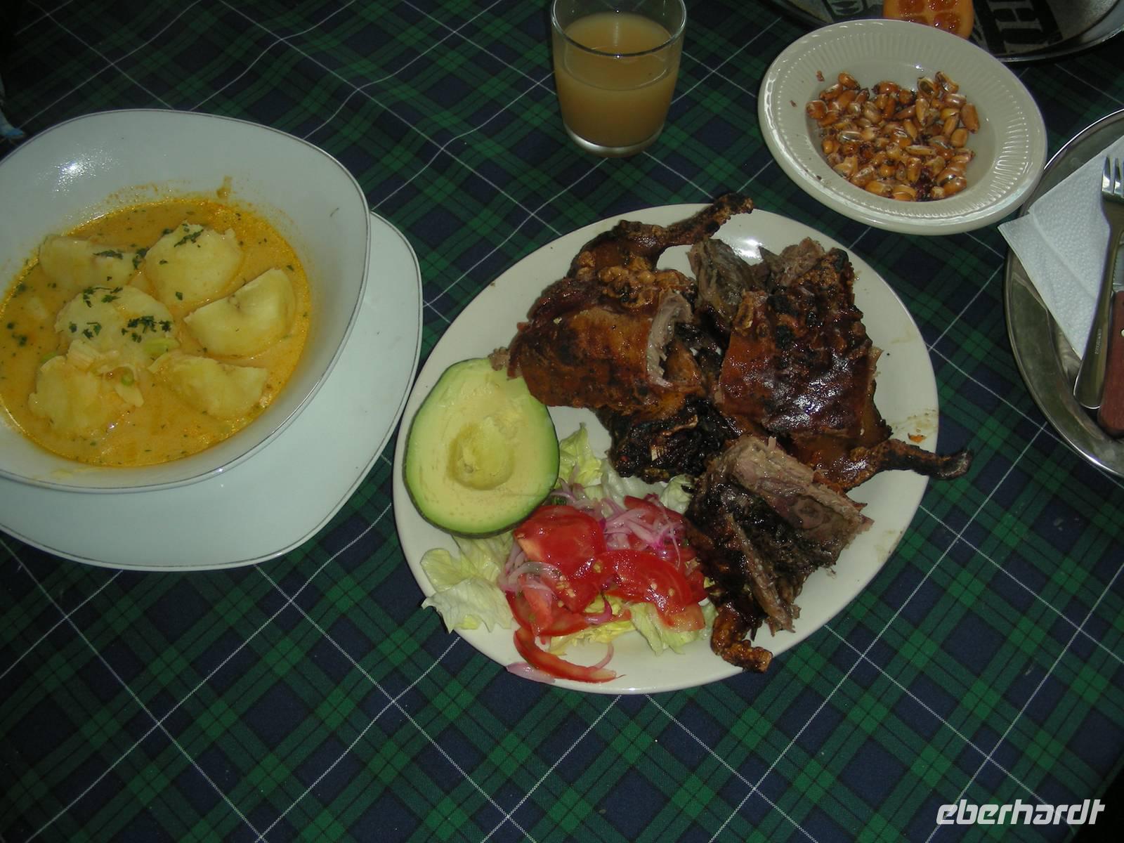 Um 08.00 geht es los, zunächst zum Pululaua Krater am Äquator, also nördlich von Quito. Er ist frühmorgens meist noch offen, wie heute auch, und bietet grandiose Ausblicke - und eine gute Botanik. Nach dem Besuch fahren wir ein kurzes Stück Richtung Äquatordenkmal und Inti-Nan, halten aber zunächst an einer Cuyeria an. Dort kaufe ich ein Meerschweinchen, natürlich schön gebraten und mit Soße. Was wir probieren. Allerdings waren 2 Gäste schon satt beim Hinschauen. Den anderen hat es geschmeckt - immerhin sind Meerschweinchen eine wichtige Proteinquelle im Andenhochland - dafür wurden sie ja auch gezüchtet! Anschließend geht's erst in das „echte" Äquatormuseum Inti-Nan, wo wir einen interessanten Rundgang mit Versuchen machen. Danach folgt dann der obligatorische Gang zum bekannten Äquatordenkmal im benachbarten Museum - was leider eben nicht auf dem Äquator liegt.