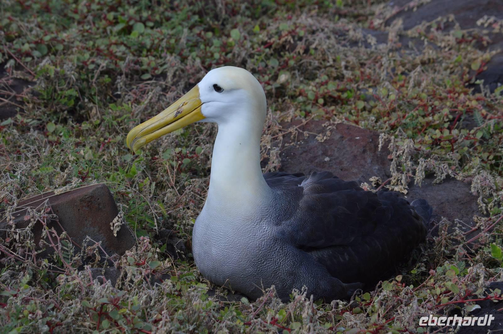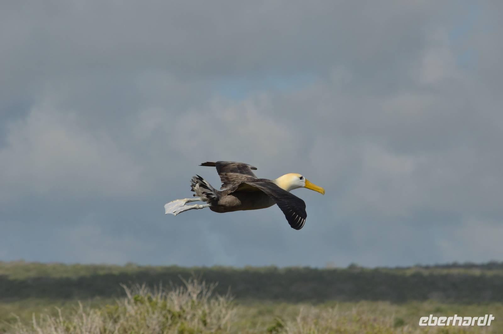Um 14.00 erfolgt die trockene Landung, aber es ist wegen der am Kap stehenden hohen Wellen nicht ganz einfach. Auch hier sehen wir die massiven Veränderungen durch die Wellen der letzten Tage: Der eigentlich Sandstrand ist nahezu komplett verschwunden, die Strandvegetation hochgerissen, große Korallenblöcke liegen weit hinten auf dem Geröll… es muß hier ziemlich gefetzt haben! Der Landgang entpuppt sich als wahnsinnig intensiv und sehr gut. Überall sind die roten Meeresechsen, die Seelöwen, die Espaniola Lavaechsen. Im „Albatrossland“ angekommen stolpert man förmlich über die Albatrosse und an der Klippenkante vorn steht ein ziemlicher Wind. Das bedeutet: Flugtag für die Hochseevögel! Die Kameras laufen förmlich heiß: Tropikvögel, Albatrosse, Blaufuß-, Naszca- und ein Brauntölpel in der Luft, dazu Audubon Sturmvögel, Gabelschwanzmöwen. Es war einfach phantastisch. Das Blowhole zeigte auch, was in ihm steckte, denn von Süden her rollte eine ziemliche Dünung an, die das Wasser durch das Blowhole sehr hoch drückte. Auf dem Rückweg entlang der Küste finden wir Meeresechsen bei der Eiablage. Die Nazcatölpel haben Junge - einfach ein Traum, diese Insel und ein grandioser Abschluß des Besuchs der großen Inseln.