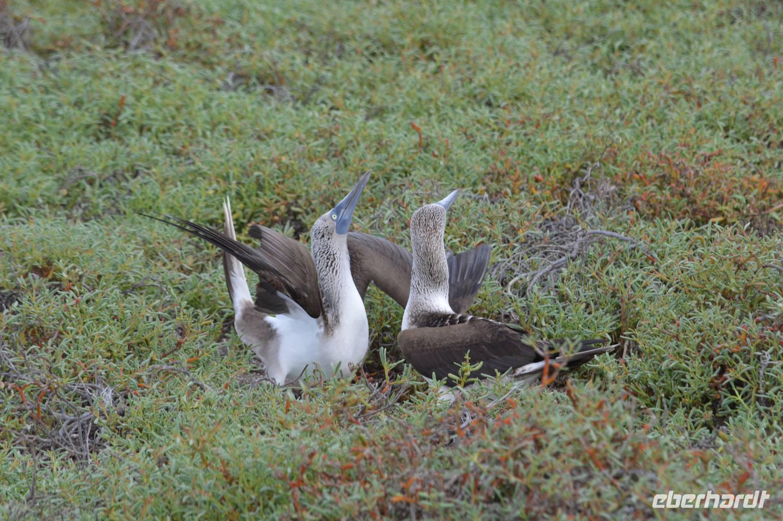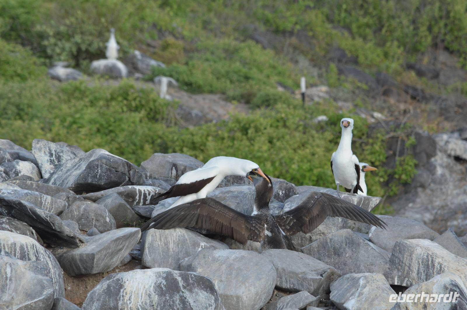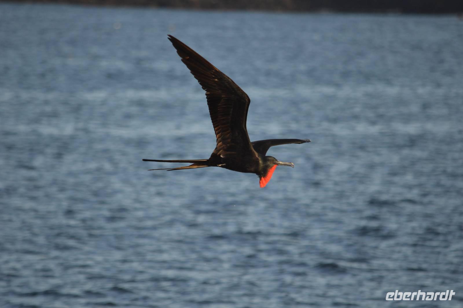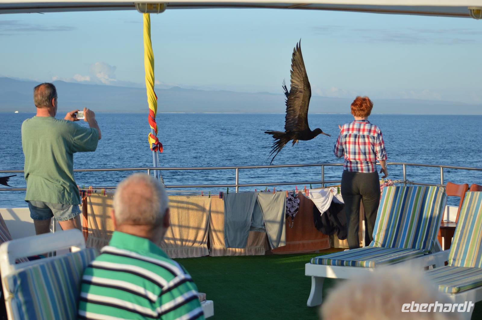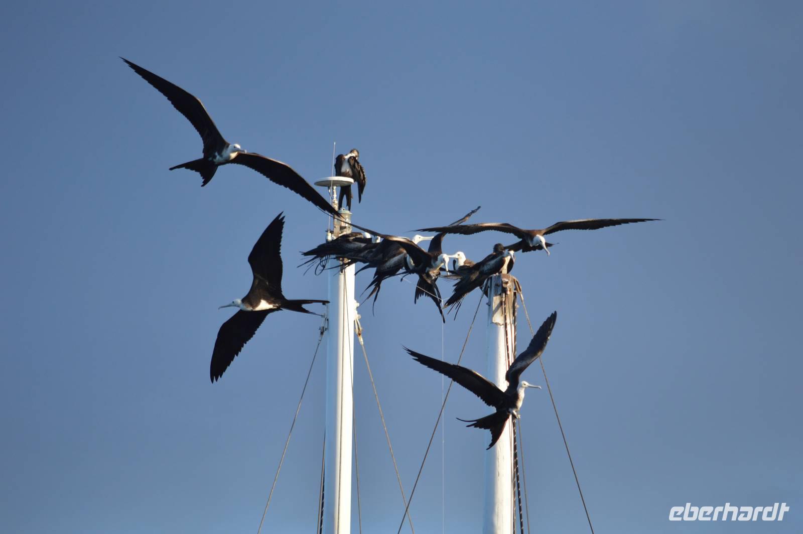 14.00: Die trockene Landung in Seymour ist nicht ganz einfach, aber machbar und es hat sich gelohnt, aber wie! Die Fregattvogelkolonie ist voll in Betrieb. Überall balzende, brütende und einfliegende Vögel. Dazu jede Menge Landleguane, balzende Blaufußtölpel und Limicolen. Die Beobachtungen sind einfach nur noch sagenhaft. Erst gegen 17.15 können wir uns trennen und gehen zurück an Bord. Wir verholen für die Nacht in eine ruhige Bucht.