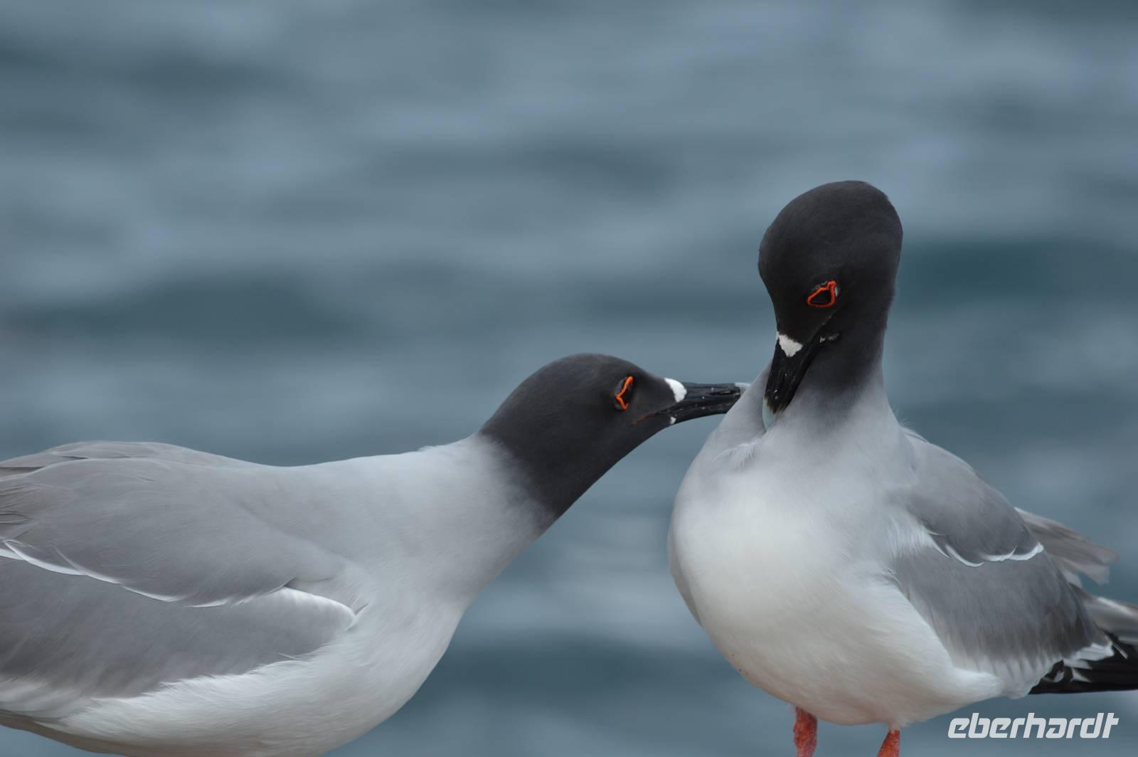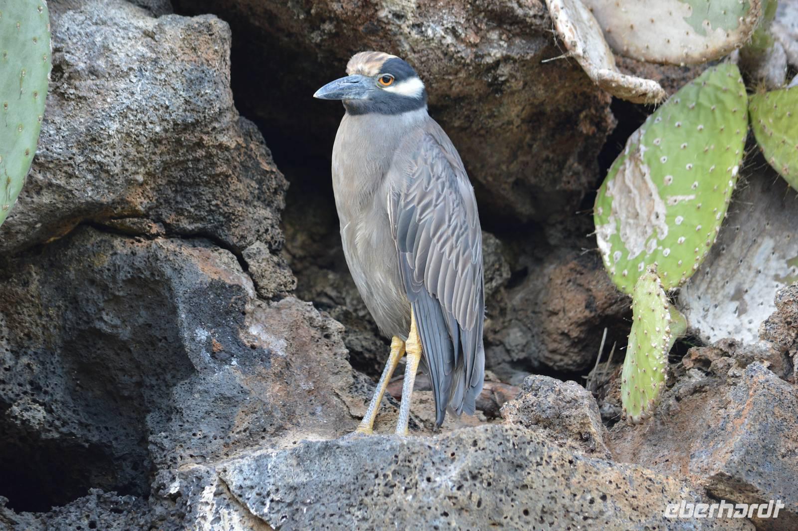 Die Überfahrt nach Genovesa in der Nacht war lang, aber ruhig. Nach dem Anker Werfen kommen einige sehr große Galapagos Haie an der Yacht und bleiben auch ums Schiff - also kein Schwimmen von der Yacht aus! Um 7.45 booten wir mit einer nassen Landung am Strand aus und stehen gleich nicht nur direkt neben den Kakteen mit den weichen Stacheln, sondern mitten in der Brutkolonie der Gabelschwanzmöwen, Rotfußtölpel und Fregattvögel. Es ist ein Traum und die Vogelphotographen wissen gar nicht, wo sie zuerst ihr Objektiv hinrichten sollen. Auch fliegen uns alle 4 Finkenarten direkt vor die Linsen, ebenso die Nachtreiher. Überall am Boden sind die winzig kleinen Winkerkrabben. Später finden die Schnorchler Seebären unter Wasser und die Schwimmer (vom Strand, nicht von der Yacht aus!) einen Nachtreiher, welcher sich als Nesträuber versucht.