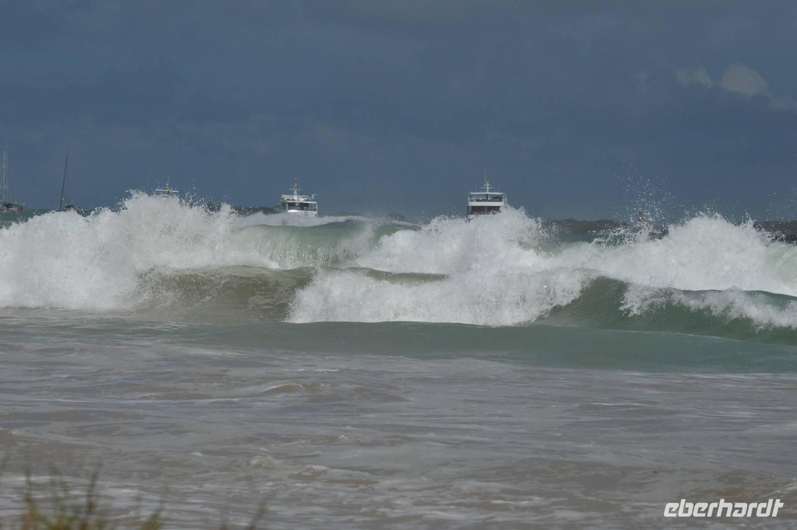 Danach lichtet die „Angelito“ sofort den Anker und wir umfahren Isabela im Süden. Die See ist ruhig. Hochseevögel sind zu sehen. Ein Großwal taucht kurz auf und sofort wieder ab, bevor wir seine Art bestimmen können. Gegen 18.30 laufen wir in der Reede vor Villamil auf. Der Surf ist hoch! Bei der Vorbereitung für den Folgetag bekommen wir die Warnung vor hohen Wellen am Abend des Folgetags. Der Kapitän beschließt, dass er am Folgetag um 15.30 auslaufen will aus Sicherheitsgründen, da die offene Reede vor Villamil wenig Schutz bietet.