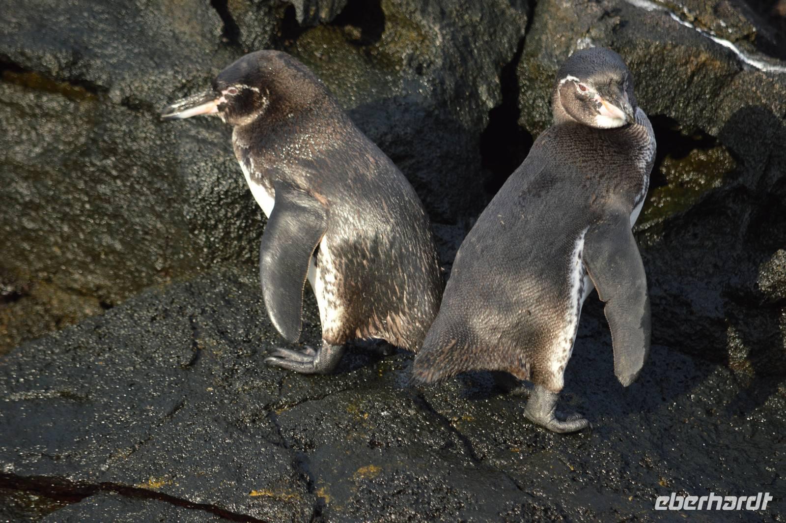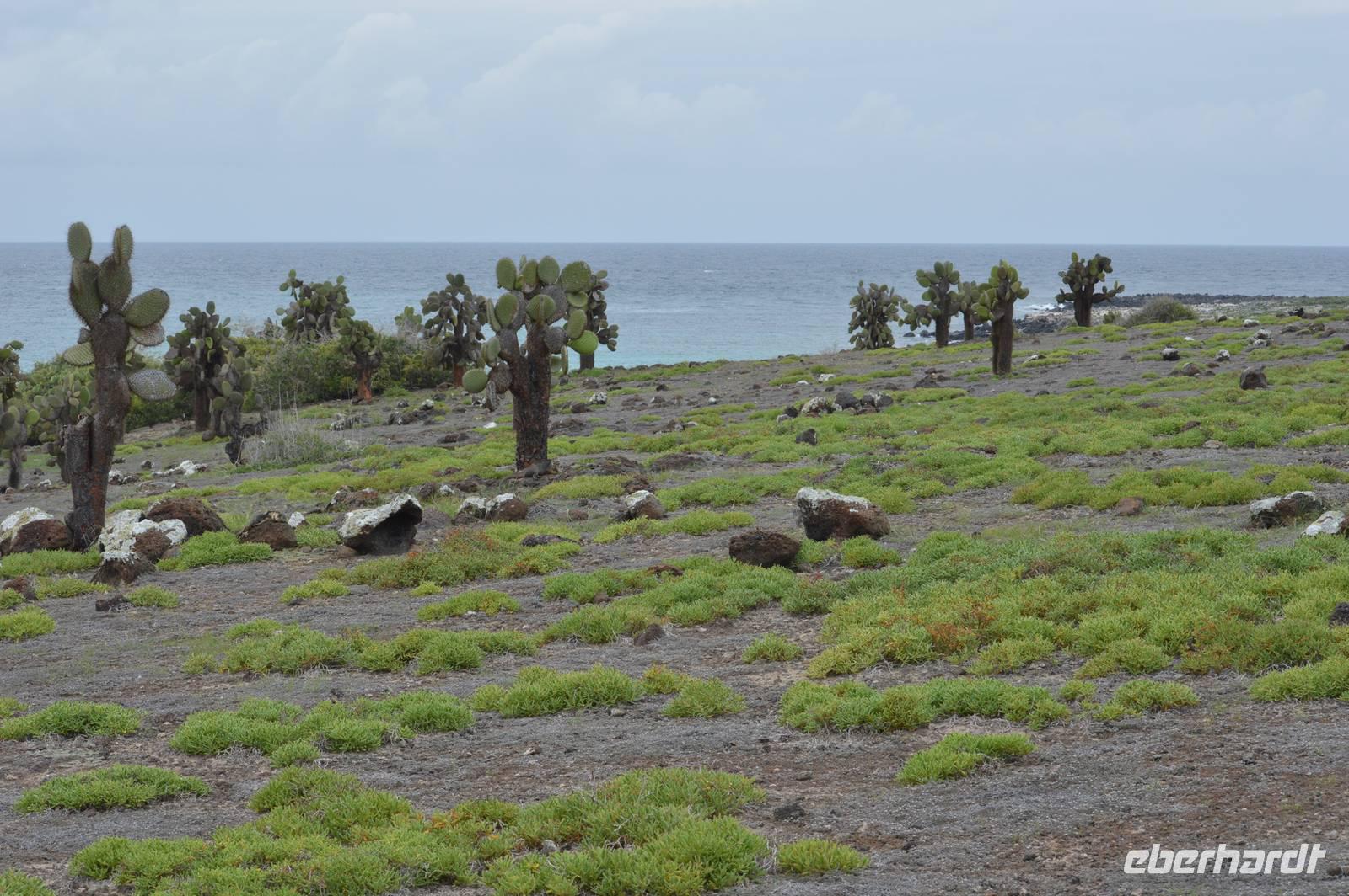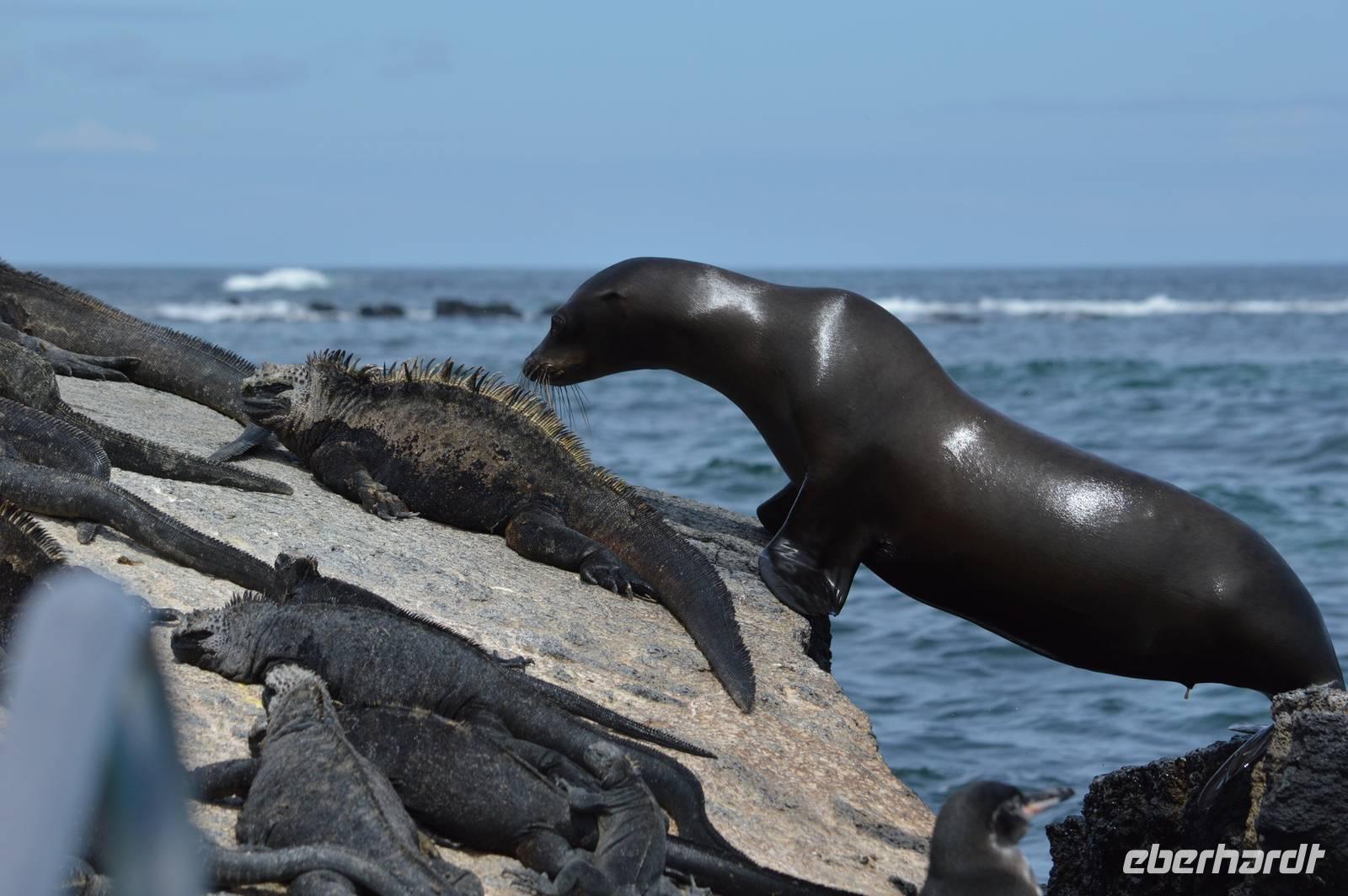 Früh um 6.30 geht es in P. moreno mit einer schwierigen trockenen Landung auf das Lavafeld. Auch hier blüht es an einigen wenigen Stellen. In den tiefen Einbrüchen, die Wasser führen, finden wir Flamingos, Teichhühner und Spottdrosseln. Der Höhepunkt ist ein großer Einbruch in Ufernähe, der bei Springflut mit dem Meer verbunden ist: Ein Riffhai, Grüne Meeresschildkröten und etliche Großfische sind gut zu sehen. Retour an Bord splittet sich die Gruppe wieder auf. Ein Teil geht schnorcheln und trifft dabei auf Mengen von Meeresschildkröten. Die anderen fahren mit der Panga zu den Klippen und sehen die riesigen Meeresechsen, Kormorane beim Brüten und Pinguine.