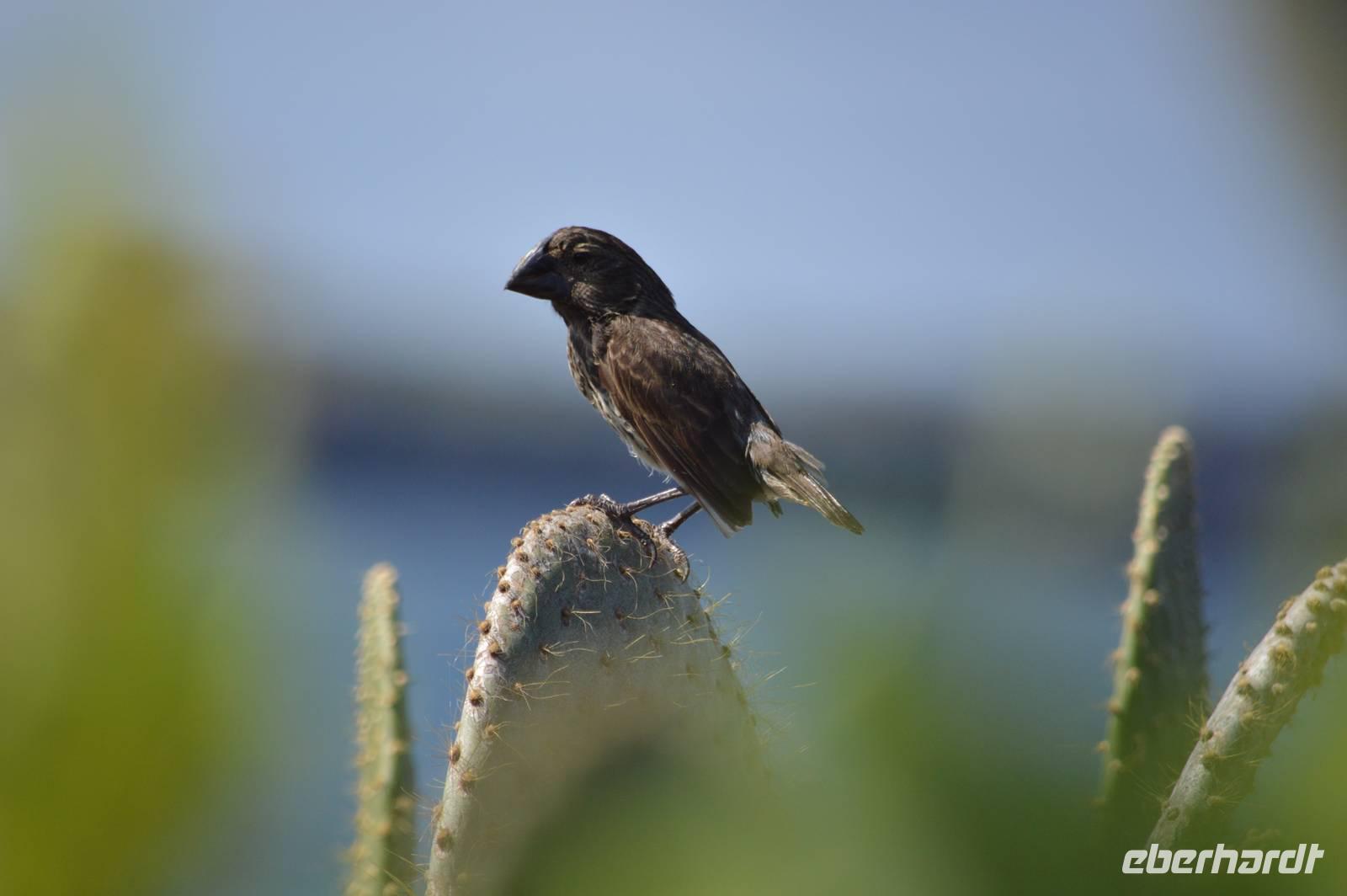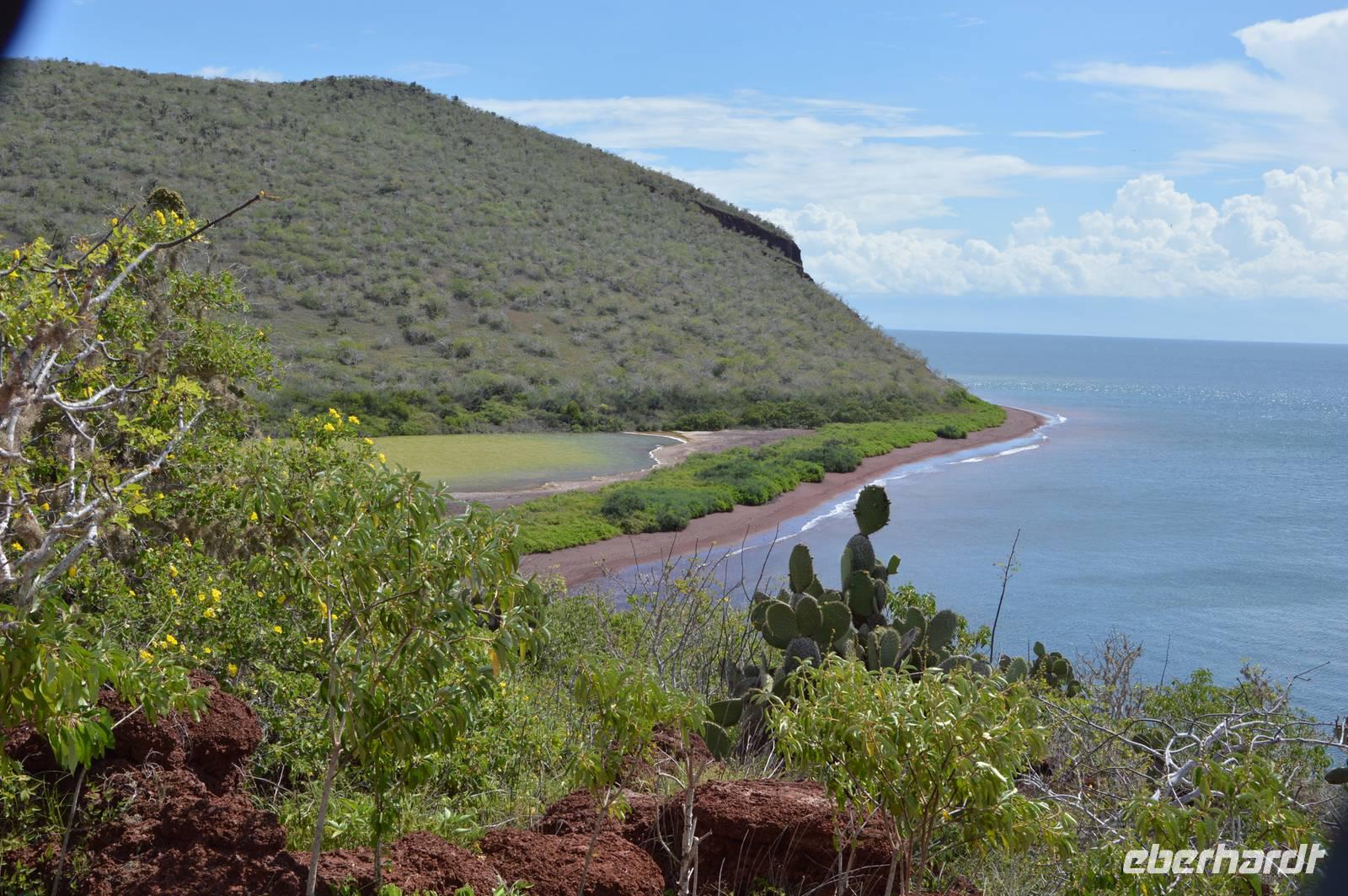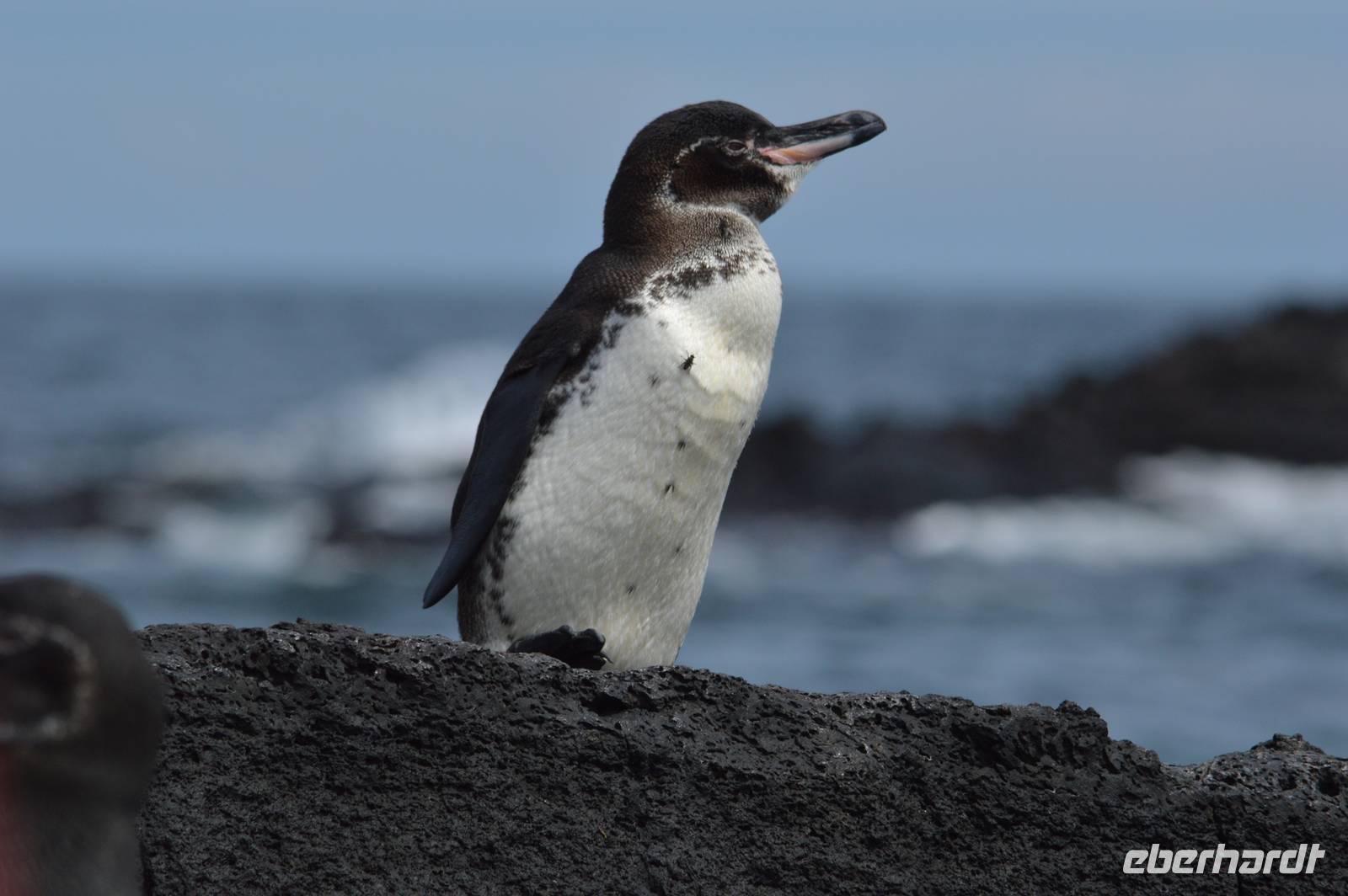 Früh um 6.30 geht es in P. moreno mit einer schwierigen trockenen Landung auf das Lavafeld. Auch hier blüht es an einigen wenigen Stellen. In den tiefen Einbrüchen, die Wasser führen, finden wir Flamingos, Teichhühner und Spottdrosseln. Der Höhepunkt ist ein großer Einbruch in Ufernähe, der bei Springflut mit dem Meer verbunden ist: Ein Riffhai, Grüne Meeresschildkröten und etliche Großfische sind gut zu sehen. Retour an Bord splittet sich die Gruppe wieder auf. Ein Teil geht schnorcheln und trifft dabei auf Mengen von Meeresschildkröten. Die anderen fahren mit der Panga zu den Klippen und sehen die riesigen Meeresechsen, Kormorane beim Brüten und Pinguine.