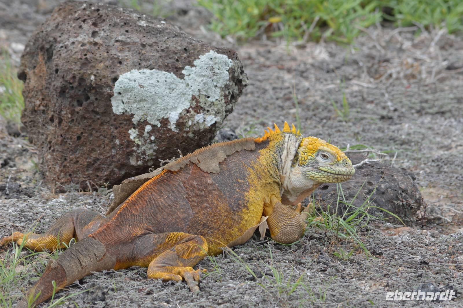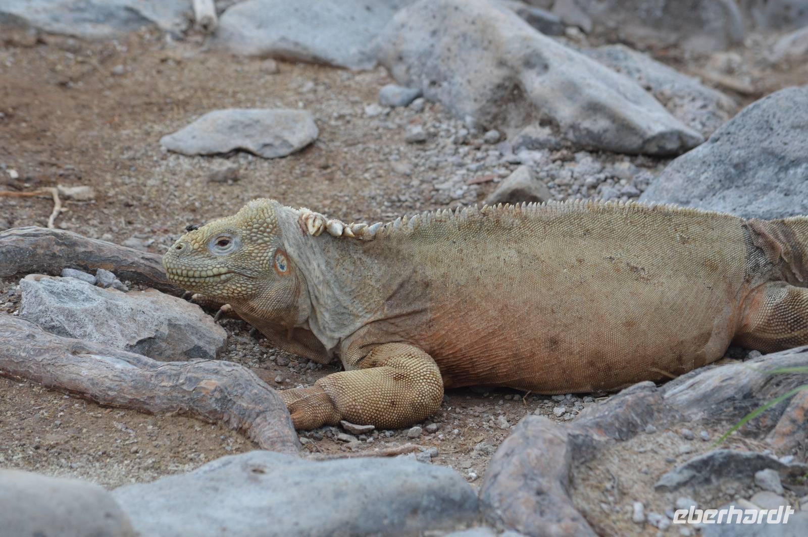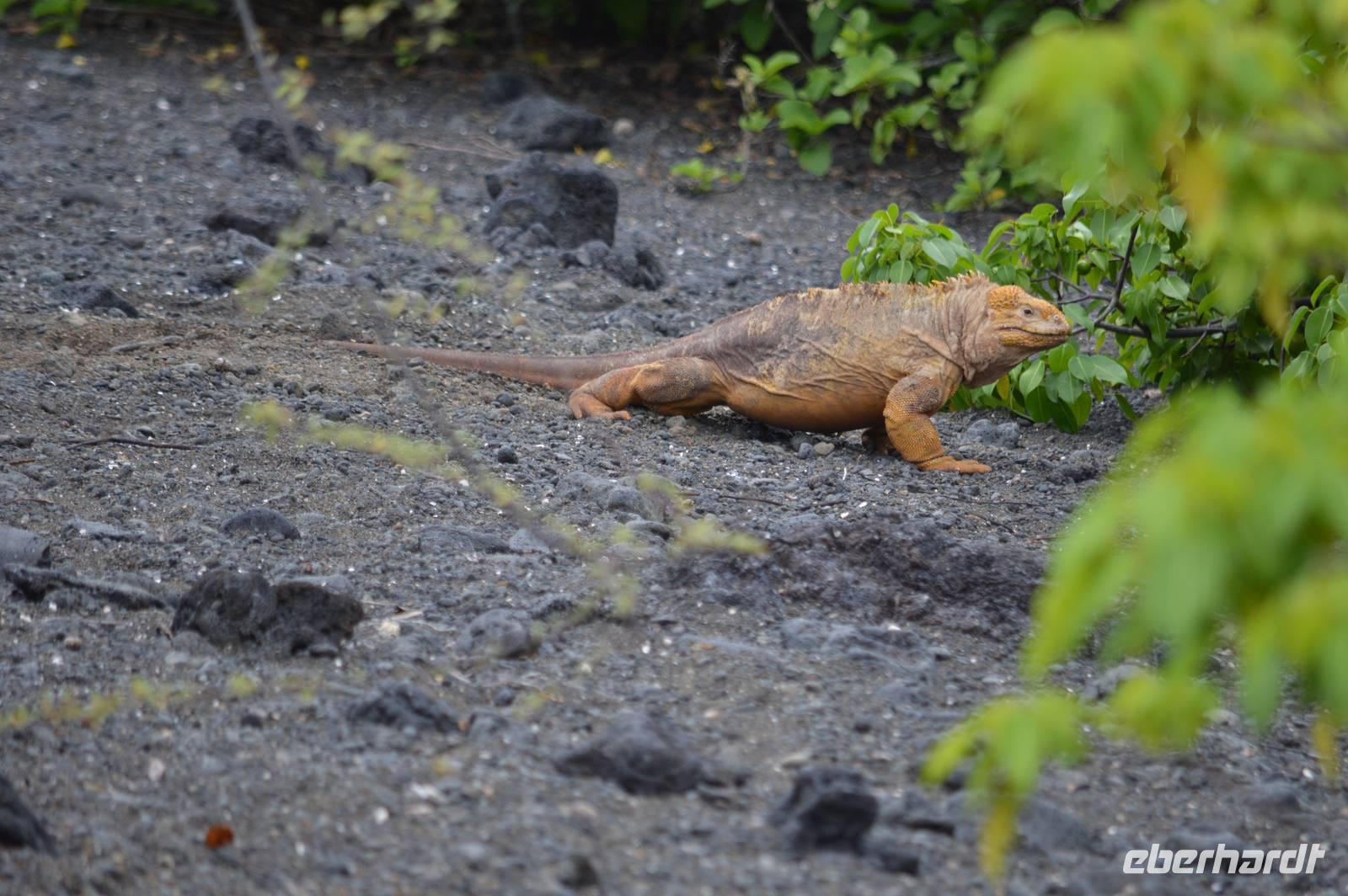 Um 13.30 gehen wir mit einer trockenen Landung in Cerro Dragon an Land. Es ist unglaublich grün durch die gute Regenzeit. Die Lagune ist ziemlich voll. Ein Flamingo steht drin. Wir sehen Meeresechsen, die sich hier auch am Queller und nicht nur an der Ulva gütlich tun. Insgesamt 11 Landleguane, teilweise unmittelbar neben uns, sind das Ergebnis. Dazu Finken, Spottdrosseln und ein Massenflug von Schwefelfaltern sowie jede Menge Schwärmerraupen an der Cordia lutea. Sehr erfolgreich also!