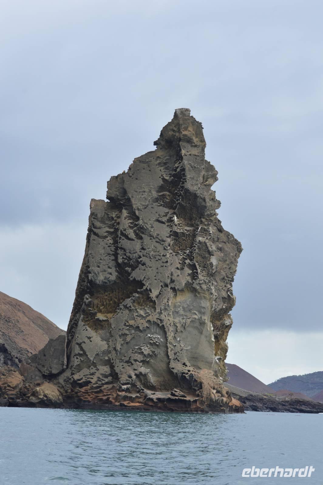Früh fahren wir bei jetzt ganz ruhiger See zum Sombrero Chino vor Santiago und haben dort eine einfache nasse Landung um 7.45. Hier ist seitens der Tiere nicht so viel Neues zu erwarten, aber die Botanik ist spannend: Die ersten Galapagos Tomatenbüsche, der blühende Portulak. Baden und Schnorcheln machen wir nach dem kurzen Weg - ein Ort zum Entspannen. Die Überfahrt nach Bartholomé ist ebenfalls sehr ruhig. Um 14.30 gehen wir dort mit einer trockenen Landung an Land und laufen die 370 Stufen hoch zum Gipfel, wo wir eine phantastische Aussicht über Santiago und die umliegenden Inseln haben. Danach fahren wir mit den Pangas entlang der Küste und finden die kleine Pinguinkolonie.