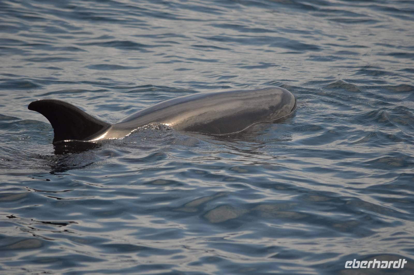 In der Nacht fährt die „Angelito“ das kurze Stück zur Urbina Bay am Vulkan Alcedo auf Isabela. Die nasse Landung um 6.45 am Strand ist wegen der Wellen etwas knifflig. Bedingt durch die Regenzeit sind unglaublich viele Finken vorhanden in allen Stadien und Arten, dazu Spottdrosseln und die Tyrannen. Nicht einfach, aber dann finden wir doch 7 Landleguane, einige dicht am bzw. auf dem Weg. Als dann noch zwei Alcedo Riesenschildkröten den Pfad kreuzen, dachten wir, wir hätten Glück. Aber dann tauchten die sehr schwer zu beobachtenden Dunkelschnabel Kuckucke auf - und einer davon führt uns zu seinem Nest. Es ist eben die glückliche Gruppe! Zurück am Strand baden und schnorcheln wir mit Kormoranen, Pinguinen und Seeschildkröten. Dann geht es retour an Bord und sofort Anker auf für die Überfahrt nach Bahia Elizabeth. Bloß: Wir kommen nicht weit, da ein großer Trupp Tümmler auftaucht und die „Angelito“ für fast 20 Minuten begleitet, um das Schiff herum spielt und fischt. Also kommen wir etwas später an den Ankerplatz bei den Islas Mariellas.