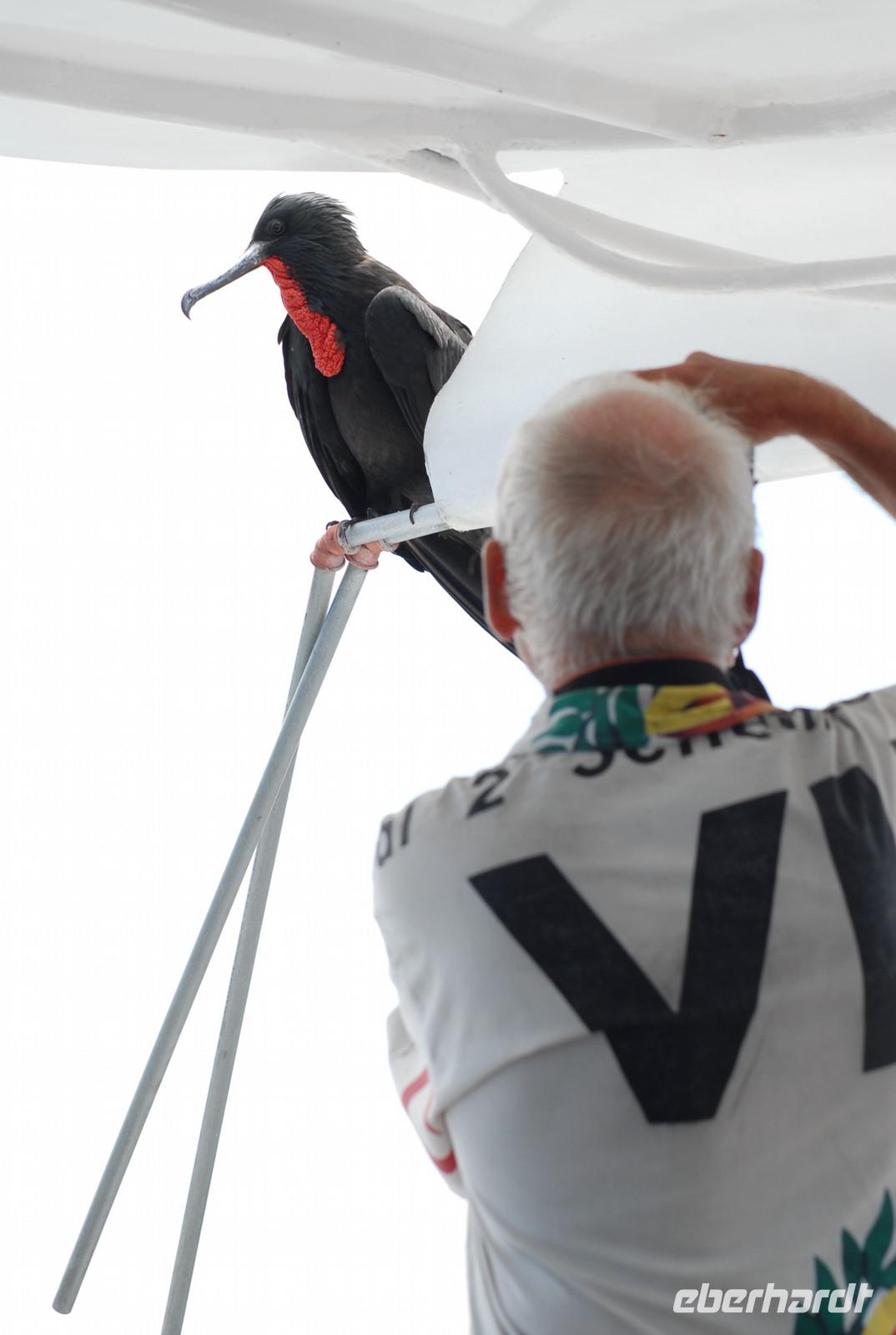 Zurück an Bord verholte die Yacht nach Cerra Drogon bei ruhiger See. Das Mittagessen gab es unterwegs. Angekommen, booteten wir aus. Es war sehr trocken, die Vegetation mager. Dafür aber gab es Landleguane und wieder eine interessante Vogelwelt und die ersten großen Meeresechsen. Nach Rückkehr an Bord verholte die Yacht in den Windschatten einer anderen Insel, Rabida. Die Überfahrt war holprig, da der Süd-Ost Passat noch einmal kräftig wehte und damit auch Wellen da waren. In der Nacht umfuhren wir dann die Nordspitze der Insel Isabela.