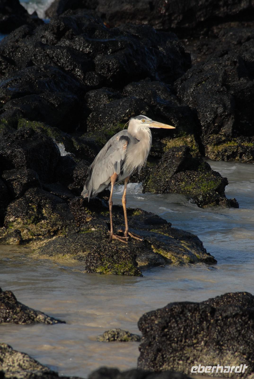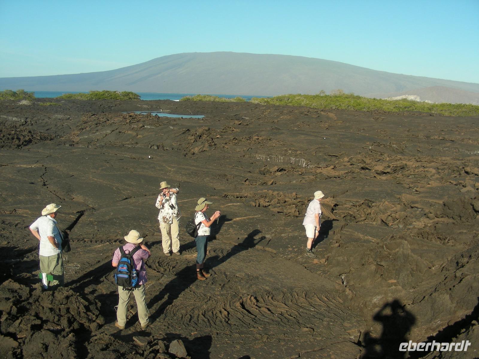 Wie immer früh von Bord! Dieses Mal auf ein altes Lavafeld mit tiefen Einbrüchen in denen Wasser, Süßwasser und Brackwasser, stand. Es war schon verblüffend, wenn man über das Lavafeld lief und dann plötzlich vor dem Einbruch mit dem Wasser und den Pflanzen stand. Auch hier gab es wieder Flamingos, Teichhühner und badende Fregattvögel. Am Ufer war dann ein großer und tiefer Einbruch in dem sogar 4 Weißspitzen-Riffhaie ihre Kreise zogen. Eine Pangafahrt rundete das Ganze ab: Und dabei waren wir fast Nase an Nase mit den größten Meeresechsen überhaupt und einer schönen Truppe Pinguine und Kormorane.