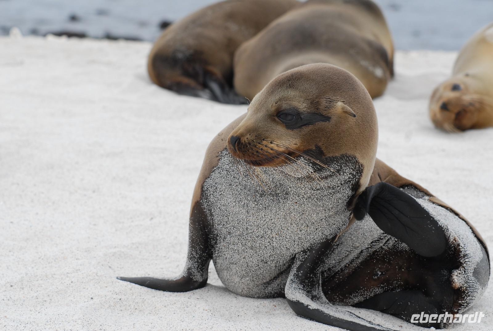 Nach einer ruhigen Nacht booten wir früh aus und gehen in Mosquera an Land. Dort leben sehr viele Seelöwen. Die Ornithologen kamen auch voll auf ihre Rechung und unter Steinen fanden wir Skorpione und Solifugen. Zurück an Bord gingen einige schnorcheln. Die anderen fuhren mit der Panga, wie hier alle Beiboote heißen, die Küste von Seymour ab und fanden dort eine große Gruppe Seebären, einen Landleguan und wieder einen guten Querschnitt durch die Vogelwelt.