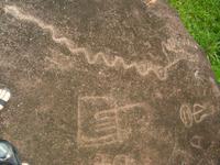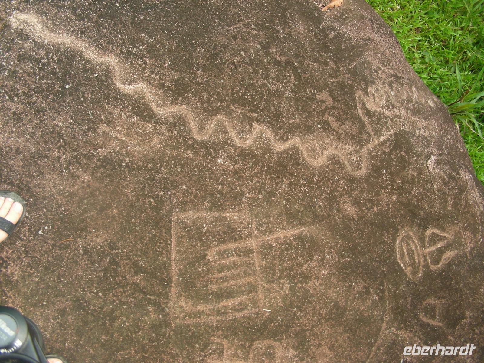 Nach dem Frühstück werden erst einmal Stiefel anprobiert, denn der Trail im Regenwald ist naß, schlammig ung geht streckenweise durch Bäche. Pablo, ein Indio, führt uns und überzeugt sehr durch seine intimen Kenntnisse des Regenwalds: Was für uns nur grün ist, ist für ihn eine Apotheke, ein Baumarkt und Lebensunterhalt in einem. Nachmittags geht es dann in eine Höhle (die ganze Gegend steht auf Kalkstein), was aber rasch endet, da der Fluß in der Höhle uns bis an den Hals geht. Also weiter zu den Petroglypen, uralten Felszeichnungen, an deren Bedeutung man immer noch rätselt.
