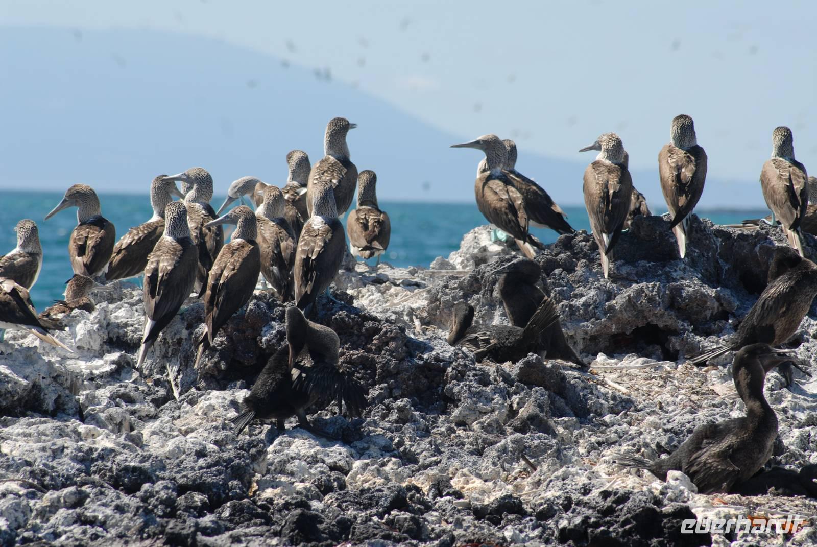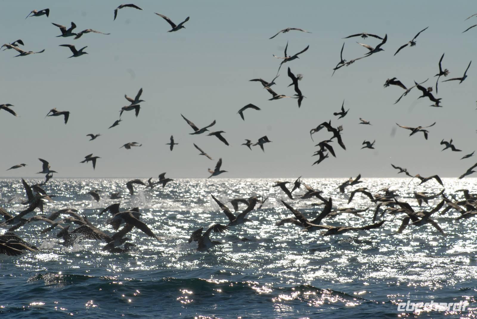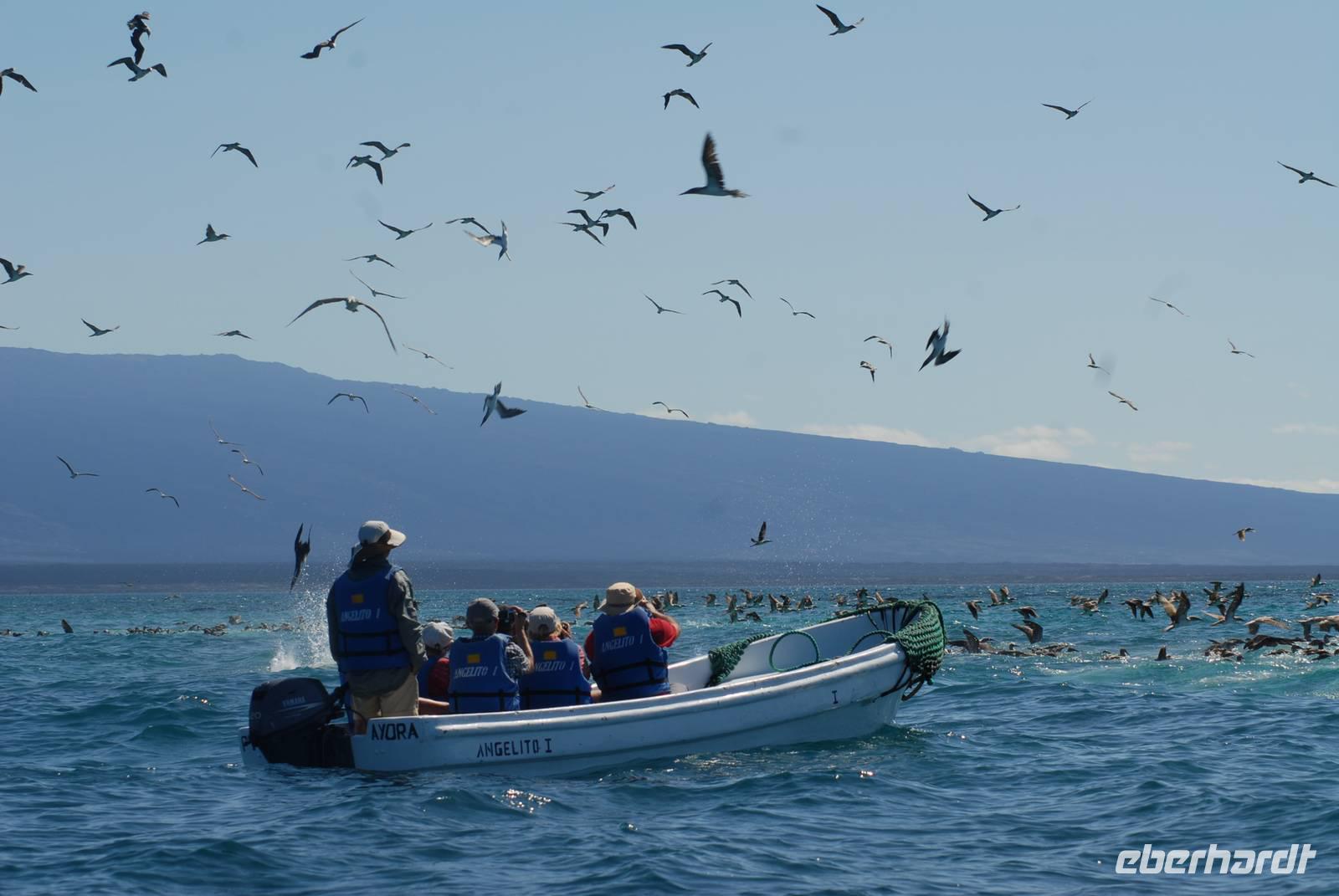 Direkt nach der Rückkehr an Bord verholt die Angelito nach Bahia Elizabeth. Dort gehen wir mit den Pangas in die Mangrovenlagunen bzw. wollten das. Aber: Eine wirklich riesige Feeding Frenzy baute sich auf. Um die 800 Blaufußtölpel nebst Pelikanen, Audubon Sturmvögel, einigen Pinguinen und Kormoranen hatten einen großen Fischschwarm im Flachwasser und folgen pausenlos Freßangriffe, zum Teil unmittelbar neben den Pangas. Es war ein unglaublicher Anblick, der auch noch sehr sehr lange dauerte. Wir gelangten dann doch noch in die Lagunen, wo wir viele Meeresschildkröten sahen und auch einen Schwarm Goldrochen. Der Tag war wieder einmal sehr schön und sehr erfolgreich.