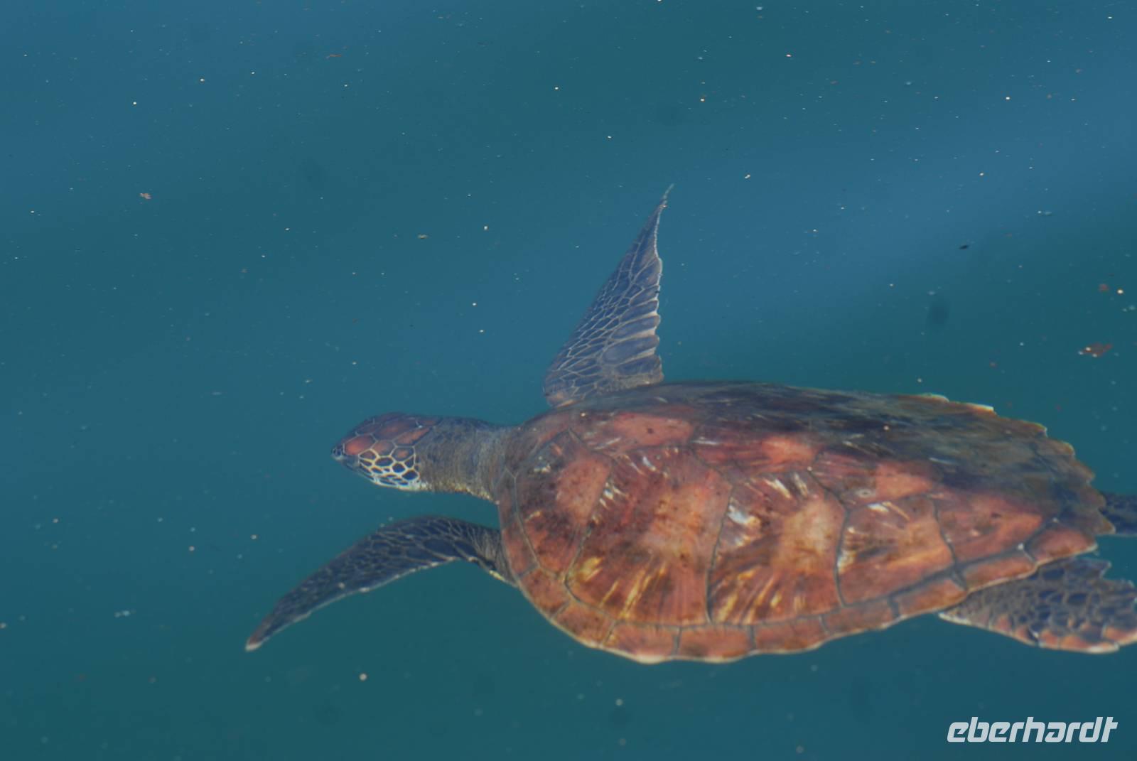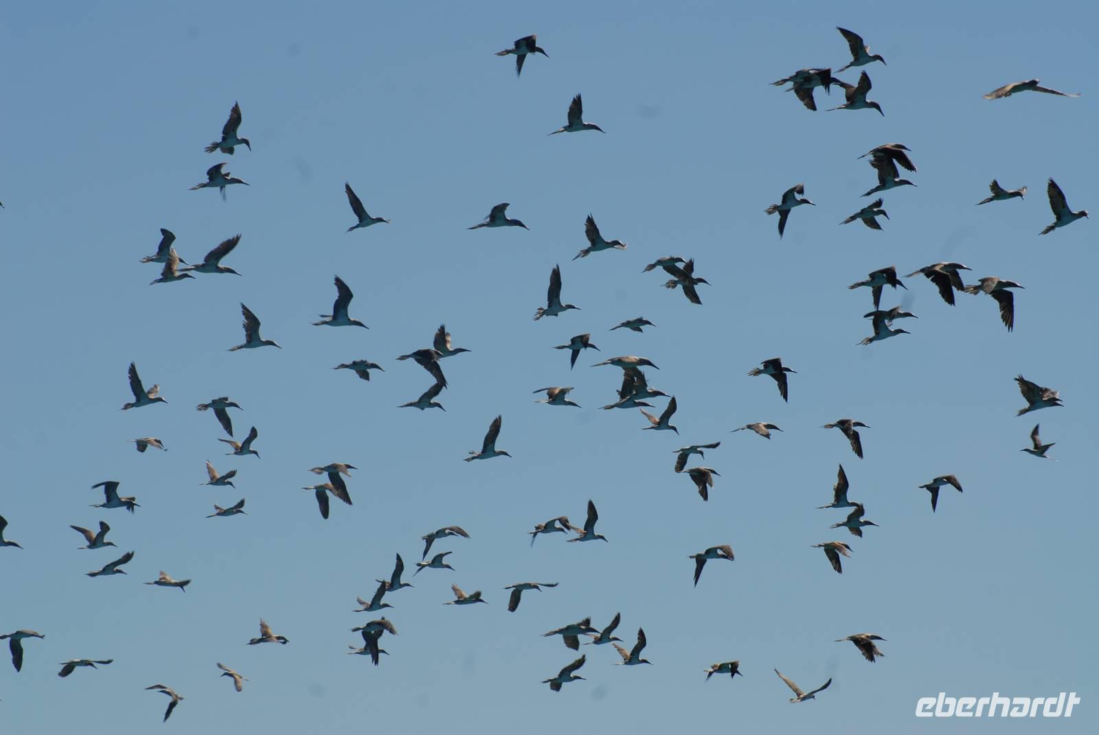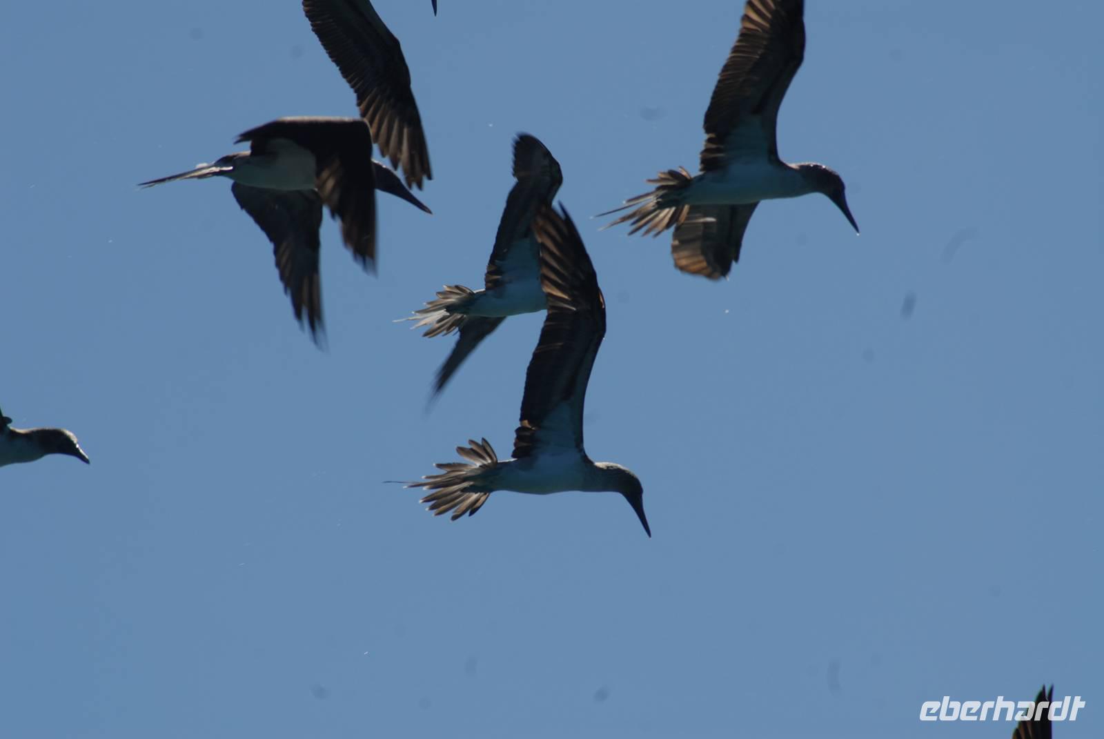 Direkt nach der Rückkehr an Bord verholt die Angelito nach Bahia Elizabeth. Dort gehen wir mit den Pangas in die Mangrovenlagunen bzw. wollten das. Aber: Eine wirklich riesige Feeding Frenzy baute sich auf. Um die 800 Blaufußtölpel nebst Pelikanen, Audubon Sturmvögel, einigen Pinguinen und Kormoranen hatten einen großen Fischschwarm im Flachwasser und folgen pausenlos Freßangriffe, zum Teil unmittelbar neben den Pangas. Es war ein unglaublicher Anblick, der auch noch sehr sehr lange dauerte. Wir gelangten dann doch noch in die Lagunen, wo wir viele Meeresschildkröten sahen und auch einen Schwarm Goldrochen. Der Tag war wieder einmal sehr schön und sehr erfolgreich.