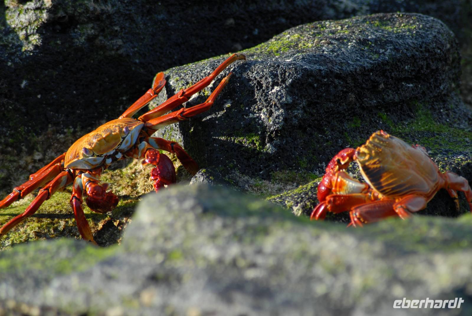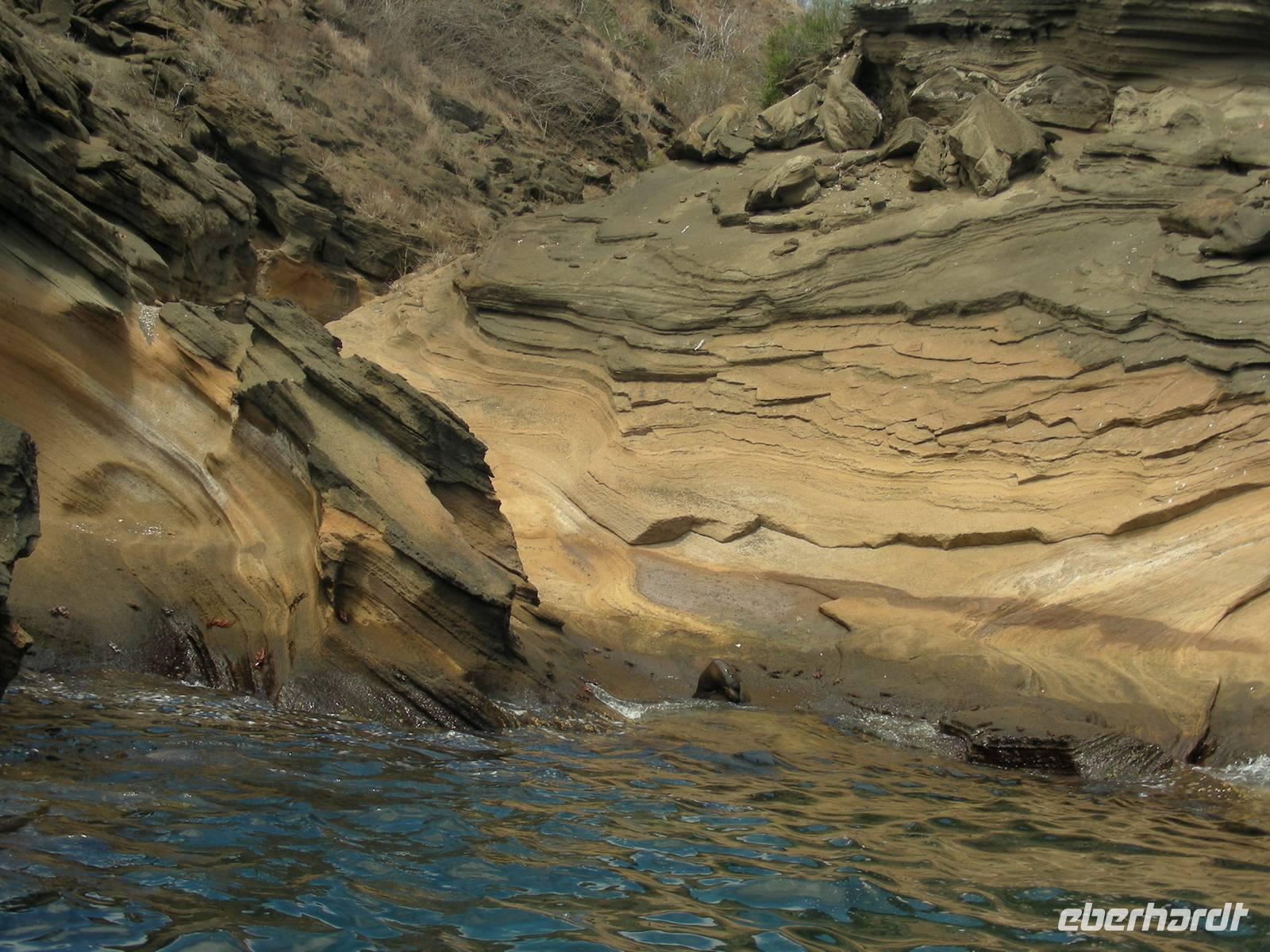 Früh am Morgen verholt die Yacht vor die kleine Insel Mosquera. Wir gehen um 07.00 Uhr an Land mit einer nassen Landung und haben ausreichend Zeit die Seelöwen anzusehen. Dabei sehen wir auch, wie sich zwei Haremsbullen anknurren - beeindruckend. Und das dann noch jede Menge Skorpione und eine Solifuge unter Steinen gefunden wurden rundete die Sache ab. Eine Pangafahrt entlang der Küste der Nachbarinsel Seymour brachte dann noch einen Seebären und viele Hochseevögel. Direkt nach Ende der Pangafahrt ging die Yacht zum nächsten Punkt, Cerro Dragon. Mittagessen gab es dann während der Fahrt.