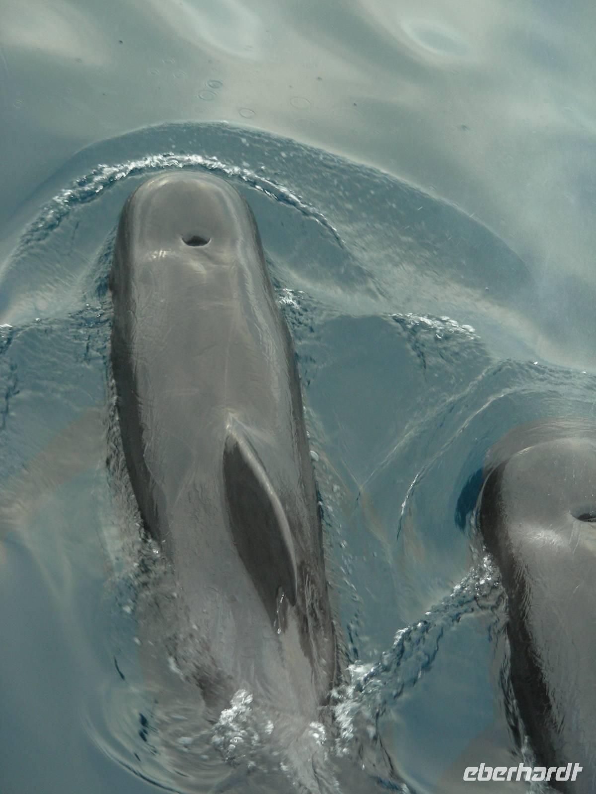 Um 06.00 morgens sind wir querab vom Vulkan Ecuador an der Nordspitze von Ecuador. Es ist total windstill und die See glatt, was sich fast sofort auszahlt: Wir sichten eine große Gruppe Pilotwale, die dann bis direkt an die Yacht kommen. Wir beobachten fast 30 Minuten lang die Tiere unmittelbar neben der Yacht! Aber es ging sofort weiter: Wenig später kochte die See vor uns, als gut 100 Delphine dort auf Fischfang gingen, zusammen mit 2 Minkwalen - und wir waren mittendrin. Aber aller guter Dinge sind drei: Vor dem Einlaufen in die Tagusbucht tauchen neben uns noch Brydewale auf - ein unglaublicher Morgen!