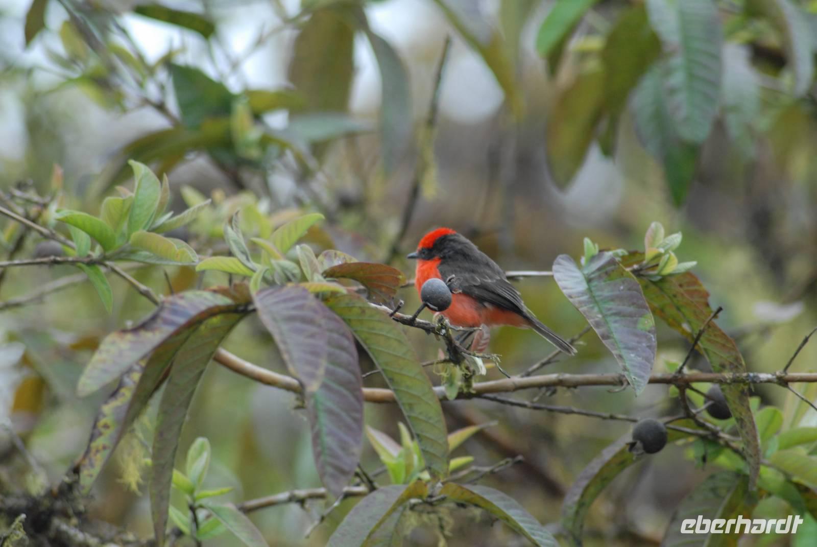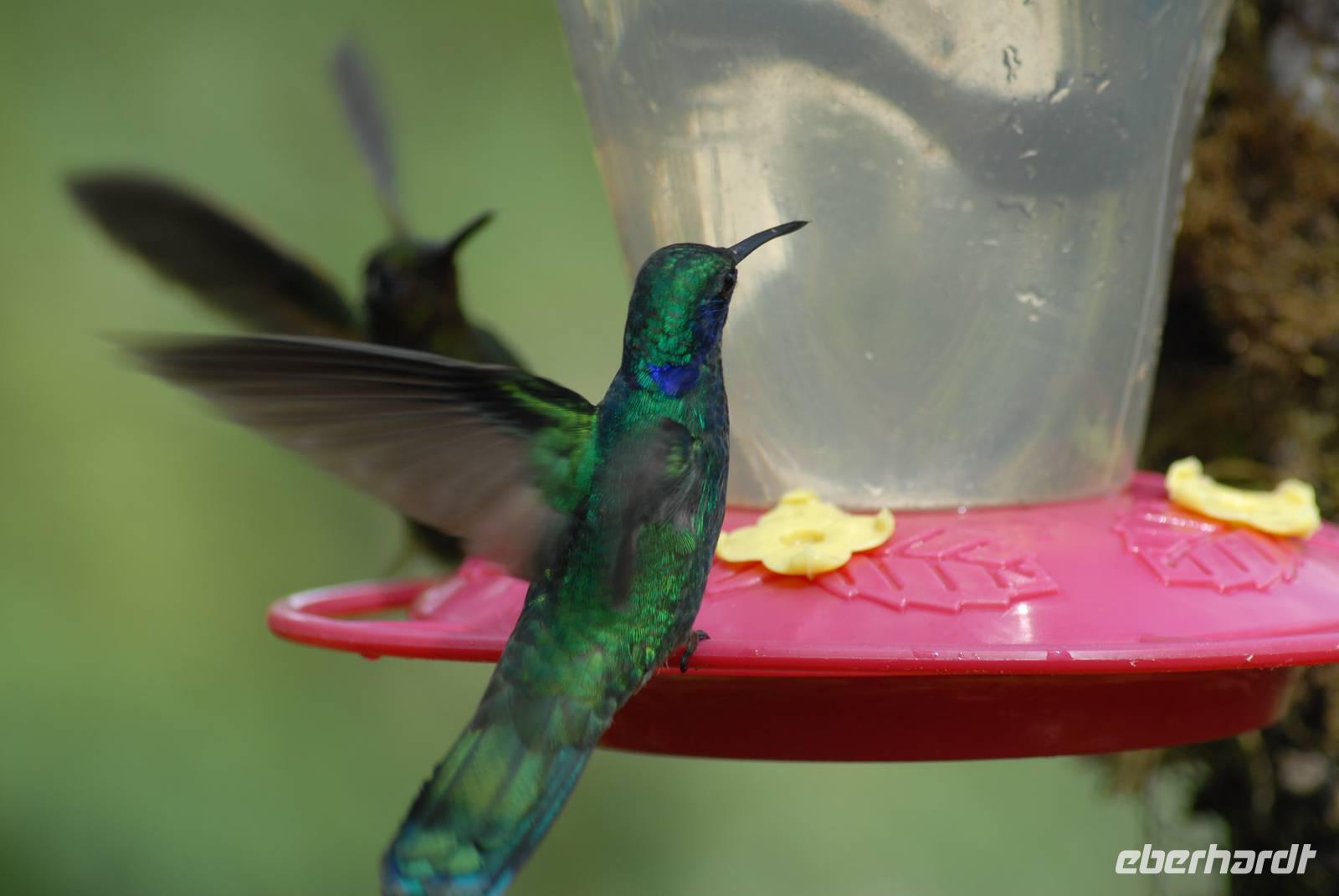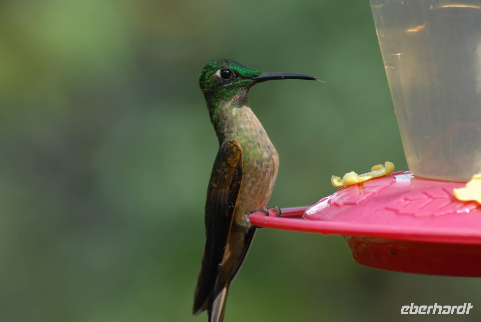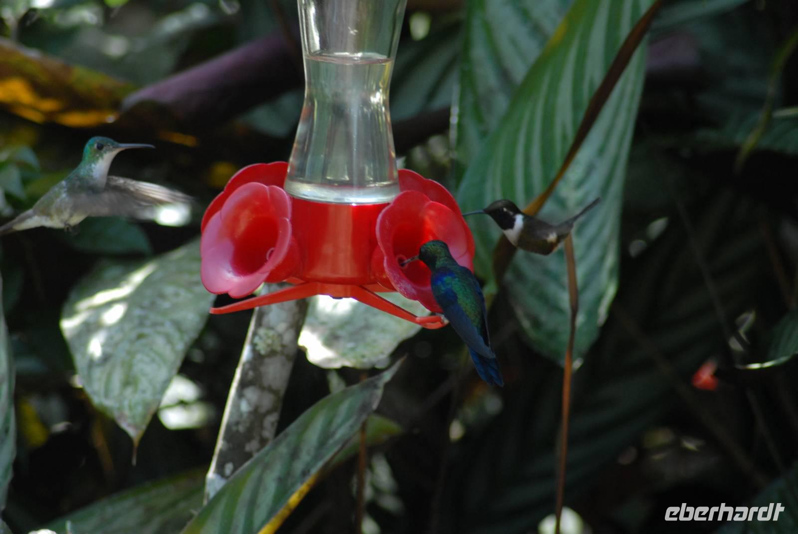 Wieder gibt es einen sehr frühen Gang zur Vogelbeobachtung, wieder mit gutem Erfolg. Nach dem Frühstück fahren wir zurück ins Tal. Vor der Hauptstraße in Alambi liegt das „Kolibri-Paradies", was nicht umsonst so heißt. Wir sehen über 10 weitere Kolibriarten, die neu für uns sind, dazu viele neue Tangaren. Am Fluß entdecken wir einen Felsenhahn, die Anden Wasseramsel und den Wassertyrann. Man muss sich schon losreißen von diesem Ort!