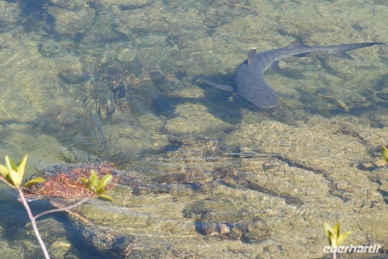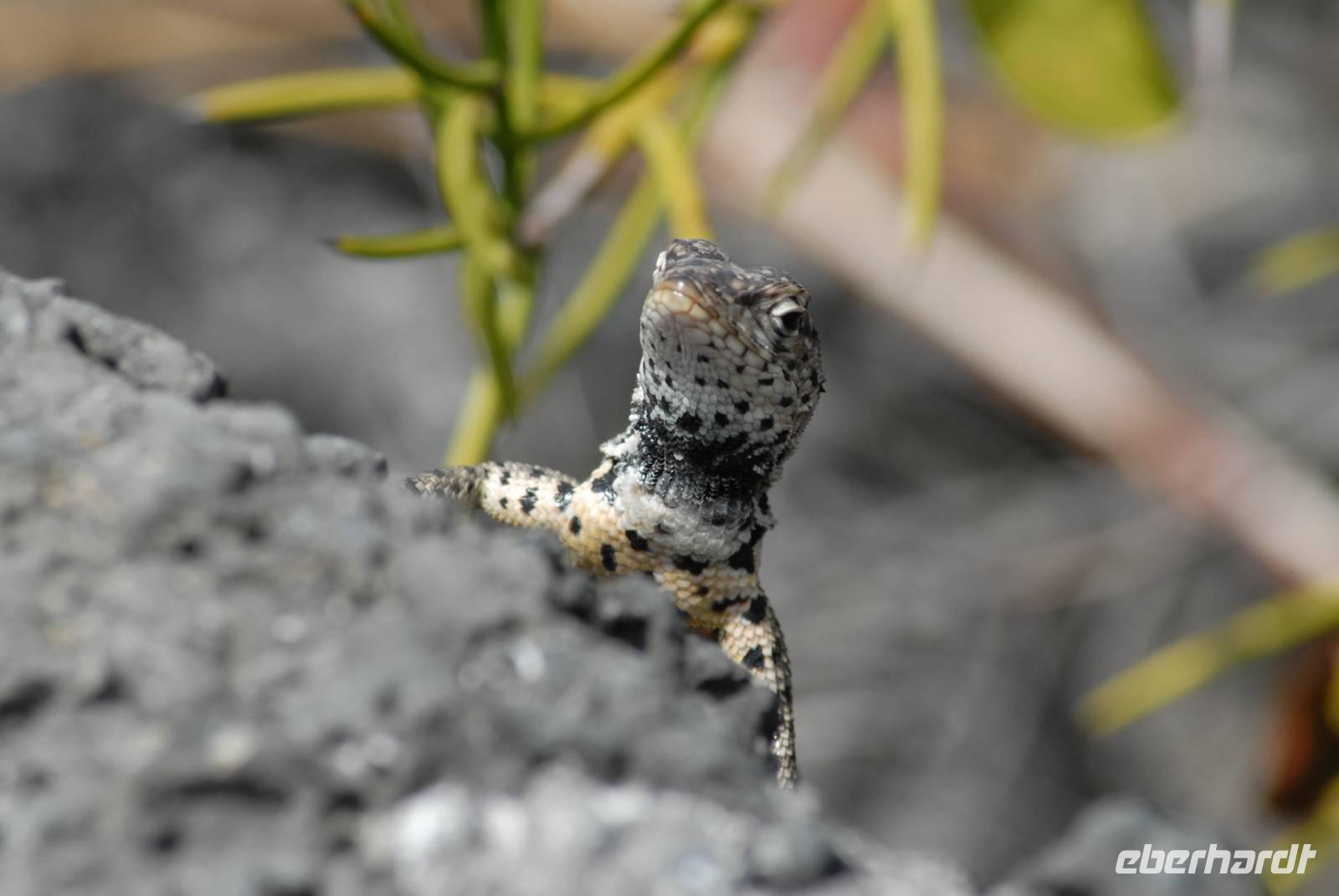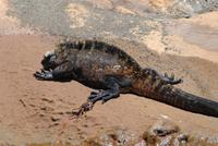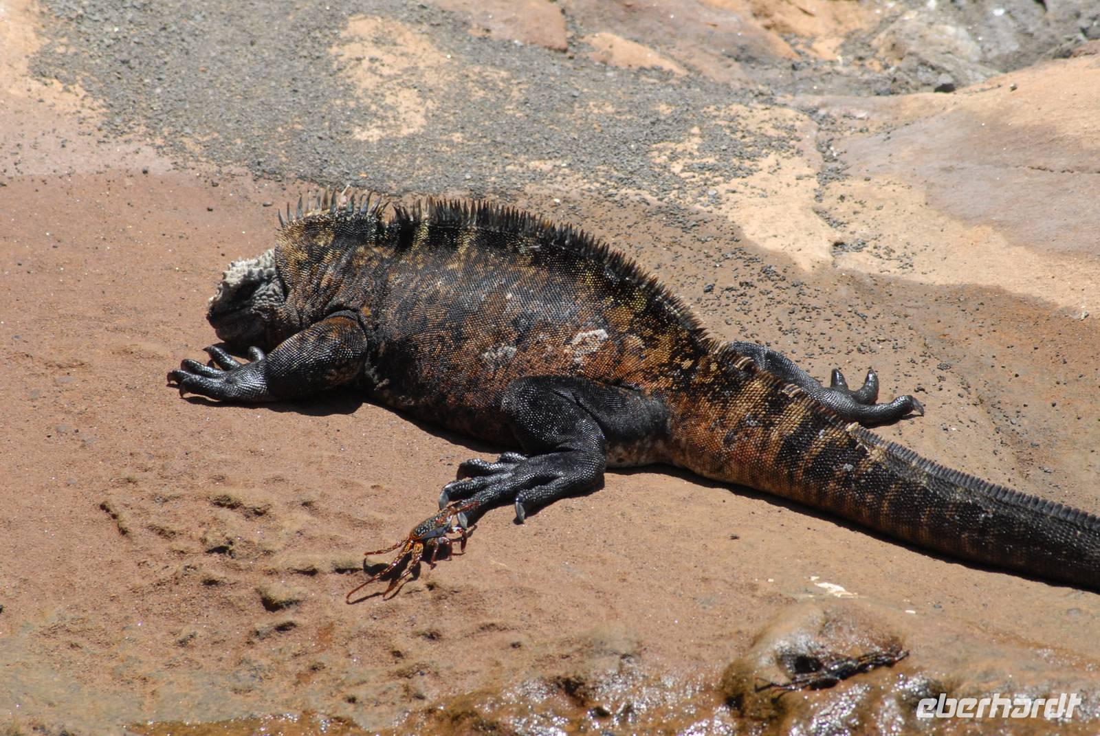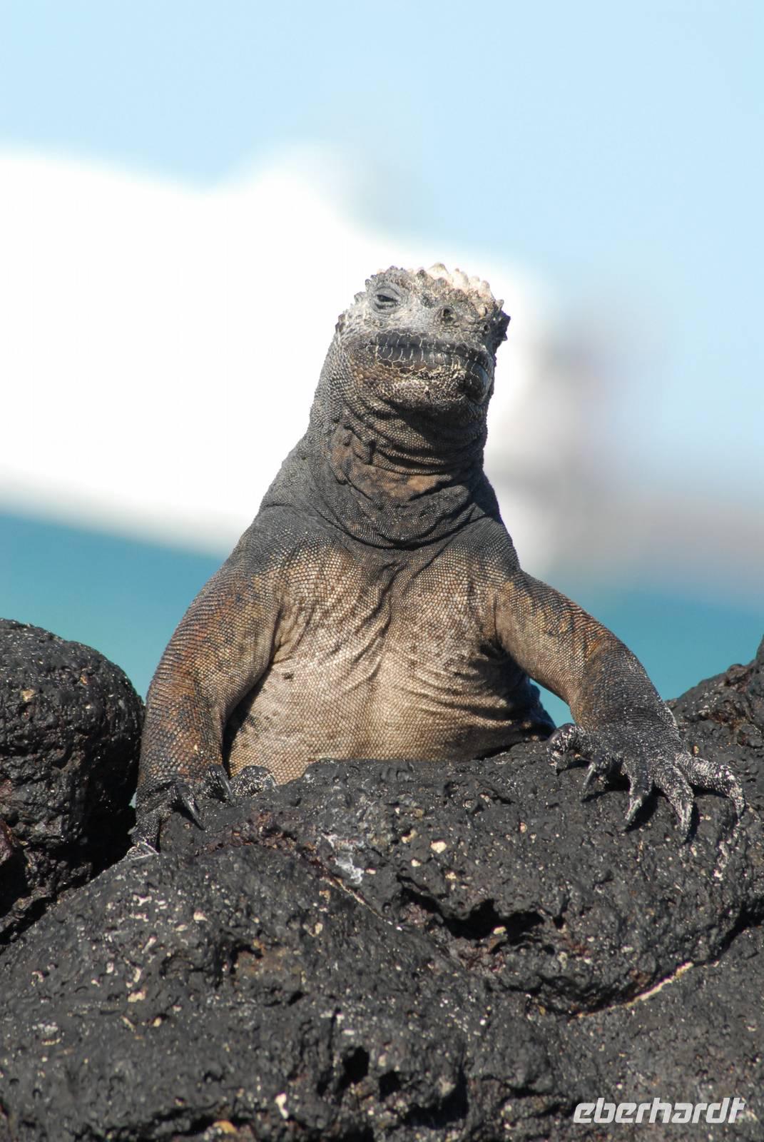 Noch vor dem Frühstück geht's mit Sonnenaufgang an Land. Wir laufen über die Lavafelder zu den Einbrüchen, in denen Wasser steht und daher Tiere und Pflanzen leben. Neben badenden Fregattvögeln und wieder Flamingos beschäftigen uns auch die Pflanzen auf dem Lavafeld. Im Einbruch an der Küsten finden wir dann noch mehrere Riffhaie und Meeresschildkröten. Als Abschluss fahren wir mit den Pangas zu den größten Meeresechsen von Galapagos, die hier fast 2 Meter lang werden. Danach umfahren wir die Südspitze von Isabela, haben aber unterwegs nur wenige Sichtungen von Meeresvögeln, also ein ruhiger Tag. Noch im Hellen sind wir im Hafen von Villamil.