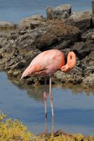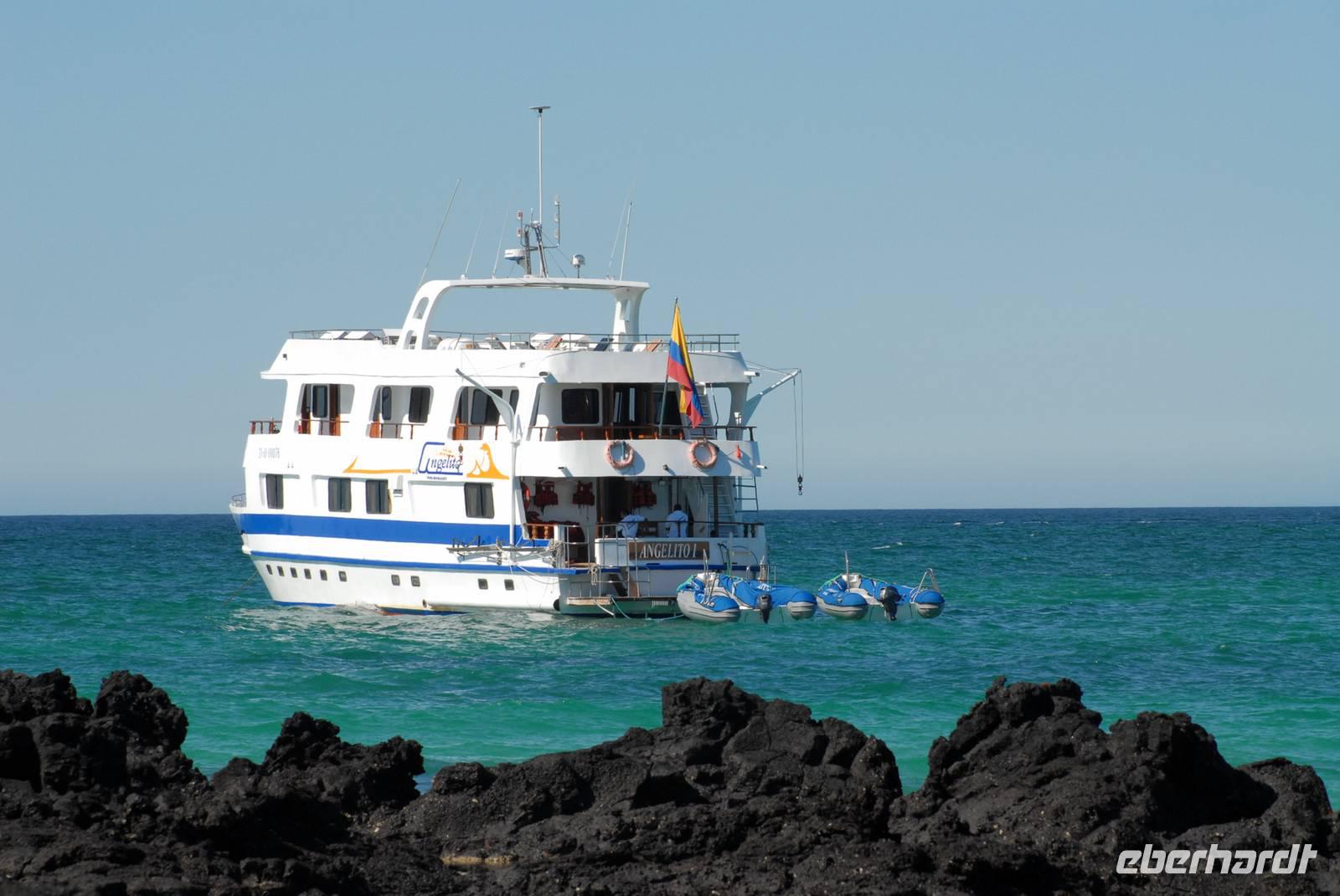 Um 5.50 geht's los zum Flughafen, wo wir uns dann auch von Carlos und Gallo verabschieden, die beide hervorragend waren. Der Flug geht pünktlich über Guayaquil nach Baltra/Galapagos. Maja nimmt uns am Flughafen in Baltra in Empfang und wir gehen auf der komplett umgebauten „Angelito" an Bord, machen also ihre Jungfernfahrt! Die Yacht verholt nach Las Bachas, wo wir am Nachmittag den ersten Landgang machen, sehr erfolgreich. Wir sehen die ersten Meeresechsen, auch Flamingos, Fregattvögel, Blaufußtölpel, etc. Abends stellt sich die Mannschaft offiziell vor.