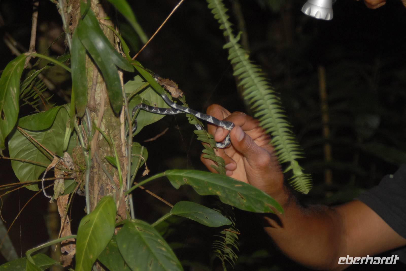 Das frühe Aufstehen ist inzwischen Routine! Dieses Mal fahren wir mit dem Bus an einen Nebenfluß des Rio Napo, wo wir versuchen Tierbeobachtungen zu machen. Allerdings ist in dieser Gegend wohl unlängst gejagt worden. Die Tiere sind extrem scheu, so dass wir das Ganze abbrechen. Dafür gehen wir in die Zuchtstation für bedrohte Pfeilgiftfrösche und lassen uns erklären, wie diese funktioniert. Die Frösche werden auch ausgewildert und das mit Erfolg. In eine Kitschuadorf sehen wir das Dorfleben, probieren auch Chicha und üben Blasrohrschießen. Nach dem Abendessen steht noch eine Nachtsafari im Urwald auf dem Programm, wo uns neben etlichen Vogelspinnen, Atlasspinnern, großen Catytiden auch eine schneckenfressende Schlange begegnet, die wir fangen und dann auch gut photographieren können.