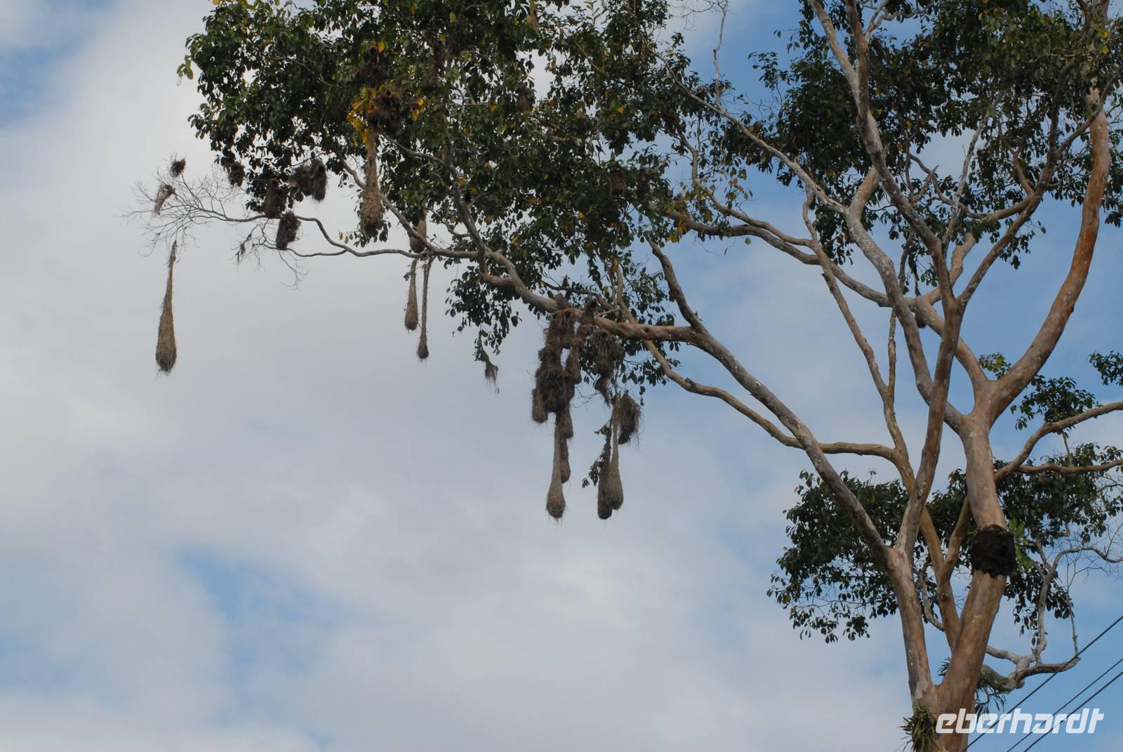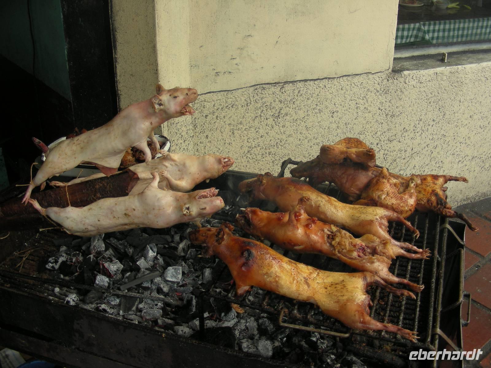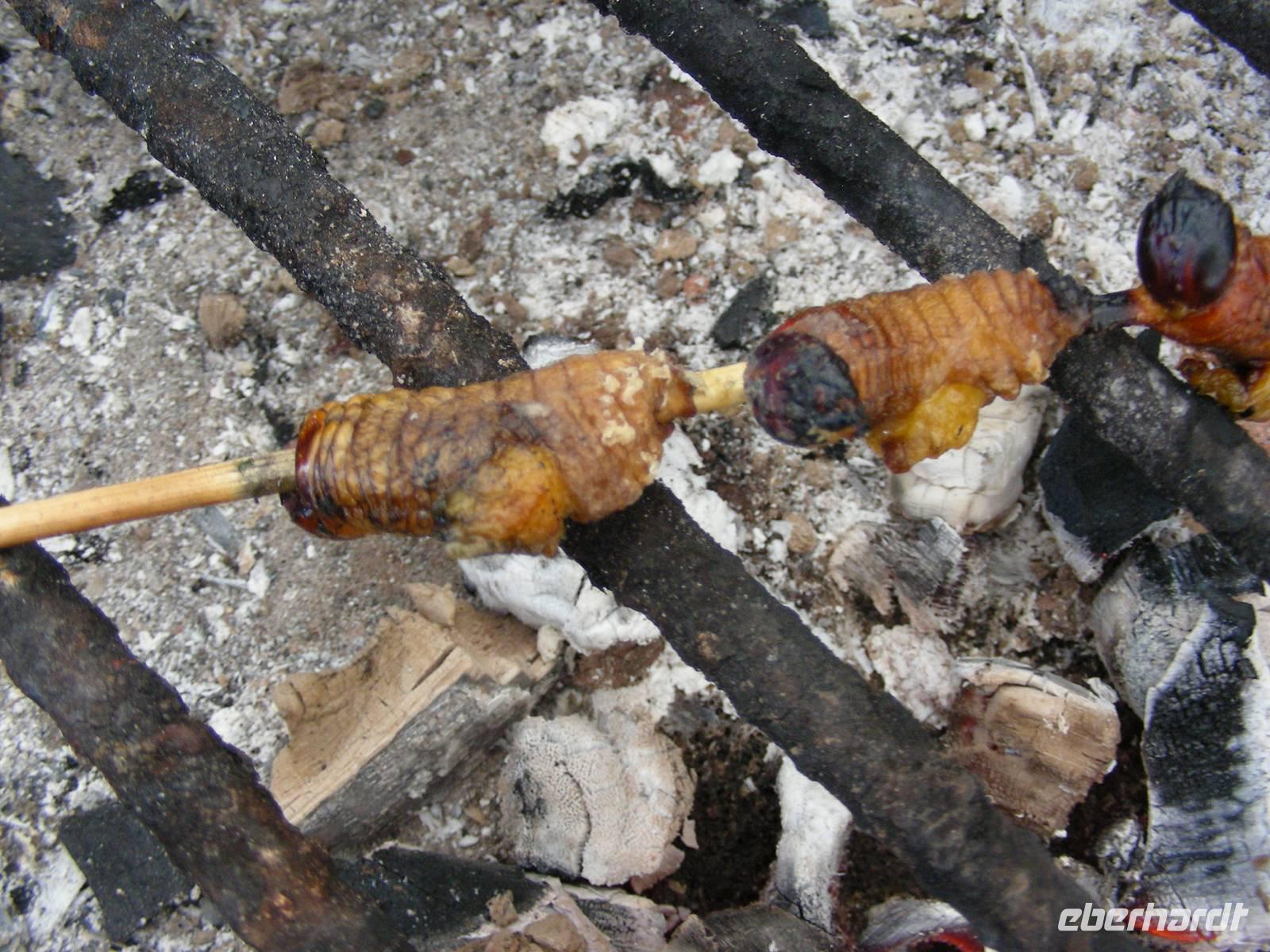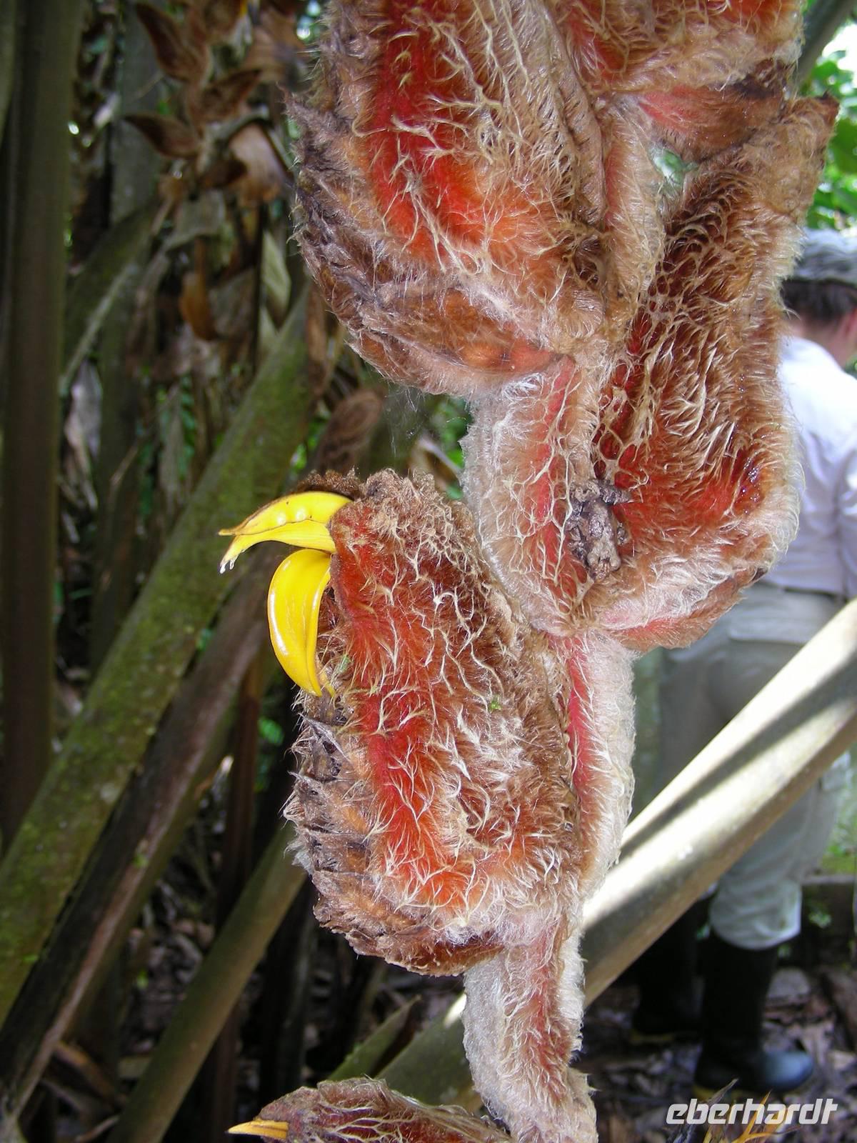Nach dem Frühstück gehen wir auf eine kurze Exkursion in den Bergregenwald durch eine bizarre Landschaft. Der Weg ist nicht ganz einfach, aber er lohnt sich. Wir finden unter anderem einen der schönsten Kolibris hier oben auf über 3.000 m Höhe. Dann geht es ins Tal in den Regenwald hinunter. Das Wetter hält sich einigermaßen und teilweise ist die Sicht gut. Kurz vor der Lodge machen wir einen kurzen Stop in Archidona und verkosten dort leckere frisch geröstete und gekochte Bockkäferlarven! Allerdings waren einige Reiseteilnehmer schon satt, als sie die Larven sahen... Am Nachmittag sind wir dann in Hakuna Matata, wo wir die nächsten drei Nächte sein werden.