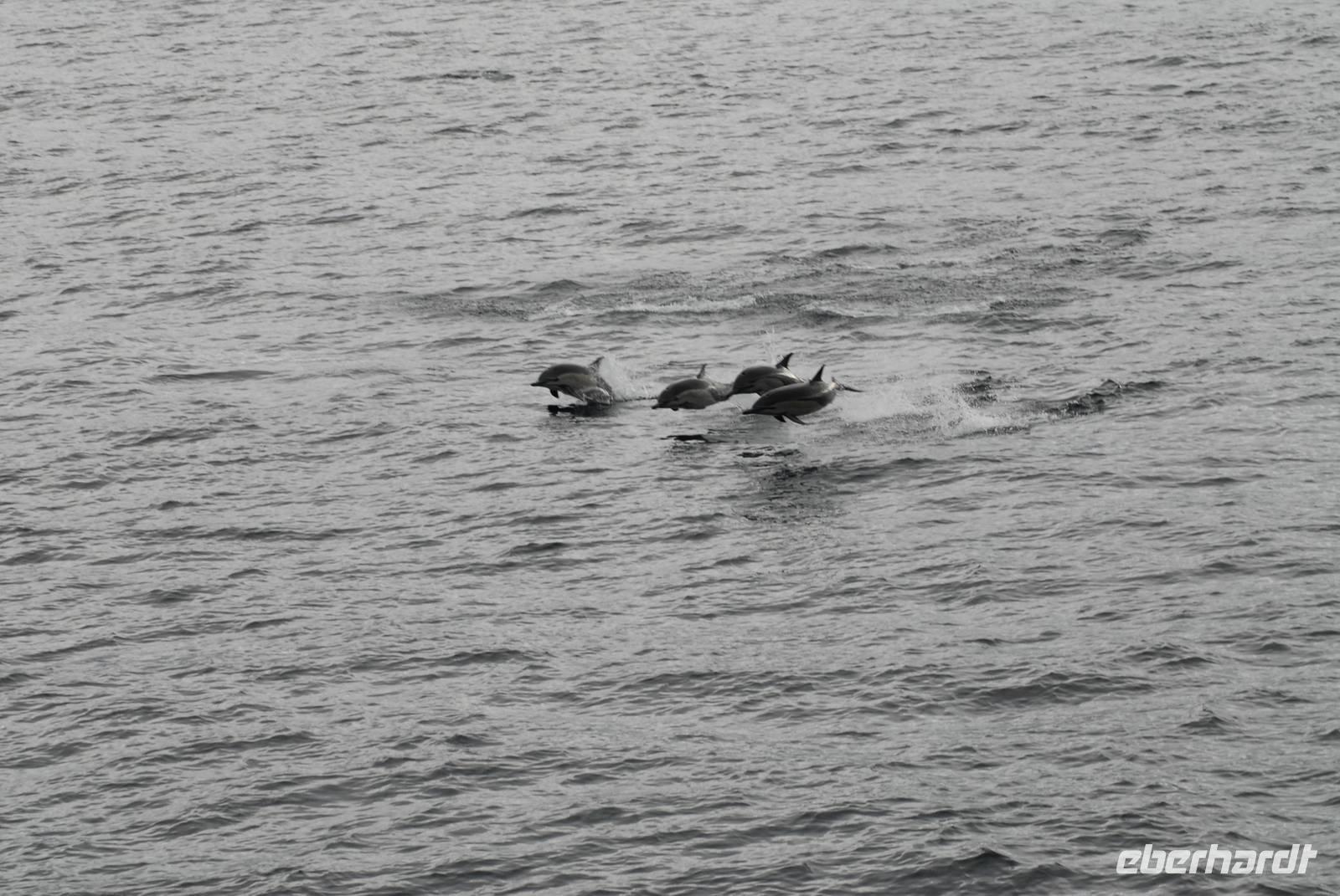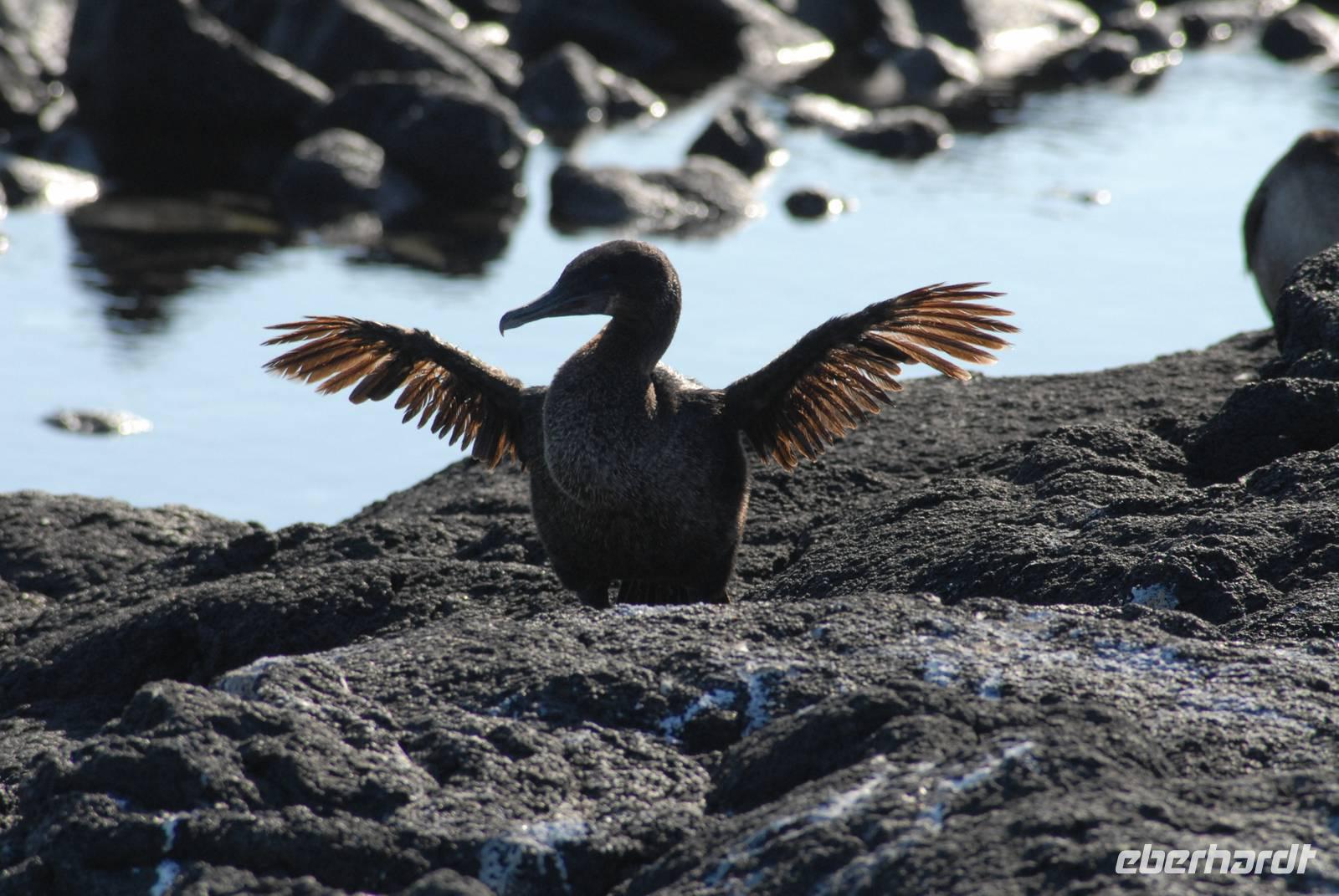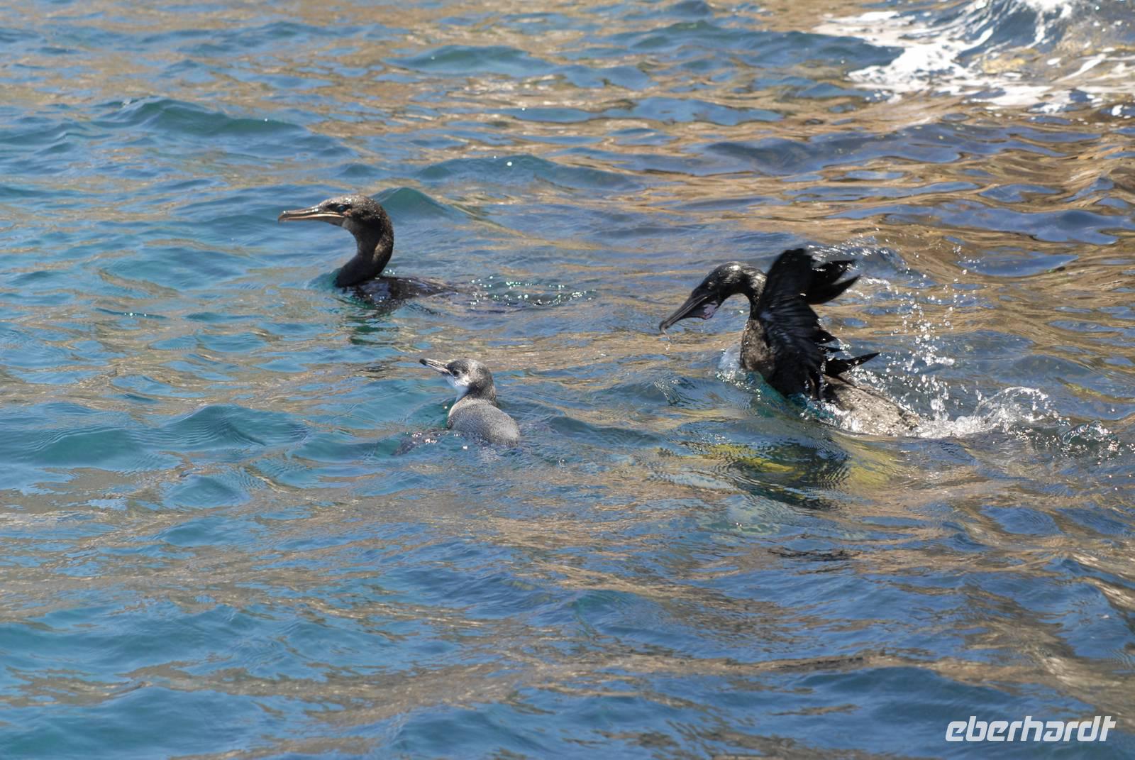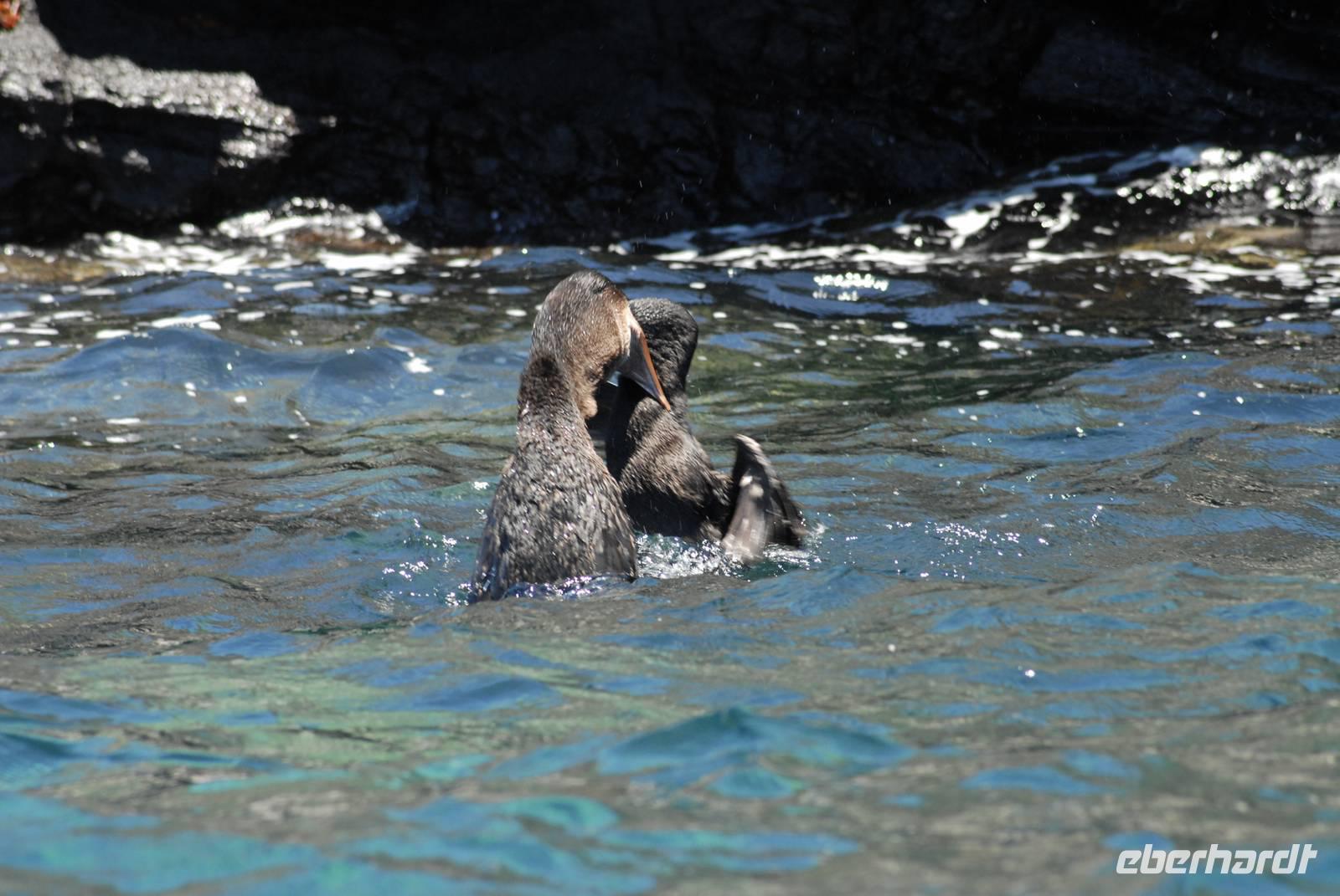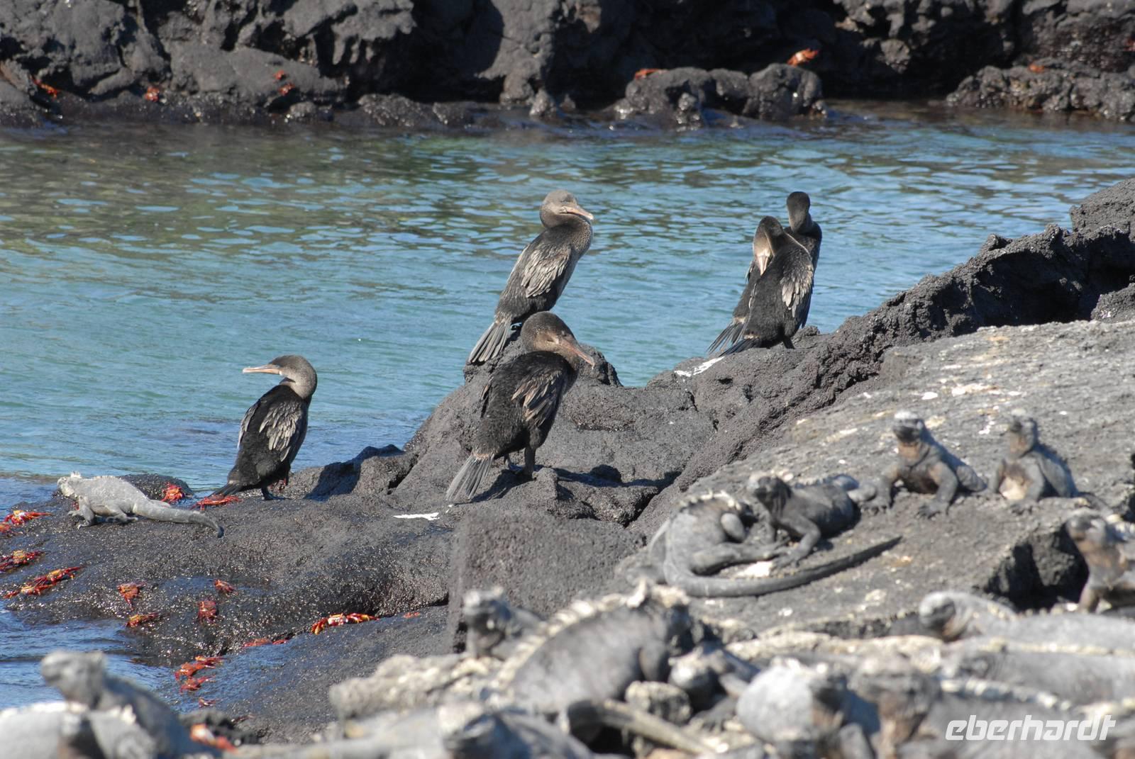 Früh sind wir nach der langen und teil unruhigen Überfahrt vor Fernandina, wo wir auf einen Trupp von gut 200 Spinner Delphinen treffen, die beim Jagen sind. Dann fahren wir in die Tagusbucht und machen uns an den Aufstieg zum Darwinkrater. Am Anlandepunkt sind zwei Nester mit Jungvögeln des flugunfähigen Kormorans. Die Wanderung ist nicht lang, aber sehr gut. Zurück an Bord erfolgt wieder die Zweiteilung: Einige schnorcheln, die anderen fahren mit der Panga entlang der Küste - beides sehr erfolgreich.