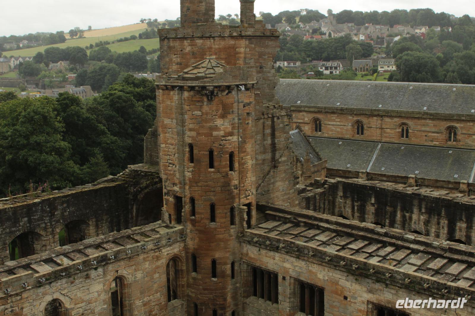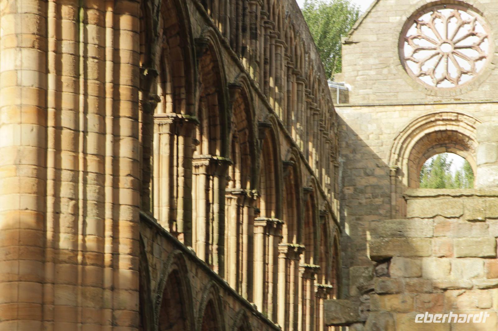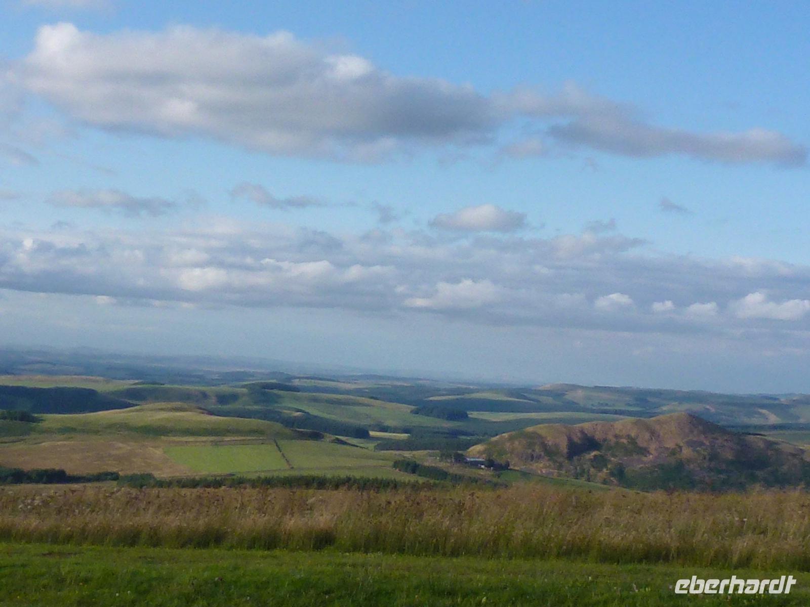 Nach einem letzten schottischen Frühstück und der Sonne als Begleiter, machten wir uns auf den Weg nach Süden. Aber zwei Abstecher machten wir trotzdem noch. Vorbei an Roslin, Dryburgh Abbey, dem Leader Viaduct und dem Waterloo Monument, machten wir in Jedburgh genau unterhalb der Abtei-Ruine, unseren ersten Aufenthalt. Dort gab es dann unsere Kaffeepause und diese wurde noch einmal mit Shortbread versüsst, bevor wir die schottischen Lande verließen. Bei Carters Bar hielten wir noch einmal an, um einen letzten Blick auf Schottland zu werfen, und uns daran zu erinnern, dass wir vor 7 Tagen auch hier standen, als wir nach Schottland hineingefahren sind. Als Abschied spielte noch einmal ein Backpiper auf.