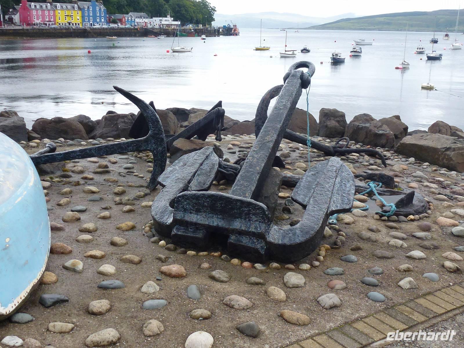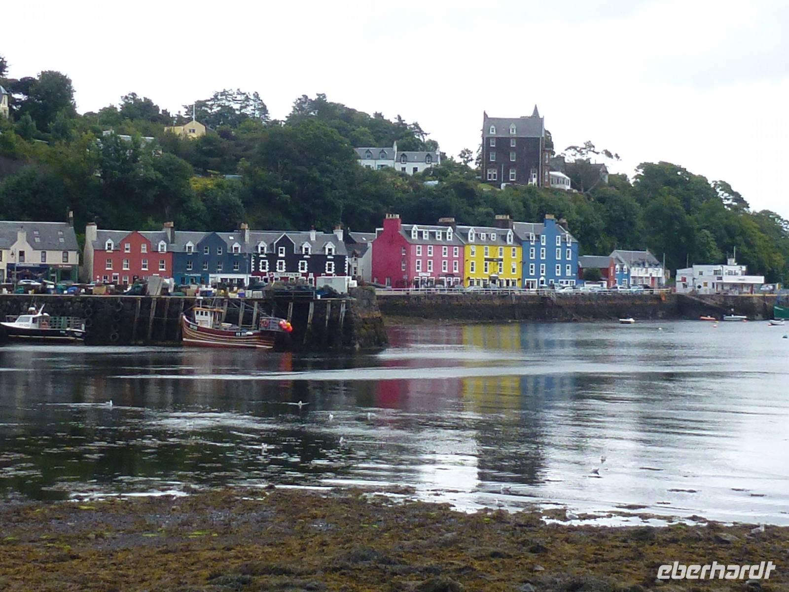 Beim Ablegen der Fähre klarte sich der Himmel wieder auf und sie Sonne schaute durch. Die Fährüberfahrt war kurz und so erreichten wir nach 45 min unser Ziel Craignure. Von dort ging es Richtung Duart Castle. Ein wunderschönes kleines Castle auf einer Felserhebung am Meer. Angekommen machte ich mich auf den Weg die Gruppe anzumelden. Was jetzt kommt hatte keiner erwartet. Eigentlich war die Gruppe angemeldet, um das Castle auf eigene Faust zu erkunden. Aber am Ticketschalter empfing mich schon ein kleiner älterer Herr mit zwei Löchern im Pullover. Er sagte nur zu mir, er wollte die Gruppe bitten sich im Innenhof zu versammeln um kurz was zu sagen. Wir dachten uns dann nur, gut wird vielleicht um die Sicherheit gehen. Gesagt getan, sammelte ich meine Schäfchen ein und wir warteten. Er begrüßte uns und freute sich das wir da sind. Dann stellte er sich vor. Es war Sir Lachlan Hector Charles Maclean of Duart and Morvern Bt, CVO, Deputy Lieutenant of Argyll and Bute, 28th Clan Chief and 12th Baronet of Movern. Wir waren baff! Wir haben ja mit allen gerechnet, aber nicht damit, dass der Clanchief uns höchstpersönlich durch sein Anwesen führt. Ich kann mit gutem Gewissen behaupten, dass dies eines der Highlights der Reise war. Wir beschlossen dann alle gemeinsam, den Aufenthalt dort zu verlängern und dafür Tobermory zu verkürzen. Ach ja, und hier gab mir der Clanchief den Tipp, mir doch einen Hütehund für meine Gruppen anzuschaffen. Wenn das mal kein Zeichen war. Nachdem wir noch ein tolles Gruppenfoto mit dem Clanchief gemacht haben, gab es am Bus noch Kaffee und Donuts, bevor die Reise weiter nach Tobermorey ging, ein Planfischerdorf aus dem 18. Jhd. Unser Besuch in Tobermorey gestaltete sich sehr feucht, da es angefangen hatte zu regnen. Aber man konnte nichts desto trotz die hübschen bunten Häuser an der Hafenpromenade sehen und anscheinend wurde auch ein Wal vor der Küste gesichtet, da Einheimische darüber geredet hatten. Und schon ging es zurück Richtung Fähre und Hotel. Der Abend wurde nach unserem leckeren Abendessen mit einem Pint Bier, Cider oder Whisky beendet (der Whisky natürlich nicht als Pint).