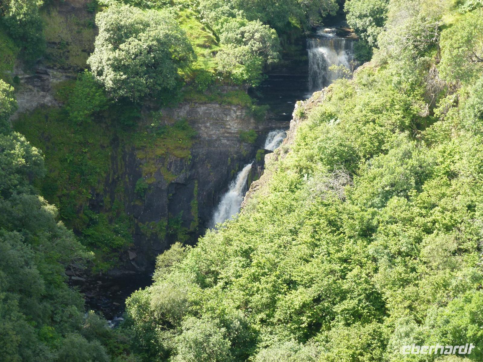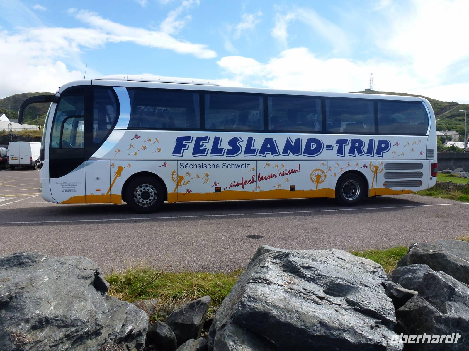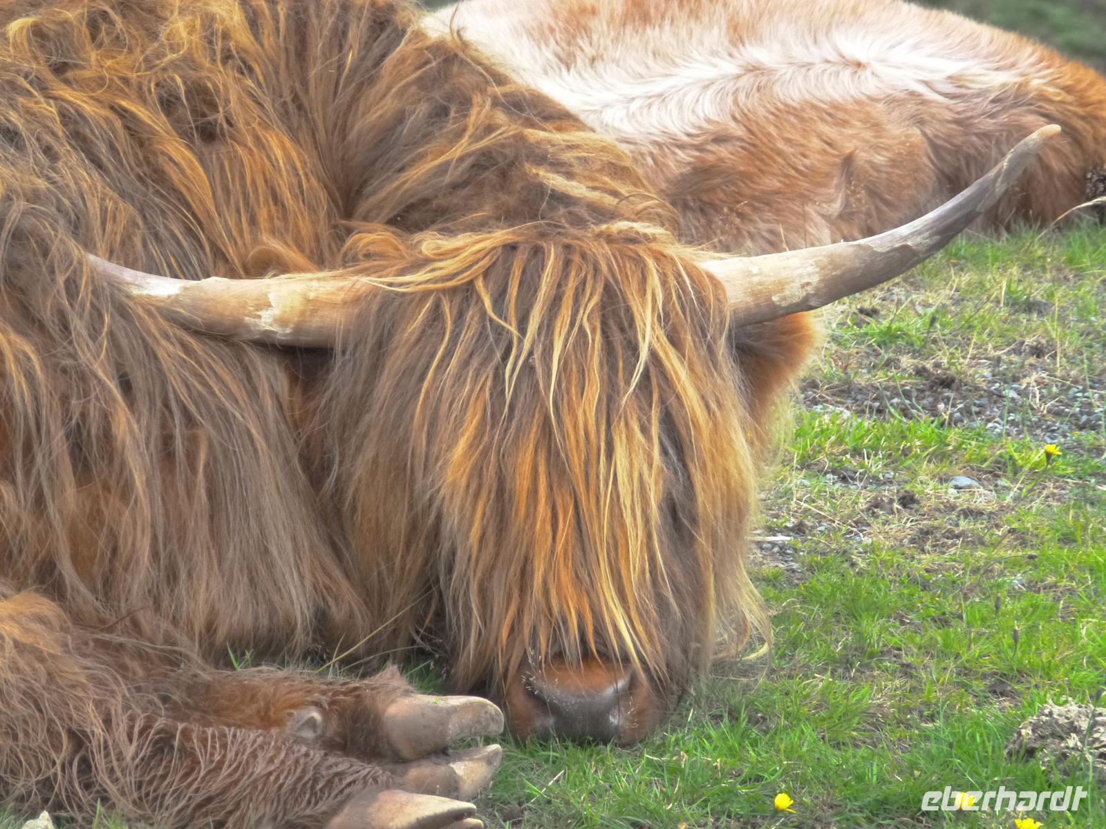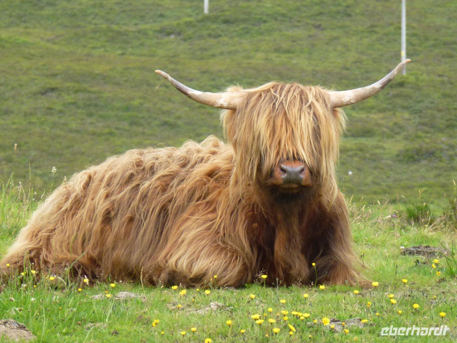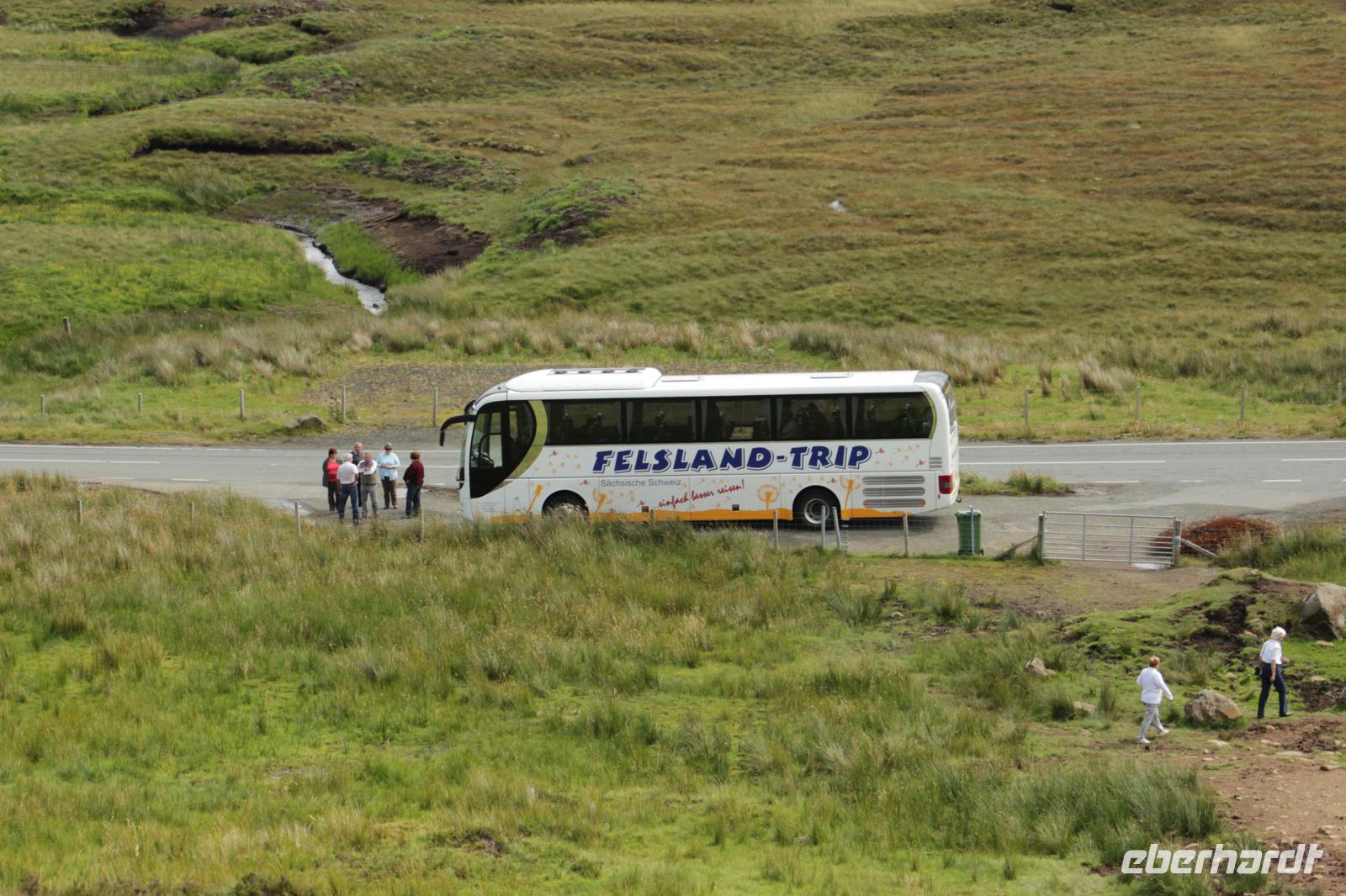 Diesmal verließen wir unser Hotel sehr früh. Bereits um 7:00 Uhr machten wir uns ausgerüstet mit Lunchpaket wieder auf nach Mallaig. Um dort die Fähre zu nehmen die uns auf die „Insel des Nebels" brachte. Nach Skye. Aber auf den Weg dorthin ließen wir es uns nicht nehmen noch einen Kaffestopp bei den Prince's Cairn einzulegen. Und auch langsam kam die Sonne heraus. Wenn das mal kein gutes Zeichen war. Am Fährhafen angekommen, hieß es noch einmal etwas warten und dann legte die Fähre auch schon ab. Die Fährüberfahrt dauerte nur eine halbe Stunde und wir fuhren erst einmal Richtung Portree. Auf dem Weg dorthin wurde der Wunsch des Busses erneut erfüllt. Einen Tag vorher wurde angefragt, ob es die Möglichkeit gibt, Fotos der Galloway Rinder zu machen. Dies ist nicht einfach zu erfüllen. Aber wieder einmal war uns Fortuna holt. Auf dem Weg nach Portree sahen wir schon von weiten plötzlich an der Straße eine Menge Autos. Aus Erfahrung weiß ich, dass hier nichts zu sehen ist, außer manchmal Schaffe. Also fuhren wir langsamer und siehe da... wie auf dem Präsentierteller lag dort ein Galloway Rind, direkt am Zaun und hat sich in aller Ruhe von den unzähligen Leuten fotografieren lassen. Und viele weitere standen auf der Weide. Nach diesem tierischem Erlebnis, machten wir einen kurzen Aufenthalt in Portree um anschließend weiter in den Norden zu fahren. Mittlerweile strahlte eine Sonne vom blauen Himmel. Und somit konnten wir super den Old Man of Storr fotografieren. Unsere Mittagspause verbrachten wir an den schönsten Flecken der Insel, an den Lealt Falls mit der Mini-Ausgabe des Old Man of Storr. Nach der stärkenden Mahlzeit und wunderschönen Fotos fuhren wir weiter Richtung Kilt Rock Waterfalls. Hier hieß es dann auch schon umdrehen, um den Besuch des Armadale Castles nichts zu verpassen. Dort angekommen konnte sich jeder frei bewegen und umschauen, und erkunden was von dem alten Castle der Lords of the Isles noch übrig war. Ich glaub am besten kam der Gärtner auf dem Rasenmäher an (das ist ein Insider). Mit der letzten Fähre verließen wir die Insel, aber wir verabschiedeten uns noch nicht. Da unser Hotel nur 2 Fahrminuten entfernt war, war auch das heiß ersehnte Abendessen nicht mehr fern. Und so ließen wir wieder einen tollen Tag ausklingen.
