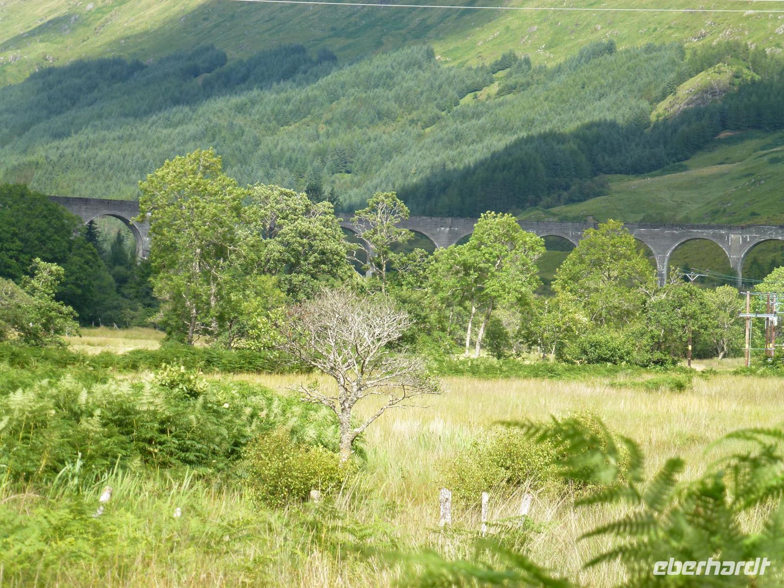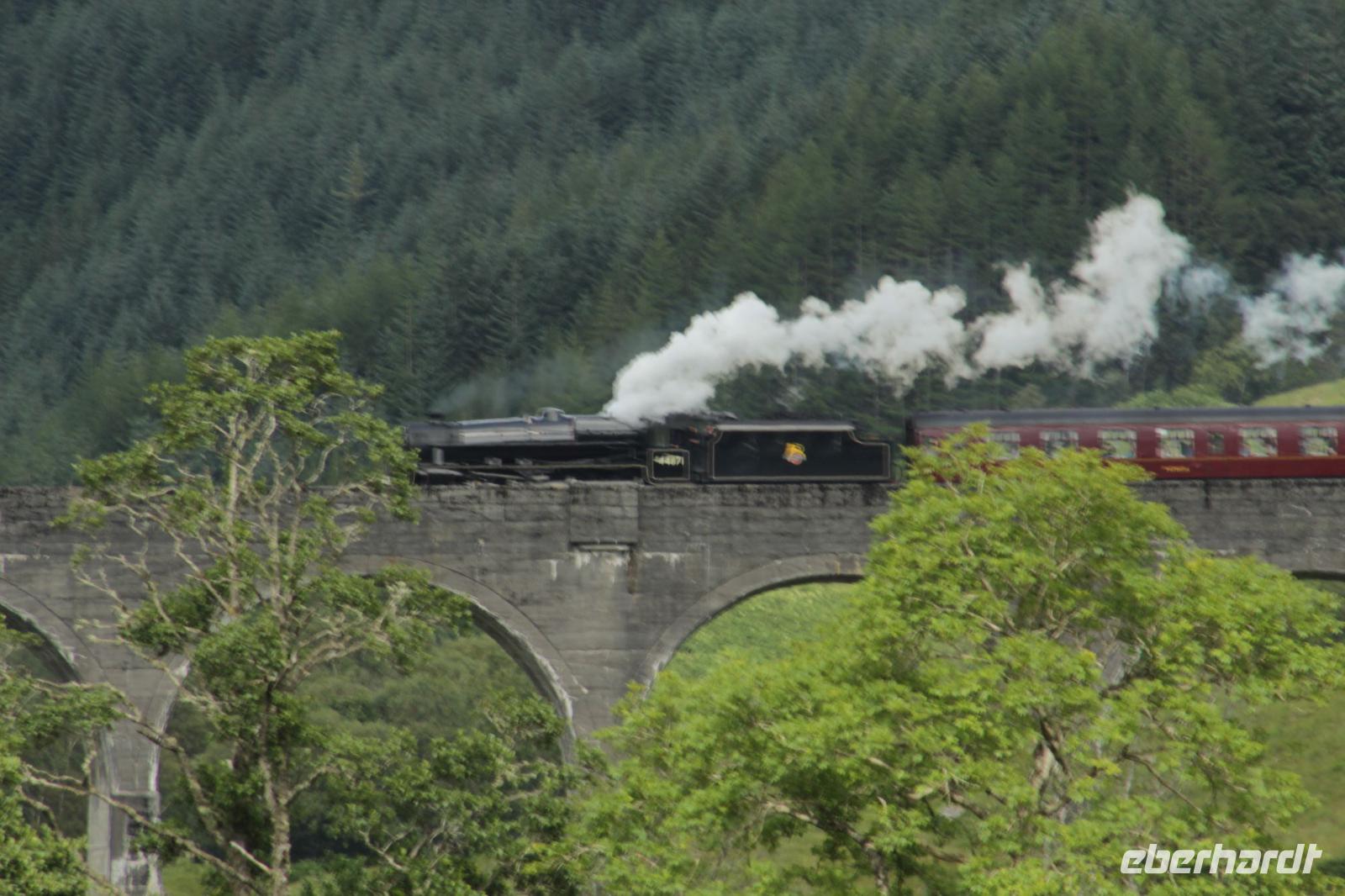 Und wieder brach ein Tag voller Überraschungen an. Das Wetter war schön und wir verließen nach dem Frühstück Oban, um weiter gen Norden zu fahren. Unser Ziel heute war Fort William und der Jacobite Steam Train. Dieser stand schon dampfend im Bahnhof als wir ankamen. Da wir früh genug da waren, hatten wir noch genug Zeit um Fotos zu schießen und unseren Wagen in Beschlag zu nehmen. Und dann hieß es „tuff,tuff,tuff..." und die Fahrt ging los. Vorbei an wunderschöner Natur, Richtung Mallaig passierten wir erneut kleine Bahnhöfe, aber diesmal waren es Highland - Bahnhöfe. Nach einem 15 Minuten Stopp in Glenfinnan ging es über die bekannte Harry Potter-Brücke, dem sogenannten Viadukt und am Glenfinnan Monument vorbei. Dort wo einst Bonnie Prince Charles seine Fahne hisste und den zweiten Jakobitenaufstand begann. In Mallaig angekommen, war noch genug Zeit sich zu verköstigen und umzuschauen, bevor wir den Weg zurück nach Fort William, aber diesmal mit dem Bus, antraten. Unser erster Stopp war das Glenfinnan Monument /Loch Shiel (der Harry Potter See)/ das Viadukt. Und Fortuna war uns wieder einmal holt. Wir waren rechtzeitig da um alle beiden Nachmittags Jacobite Steam Trains zu sehen, als sie über den Viadukt gefahren sind. Einige aus der Gruppe hatten sich dafür auf der nicht leicht zu erreichenden Aussichtsplattform positioniert. War natürlich wieder ein super Highlight. Und ich bin jetzt mal etwas gemein. Wir waren auch der einzige Bus der rechtzeitig da war. Nachdem beide Züge durch waren, kamen erst die anderen Busse an .