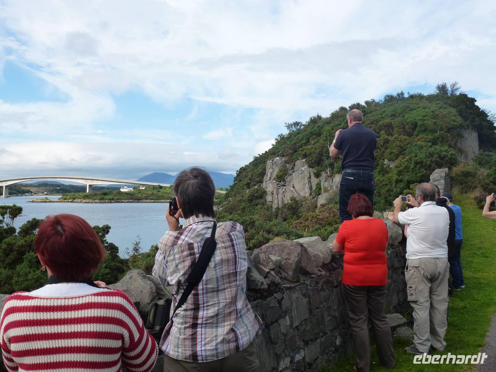 Diesmal mussten wir nicht so früh los...ausser unserem Busfahrer, liefen wir alle zu unseren Ziel... erneut die Fähre nach Skye... Das Wetter war wieder klasse und wir hatten auch Bombenstimmung. Mit der Fähre setzten wir erneut auf die Insel über. Nach einen kurzen Abstecher an eine echte schottische Tankstelle, ging es Richtung Kyle of Lochalsh und somit über die Skye Bridge. Dort machten wir einen kurzen Fotostopp und weiter ging es nach Eilean Donan Castle, für einen tollen Fotostopp und um leckeren Kaffee mit Shortbread zu genießen. Hier noch einmal etwas erwähnt. Eilean Donan Castle ist nicht der Filmschauplatz von Braveheart, sondern von Highlander! Unser nächster Stopp waren die Five Sisters und die kleine Legende dazu. Durch Glen Shiel wurden wir mit der Legende des Rob Roys und dem Jakobitenaufstand von 1715 konfrontiert. Unser Mittagessen, nahmen wir am Loch Garry ein, von wo man einen fantastischen Blick über die Highlands hatte. Für musikalische Untermalung unseres Picknicks, sorgte ein Dudelsackspieler. Und weiter ging die Reise zum Commando Memorial von wo aus man einen tollen Blick zum Ben Nevis hat, wenn dieser sich nicht gerade eine Zuckerkrone aufgesetzt hätte. Nun ja, unserer guten Laune machte das nichts. Aber wo wir als nächstes hinkamen wird nicht umsonst das „Tal der Tränen" genannt. Wir waren nun in Glen Coe mit seiner traurigen Geschichte. Es ist nicht die Anzahl der Opfer, was dieses Ereignis so traurig und unvergessen macht. Es ist die Hinterlistigkeit und der Missbrauch des Vertrauens! Aber was einfach atemberaubend ist, ist die wunderschöne Natur und die Berge, die man dort genießen kann. Nach diesem Aufenthalt, bewegten wir uns langsam aber sicher weiter Süden. Und somit ließen wir auch die Highlands mit ihrer rauen Schönheit hinter uns. Vorbei an Stirling Castle und den Wallace Monument fuhren wir zu unserem Hotel in Bannockburn. Wir übernachteten dort, wo einst King Robert the Bruce die Engländer aus dem Land gefegt hat. Allister MacDonald hat das sehr hübsch besungen. Nach einem reichhaltigen Abendessen, ließ man den Abend noch schön ausklingen.