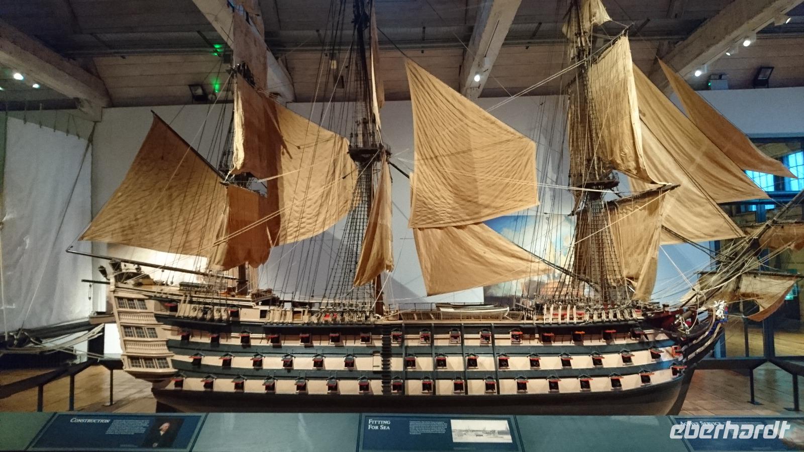 „Don't worry, be happy", so klang es am frühen Morgen aus den Lautsprechern in unseren Kabinen und über die darin enthaltene TV-Anlage konnten wir per Außenbordkamera mitverfolgen, dass wir uns bereits dem Hafen von Harwich näherten. Also ging es schon ab zum Frühstück an Bord und wenig später gingen wir gemeinsam zum Bus, mit dem wir gleich nach dem Anlegen das Schiff verließen. Eine kurze Passkontrolle im Fährhafen erinnerte uns daran, dass das Vereinigte Königreich nicht dem Schengen Abkommen beitrat. Dann verließen wir den Hafen und fuhren, von nun an mit britischer Zeit und auf der linken Straßenseite, über schmale Straßen gen Colchester. Es war ja noch früh am Morgen, jedoch der Park des alten normannischen, einst auf die Grundmauern eines römischen Tempels gebauten Castle im Zielort hatte bereits geöffnet, nach und nach wurden auch die Türen der kleinen Geschäfte im Ort aufgeschlossen und gegen 10:00 Uhr bereits trafen wir uns wieder mit Stefan am Castle, um das darin enthaltene und sehr informative Museum zu besuchen. Begeistert waren wir von der alten Bauweise des Gebäudes. Später ging es bereits weiter gen London. Doch manchmal passieren Dinge, die man nicht voraussehen kann. Ob es nun der LKW war, der unseren Bus in einem der vielen Kreisverkehre viel zu schnell überholte oder ob Frank, unser Busfahrer, aus Vorsicht, mit dem Bus links nicht an die Leitplanken zu geraten, zu weit rechts fuhr, können wir sicher nicht mehr erschöpfend klären. Es krachte und der rechte Außenspiegel unseres Busses der Firma Alex Touristik lag auf der Straße. Abgebrochen. Schnell nahmen wir gemeinsam mit dem LKW-Fahrer den Schaden auf und Frank kletterte, gehalten von Stefan und einigen Reisegästen, hinauf und montierte den Ersatzspiegel, der zwar nicht ganz so viel Komfort bietet, wie der Originalspiegel eines Reisebusses, uns aber von nun an ausreichen und Frank alles zeigen musste. Stefan gab inzwischen die Mittagswürstchen aus, dann ging es weiter gen Chatham bei London. In diesen Dockyards wurden die wichtigsten Schiffe der Britischen Marine gebaut, unter anderem auch die HMS Victory, Lord Admiral Nelsons Flaggschiff, welches heute in Portsmouth zu besichtigen ist. Sogar ein kleines Standbild von Admiral de Ruyter gab es zu sehen, dem Schiffsführer der Niederlande, unter dessen Kommando die holländische Flotte mehrfach in die Themse einfuhr und auch in Chatham schweren Schaden anrichteten. Die Dockyards zu besichtigen, war sehr interessant, weil man schon anhand der Größe der dortigen Hallen, aber auch durch die vielen Schiffsmodelle einen Eindruck von der einstigen Seemacht Englands und des Vereinigten Königreiches gewinnen konnte. Später fuhren wir weiter in die Innenstadt und zu unserem innenstadtnahen, direkt an der Dockland Light Railway gelegenen Hotel, wo wir zum Abendessen unsere gut eingetroffenen Fluggäste begrüßten und im Hotel-Pub ein erstes Dinner auf Britischem Boden einnahmen. Danach ließen wir entweder den Tag im Hotel oder mit einer privaten Erkundung der Britischen Hauptstadt ausklingen.