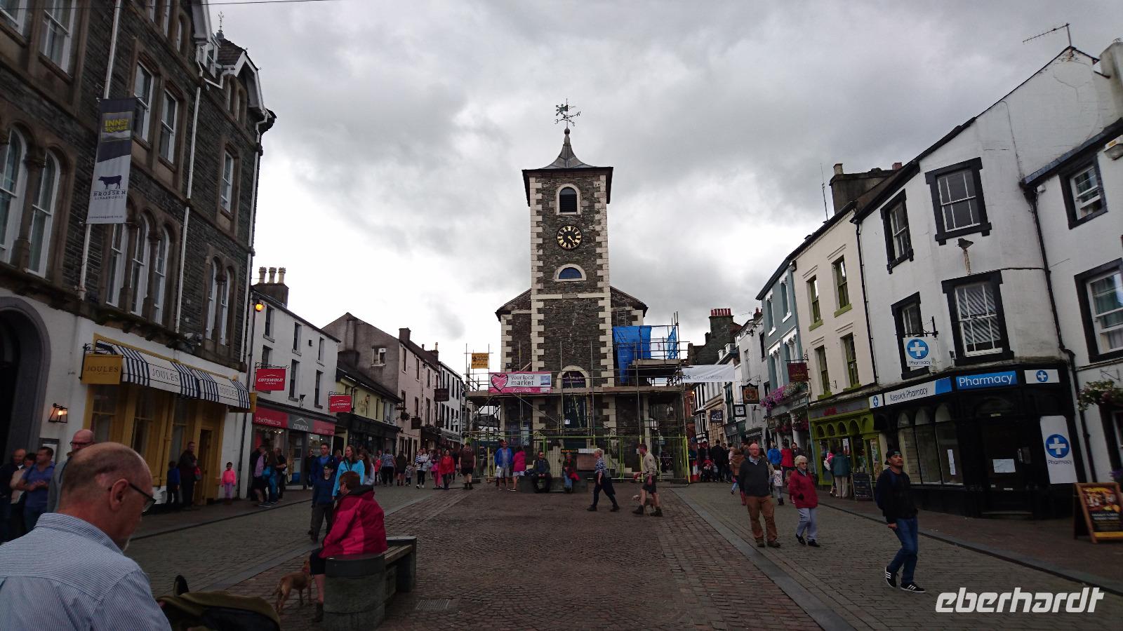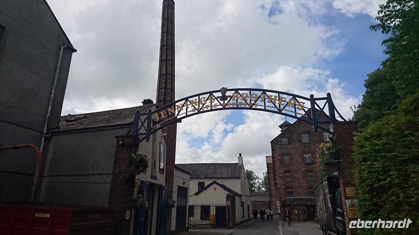 Der Lakeland-Distrikt wird oft erwähnt. Besonders schöne Landschaften, während des Endes der letzten Eiszeit geschaffene tief eingeschnittene Täler und Seen, viel Grün und klares Wasser. Das wollten wir heute erleben. Wie kann man solches am besten? Indem man auf einem der Seen, gleich auch noch dem größten der Region, also dem Ullswater, eine Dampferfahrt unternimmt. Alte Passagier-, Ladegut- und Postdampfer, die die Orte am See mit den nahen Bleiminen verbanden, gehören heute restauriert zur Flotte auf dem See und wir fuhren fast die gesamte Länge des Sees von rd. 14,5 km von Pooley Bridge bis nach Glenridding entlang. Unser Bus erwartete uns schon am Anleger und mit ihm ging es noch einmal den halben See zurück, was uns noch einmal mehr herrliche Blicke offenbarte. Eine schöne Landschaft! Später kamen wir nach Keswick, einem kleinen Ort mit einer sehr alten Versammlungshalle am Marktplatz. Etwas Freizeit blieb uns hier für einen Imbiss und einen Spaziergang. Stefan bot jedoch auch wieder Würstchen im Bus an, denn wir benötigten eine gute Grundlage. Machten wir bei der gar nicht typischen Destillery in den Cotswolds schlechte Erfahrungen im Umgang mit Kunden, so erlebten wir nun in der Jennings Brauerei in Cockermouth das genaue Gegenteil. Unser Führer war so bei der Sache und lebte für die Brauerei und seine Aufgabe, Stefan übersetzte mit viel Witz und eigenem Hintergrundwissen die Führung. Die anschließende Verkostung, wo man nicht nur einen Tropfen der gerade fünf hergestellten Ale-Sorten der Brauerei kosten durfte, sondern nach Herzenslust und Gaumenfreude nachgeschenkt bekam, war ein Highlight auf unserer Zeitreise, auf der wir nun Land und Leute, Essen, Gebäude und Ale kennenlernten. Leider musste uns Stefan dann auf der Fahrt zum Hotel im Bade- und Vergnügungsort Blackpool schon wichtige Informationen für die morgen beginnende Rückreise geben. Ach, sollte es schon so schnell zu Ende gehen? Na, das war erst morgen. Noch einmal Prost und dann ab nach Blackpool. Unser Hotel war fast direkt am Wasser und auch wenn es von außen etwas abgewohnt aussah, waren die Zimmer wunderbar in Ordnung und das Essen schmeckte. Am Abend unternahmen viele von uns noch einen Ausflug entlang des Wassers bis zum Konkurrenten des Eiffelturmes, dem Blackpool Tower, ehe wir uns noch einmal auf englischem Boden weich betteten.
